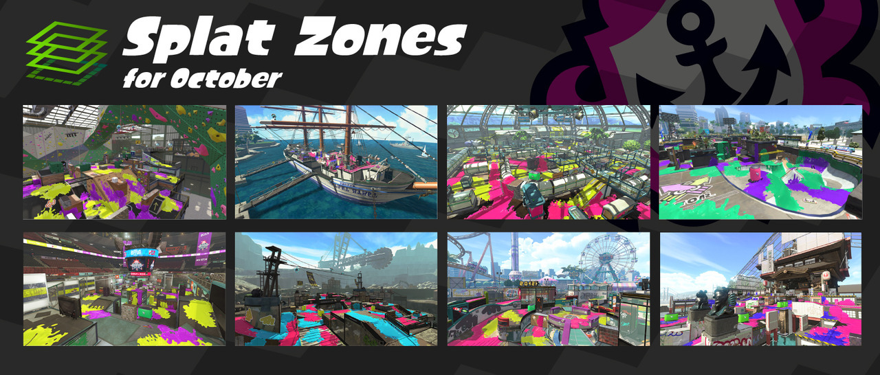 Pour rappel, les stages pour chaque mode sont maintenant choisis à partir d’une sélection de 8 terrains. Au lieu de 20 stages choisis au hasard, on a 8 terrains mensuels pour le mode Mission Bazookarpe, 8 pour expédition risquée, etc. La sélection de stages est modifiée une fois par mois, en même temps que la réinitialisation du rang X. Bien évidemment, ce changement ne concerne pas les guerres de territoire, ni les matchs de Ligue, où tous les stages sont disponibles dans la rotation des terrains. Voici la rotation des stages du mois d’octobre :