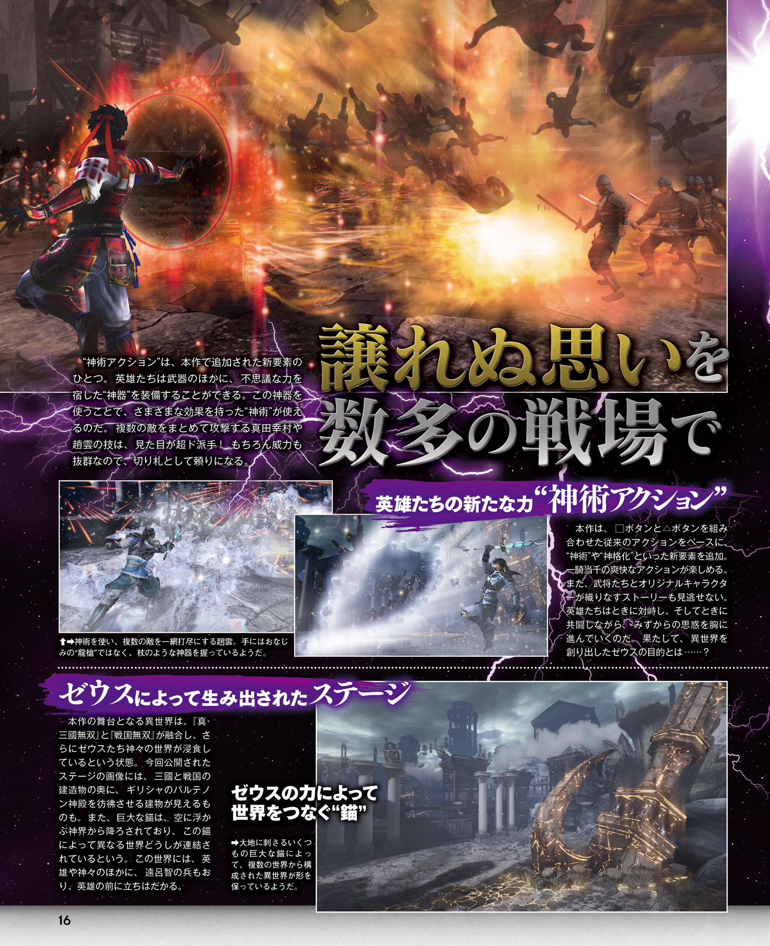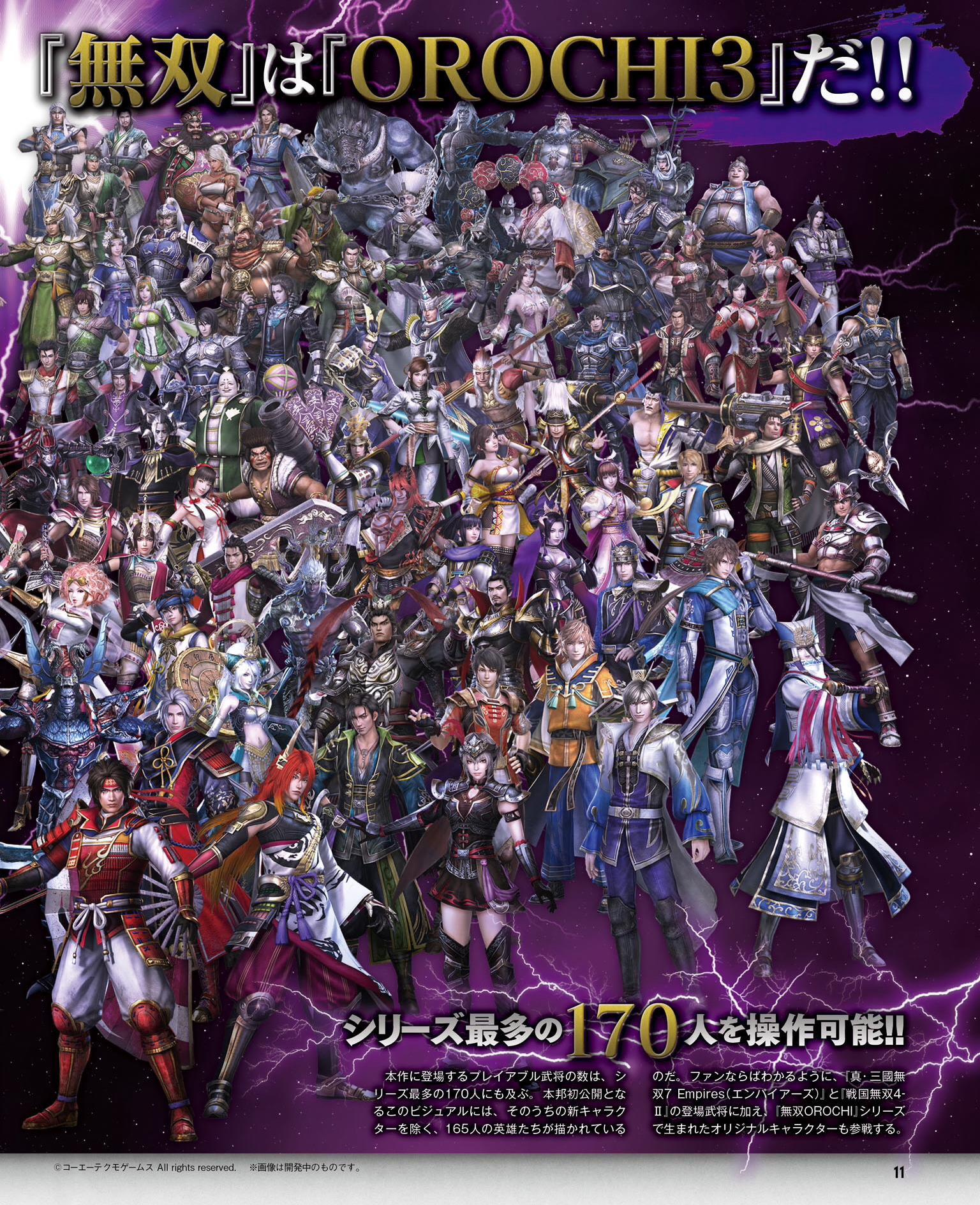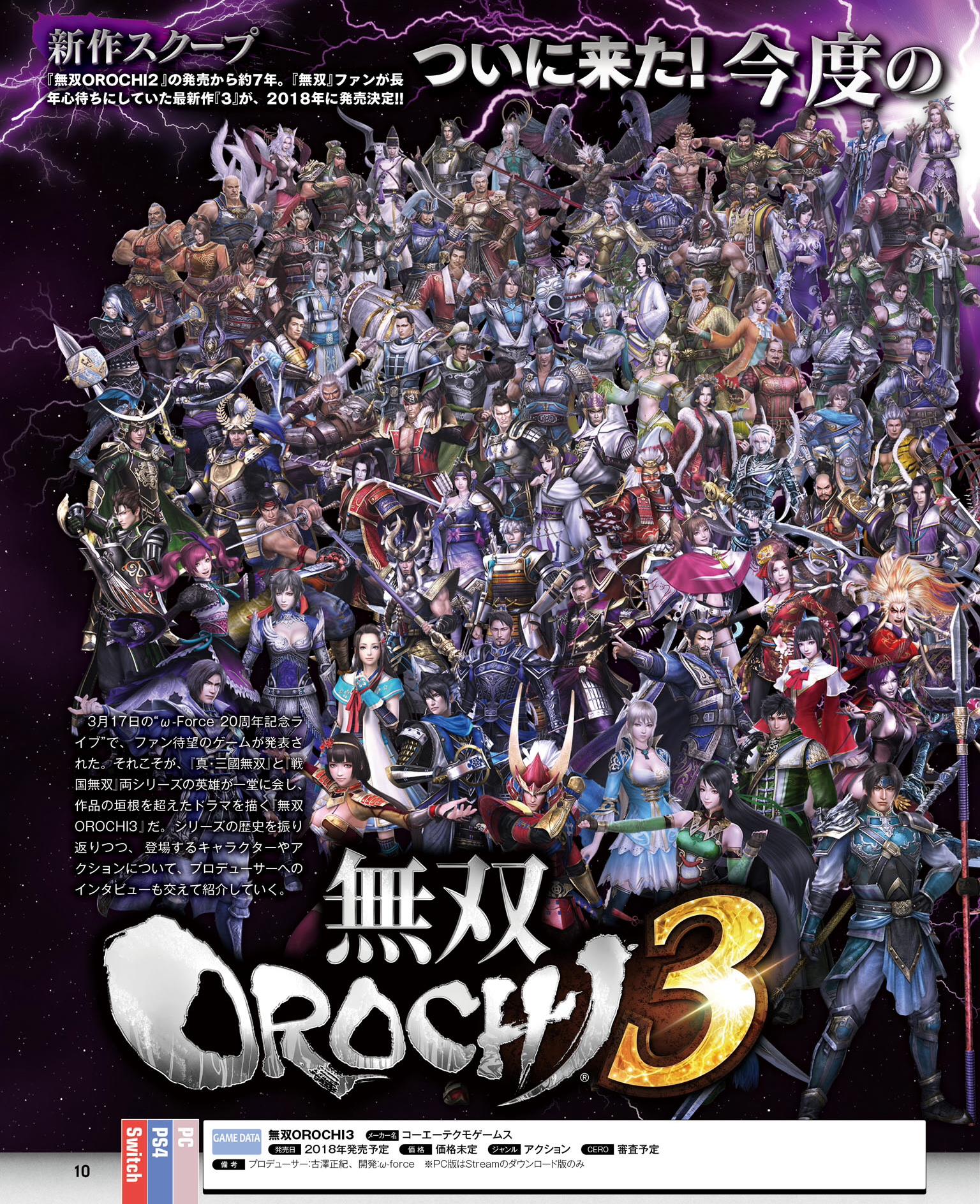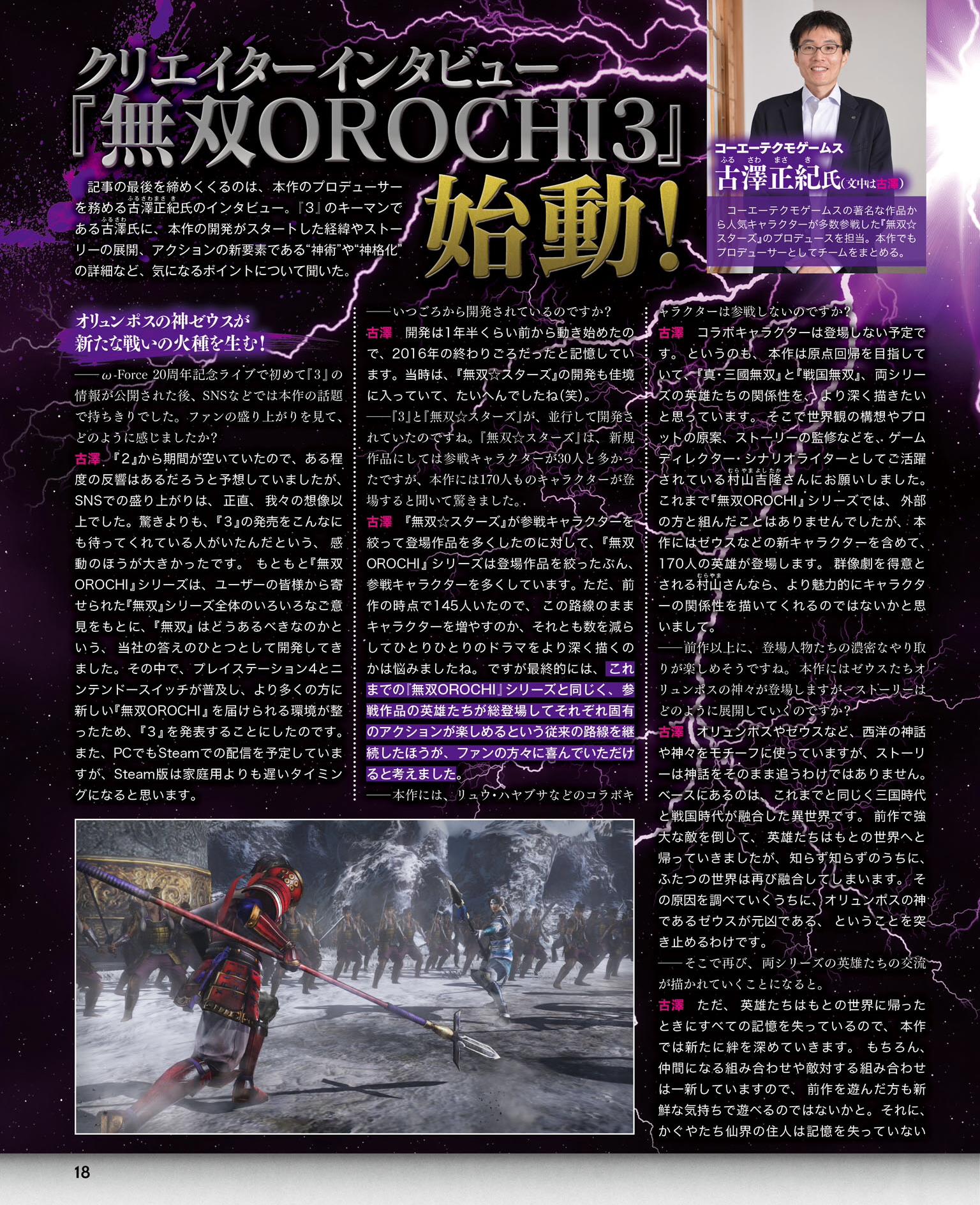 Warriors Orochi 4 contiendra pas moins de 170 personnages jouables, un record pour la série. Plusieurs nouveautés et améliorations seront également de la partie, dont un nouveau type d’attaque nommé « Divine Art Action » qui ajoutera de nouveaux éléments comme les Divine Arts et la Déification. Une interview du producteur Masaki Furusawa nous apprend que la version PC sortira après les versions Switch et PS4. De plus, parmi les 170 personnages jouables, cinq sont inédits et seront dévoilés plus tard par Koei Tecmo et Omega Force. Cette fois-ci, l’antagoniste est Zeus, et nous imaginons que les cinq nouveaux personnages seront sélectionnés à partir des divinités olympiennes, comme Athéna et Poséidon. Enfin, nous avons la confirmation que les personnages nés de collaborations comme Ryu Hayabusa n’apparaîtront pas dans le jeu car les développeurs souhaitent revenir aux racines de la série et représenter la relation entre les périodes des Royaumes combattants et Sengoku.