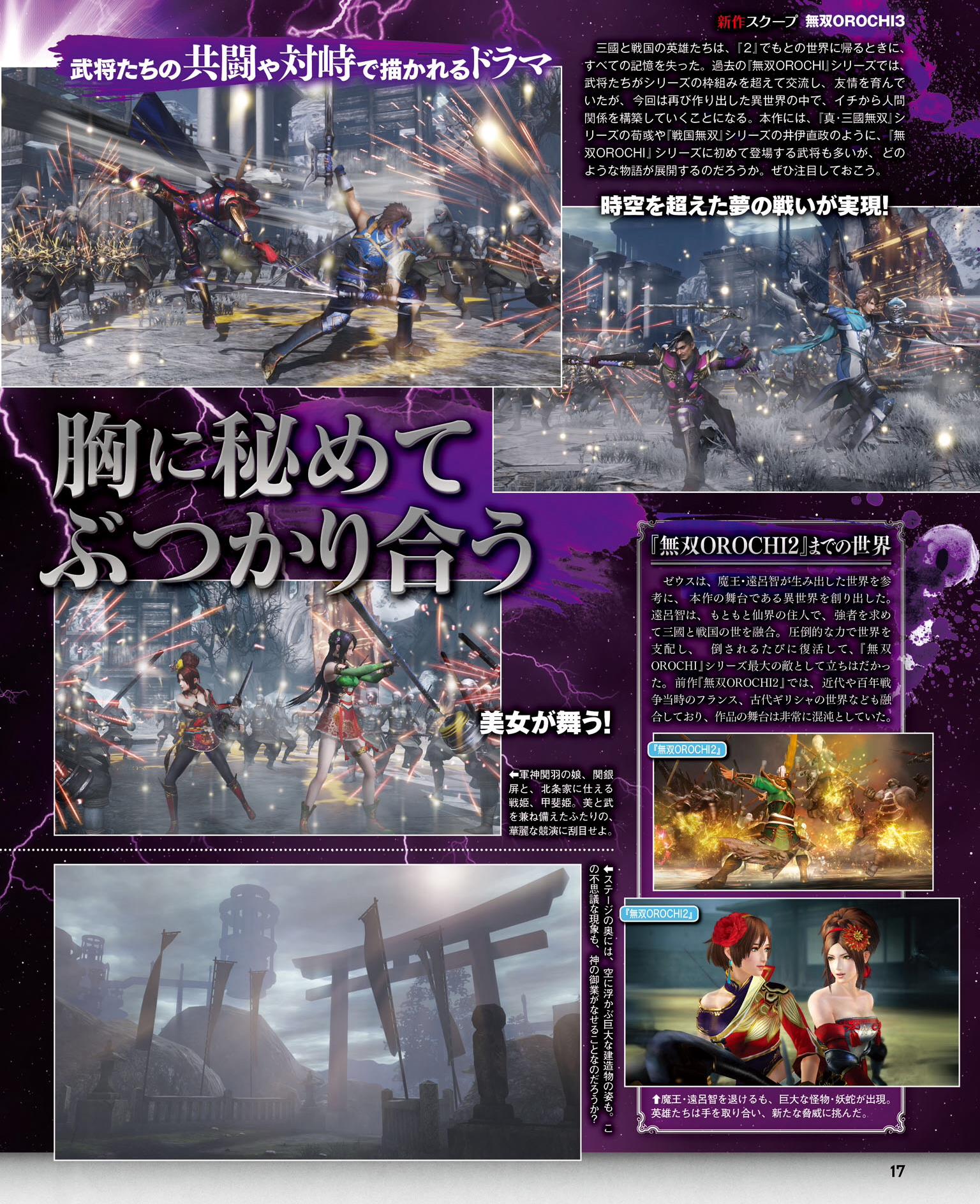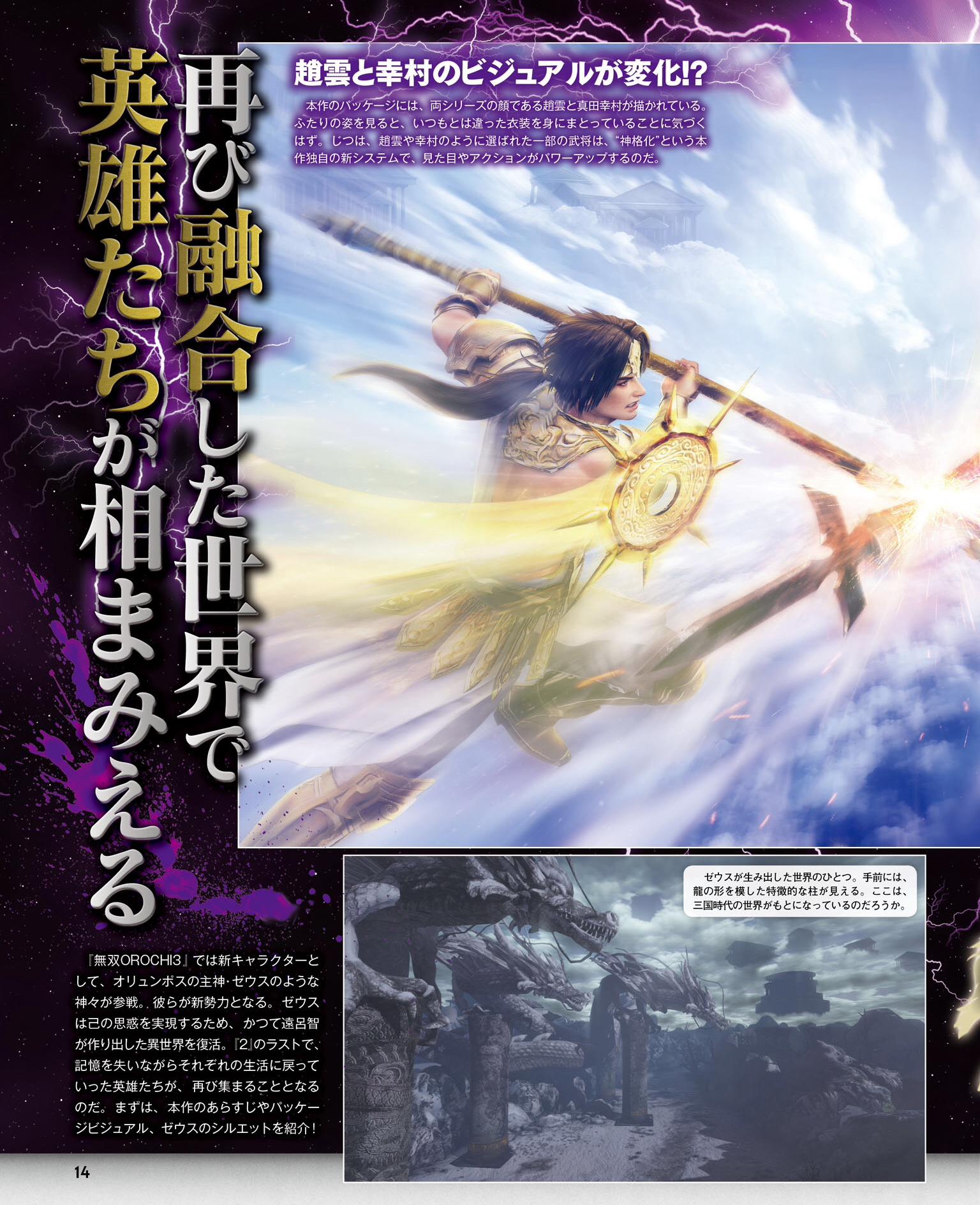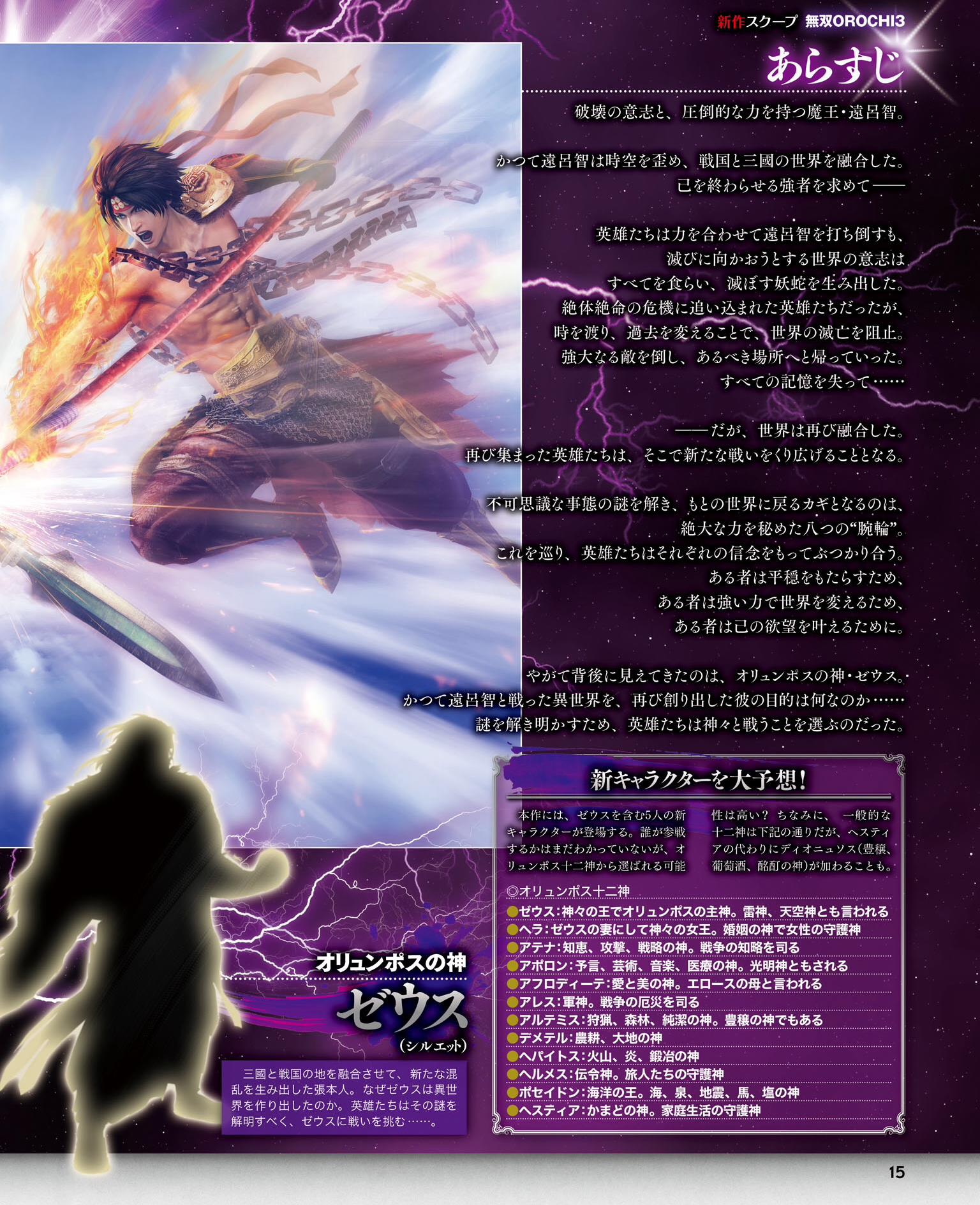 Mise à jour : de nouvelles informations ont été dévoilées via Ryokutya2089. Concernant le scénario, nous apprenons que les héros qui ont vaincu Orochi sont retournés chez eux, et tous les souvenirs de leur bataille ont été perdus. Cependant, leurs mondes vont se réunir encore une fois. Pour retourner à nouveau chez eux, les personnages devront retrouver les huit bracelets. Il semblerait que Zeus soit derrière tout cela, son but étant inconnu. Concernant Orochi, il sera maintenant un personnage clé, et Orochi et True Orochi existeront simultanément pour une raison qui reste encore inconnue. Les personnages jouables seront issus de Dynasty Warriors 8 : Empires et Samurai Warriors 4-II, tandis que tous les autres seront inédits ou créés spécialement pour la série Warriors Orochi.