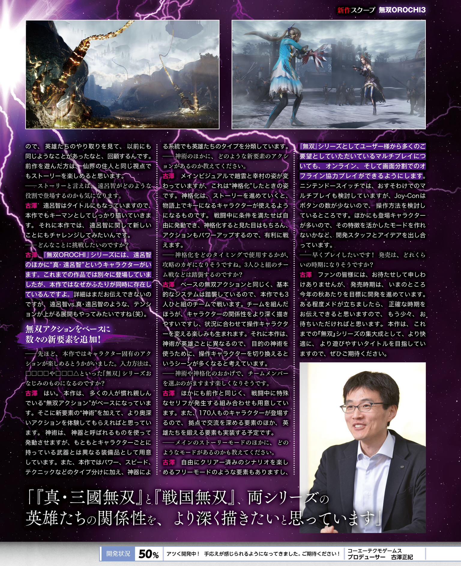 Au niveau des contrôles, les fameux Carré + Carré et Carré + Carré + Triangle seront de retour sur PS4. En participant à l’histoire « Déification », les personnages clés deviendront jouables, et en remplissant certaines conditions au cours des combats, leur apparence et leurs actions seront modifiées. En parlant des combats, il faut savoir que le jeu utilisera un système de groupe avec trois personnages et que des éléments comme un mode libre seront inclus. Les développeurs réfléchissent aussi à un mode multijoueur partagé pour la version Switch (qui devrait permettre à chaque joueur d’utiliser un Joy-Con), principalement à cause du manque de boutons par rapport à la version PS4. Pour finir, nous apprenons que le développement du jeu est terminé à 50 % et que Koei Tecmo prévoit une sortie pour cet automne au Japon.