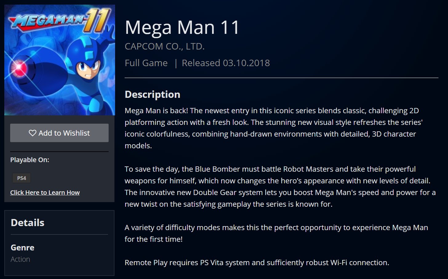 Il n’y a visiblement pas que ce pauvre Loris Karius, gardien malheureux de Liverpool, qui ai fait de grosses bourdes ce week-end, puisque le Playstation Store de Singapour semble avoir malencontreusement dévoilé une date de sortie ainsi qu’un élément inédit de gameplay pour Mega Man 11, en atteste la capture d’écran de la page consacrée au jeu. Désormais supprimée, cette page révélait en effet la date du 3 octobre 2018, accompagnée d’une description du titre révélant le système de « Double Gear », signifiant qu’un mécanisme de double équipement permettra d’augmenter la puissance et la vitesse du héros. Cette suppression soudaine ne fait que donner un peu plus de crédibilité à ces informations.