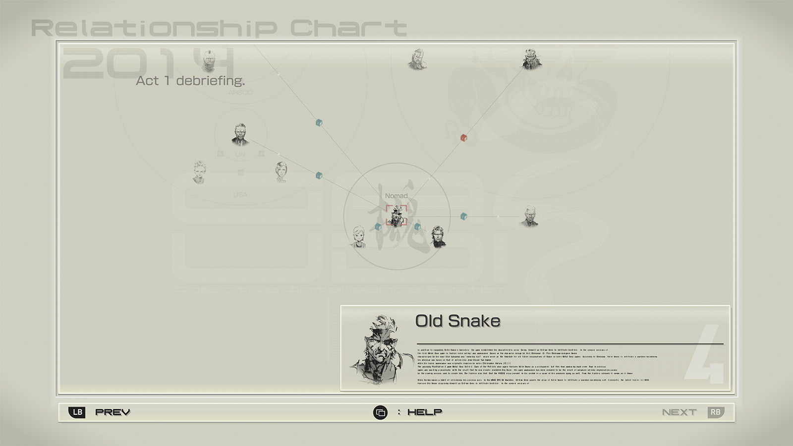 Vous pouvez parcourir la “Base de données Metal Gear Solid 4” pour vous renseigner sur les personnages, les armes et les paramètres de la série Metal Gear à l’aide de l’Encyclopédie (GENE), du Schéma relationnel (MEME), ou de la Chronologie (SCENE). Vous pouvez atteindre une autre page d’information en sélectionnant un mot dans chaque explication.