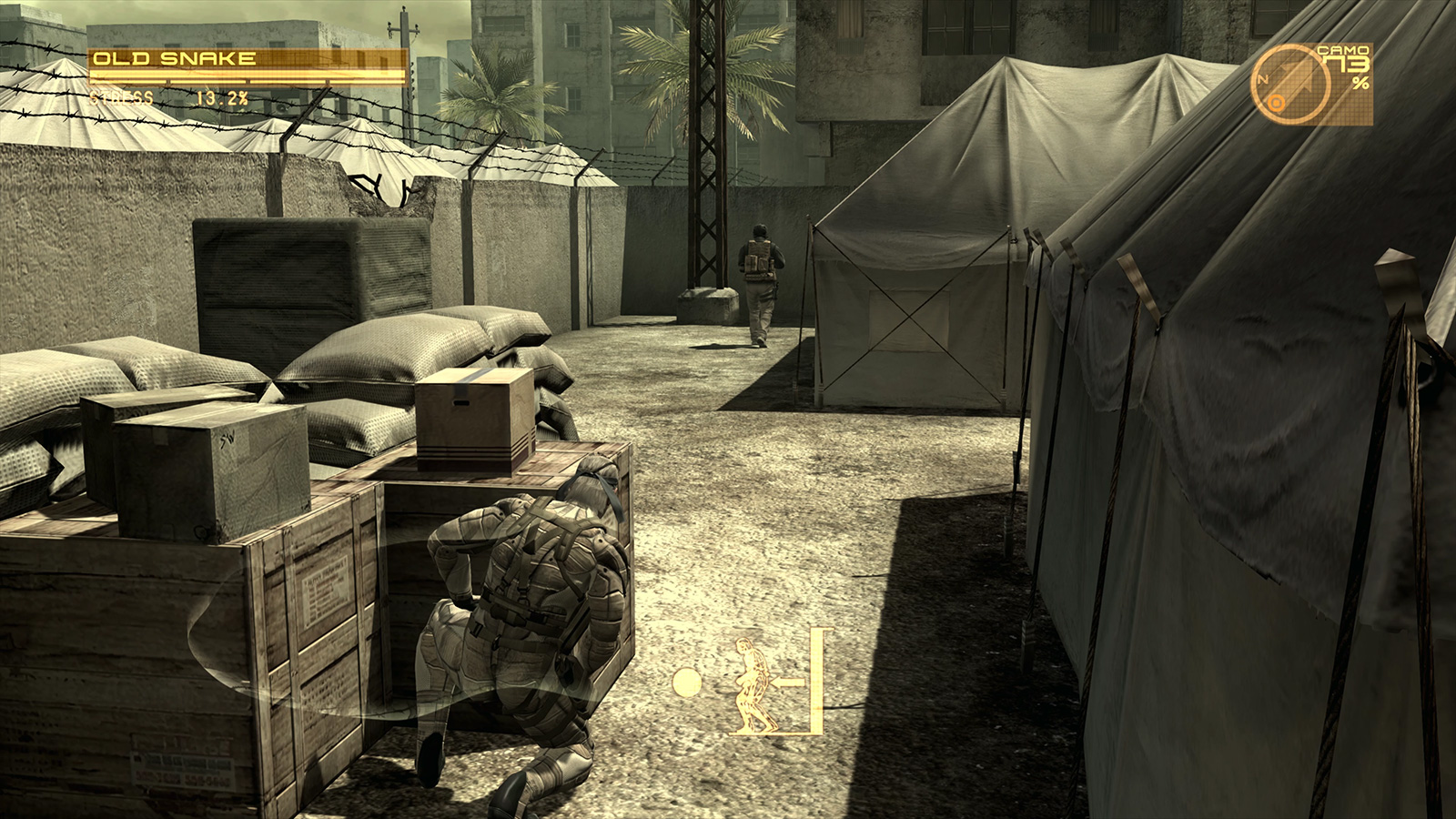 Avec le Solid Eye, qui, en plus de proposer des modes zoom et vision nocturne, met en surbrillance les soldats et les objets, et l’OctoCamo, une tenue de camouflage qui se transforme instantanément pour s’adapter à l’environnement, l’équipement de Snake a bénéficié d’une amélioration significative par rapport au passé.