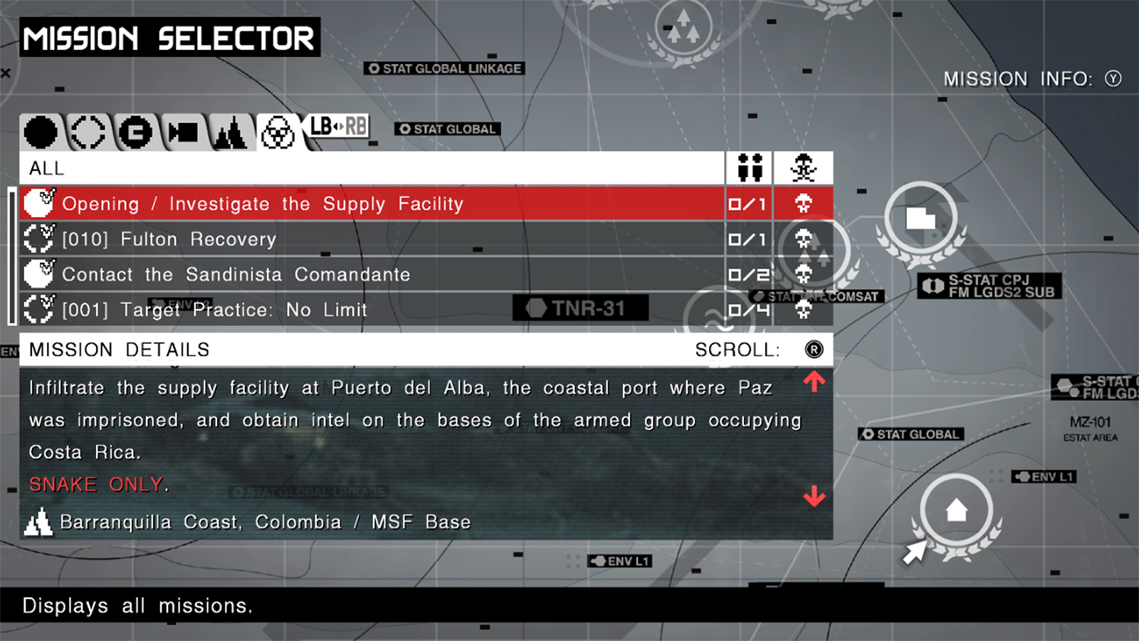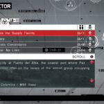 Progressez dans le jeu en complétant diverses missions. Choisissez la mission que vous souhaitez accomplir depuis le menu de sélection de mission. Mother Base