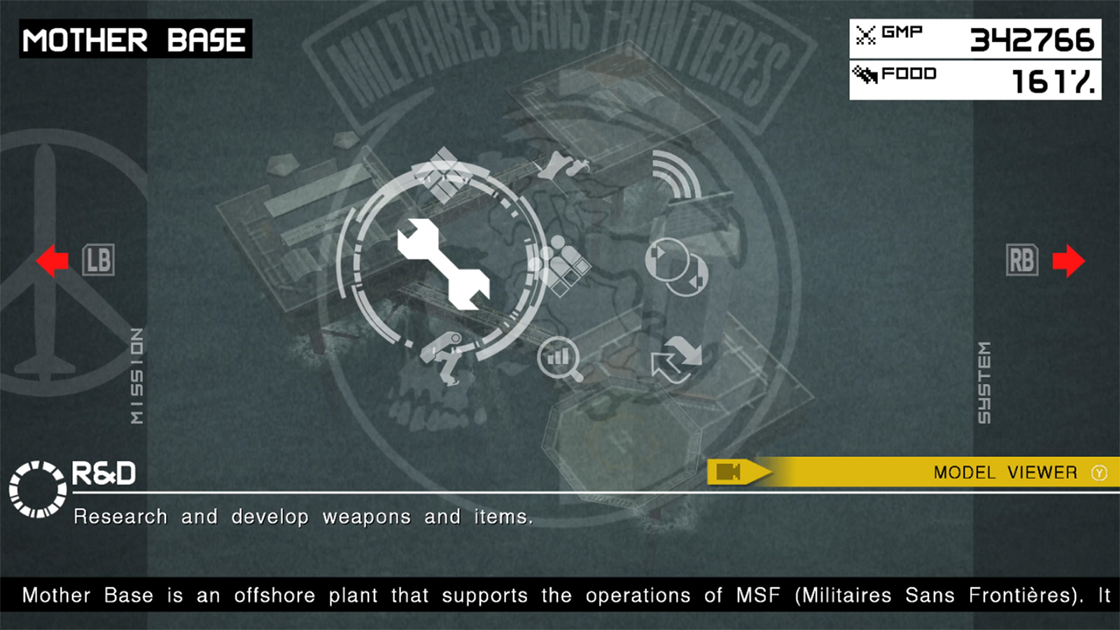 Elle abrite les quartiers du personnel, des laboratoires de recherche d’armes et équipement pour vos missions, des entrepôts pour les armes de grande taille que vous aurez capturées, et plus encore. Élargir votre personnel permet à Mother Base de croître et de se développer, incorporant ainsi des éléments de simulation.