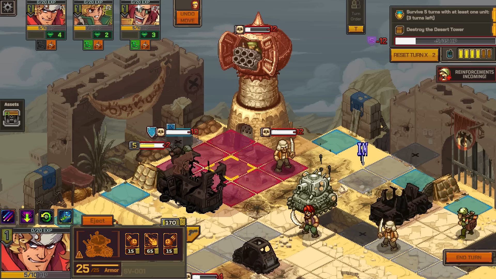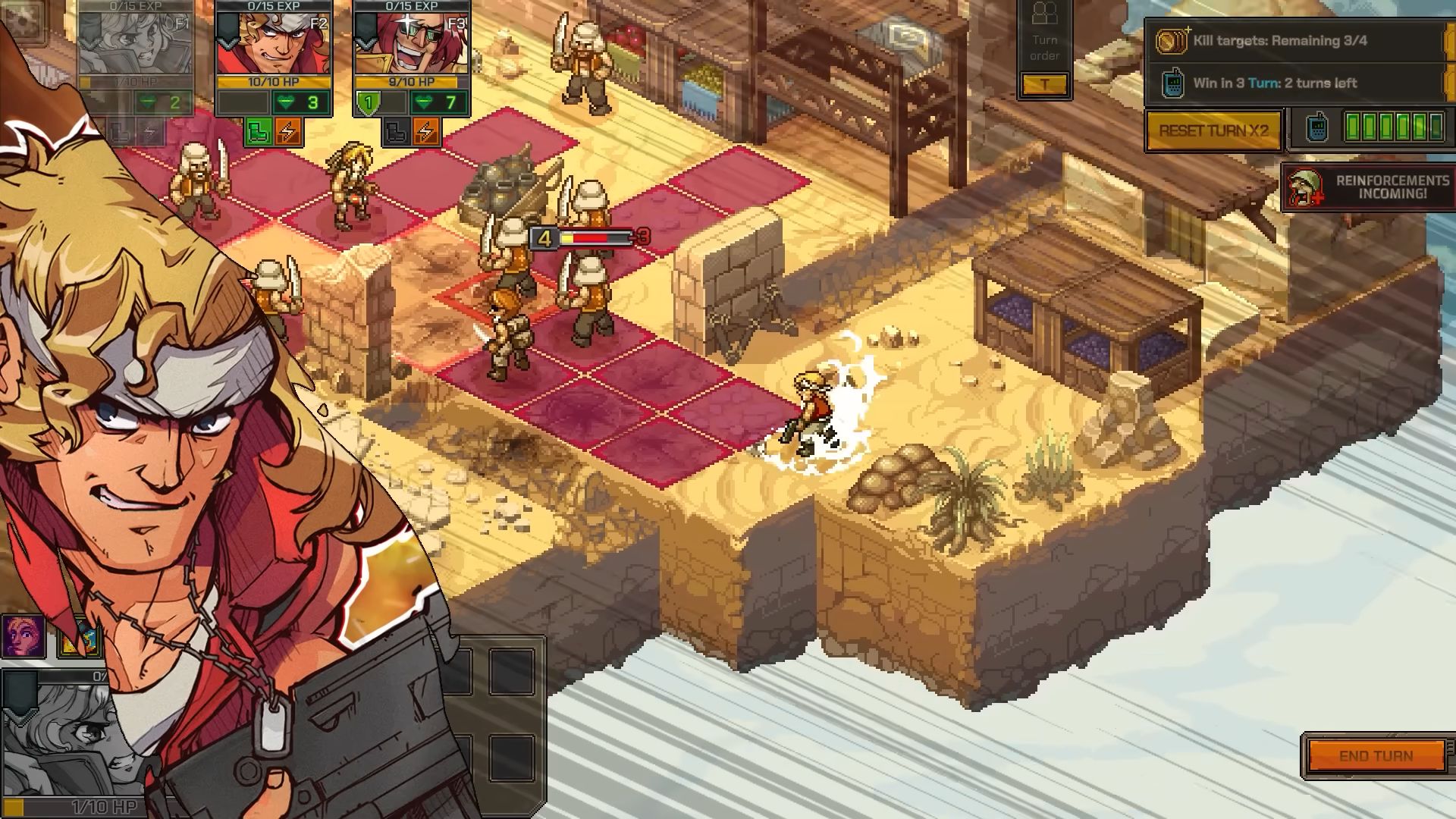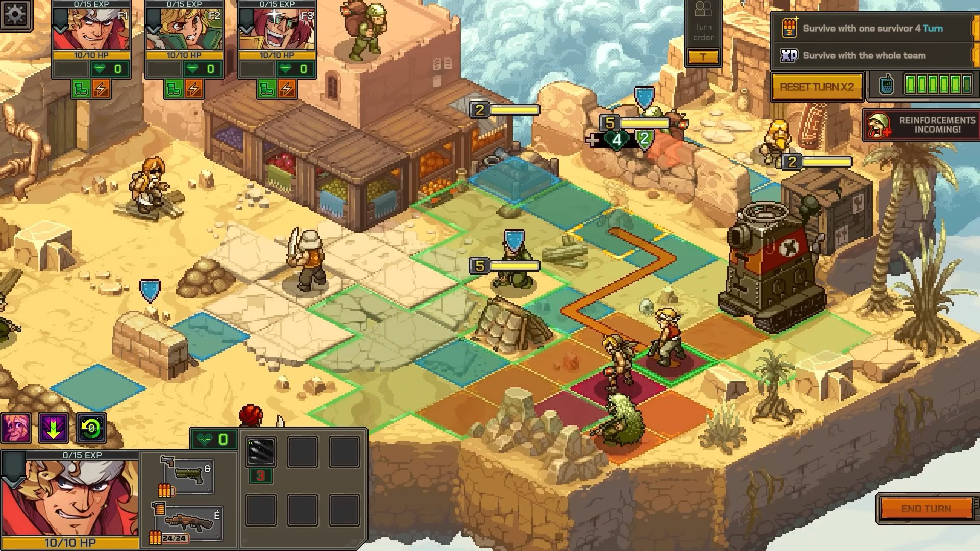 Comme prévu, la première démo jouable de Metal Slug Tactics est arrivée sur PC via Steam, dans le cadre du Steam Neo Fest. Disponible jusqu’au 17 juin 2024, elle permet de découvrir la première région du jeu et les bases des combats tactiques. On commence dans le baraquement de l’escouade, servant de base arrière pour améliorer les troupes et acheter de l’équipement. Il permet aussi de choisir les soldats à inclure dans l’équipe lors de la prochaine mission. Évidemment, il faut bien vérifier chaque personnage, chacun ayant des capacités uniques et des synergies potentielles avec d’autres héros. On trouve des personnages de la série, mais aussi de nouvelles recrues. Il est d’ailleurs possible de débloquer Tarma, un puissant et énergie compagnon d’arme. Les développeurs notent que cette démo est tirée du jeu en cours de développement et préviennent qu’il est possible de rencontrer quelques problèmes sur lesquels l’équipe travaille déjà. Une liste des problèmes connus sera publiée sur les forums. Dans le même temps, une longue bande-annonce de gameplay été diffusée, ce qui permet d’en savoir largement plus sur les mécaniques de jeu :