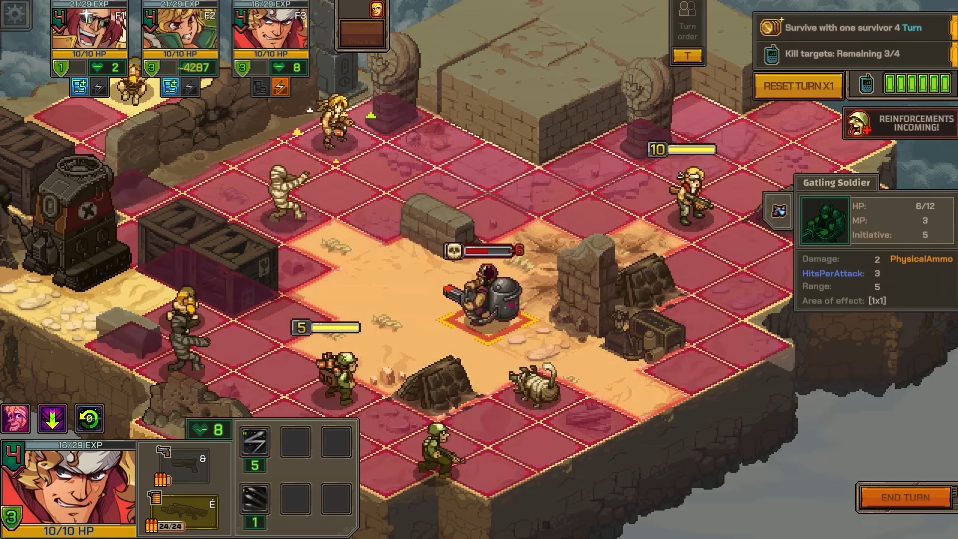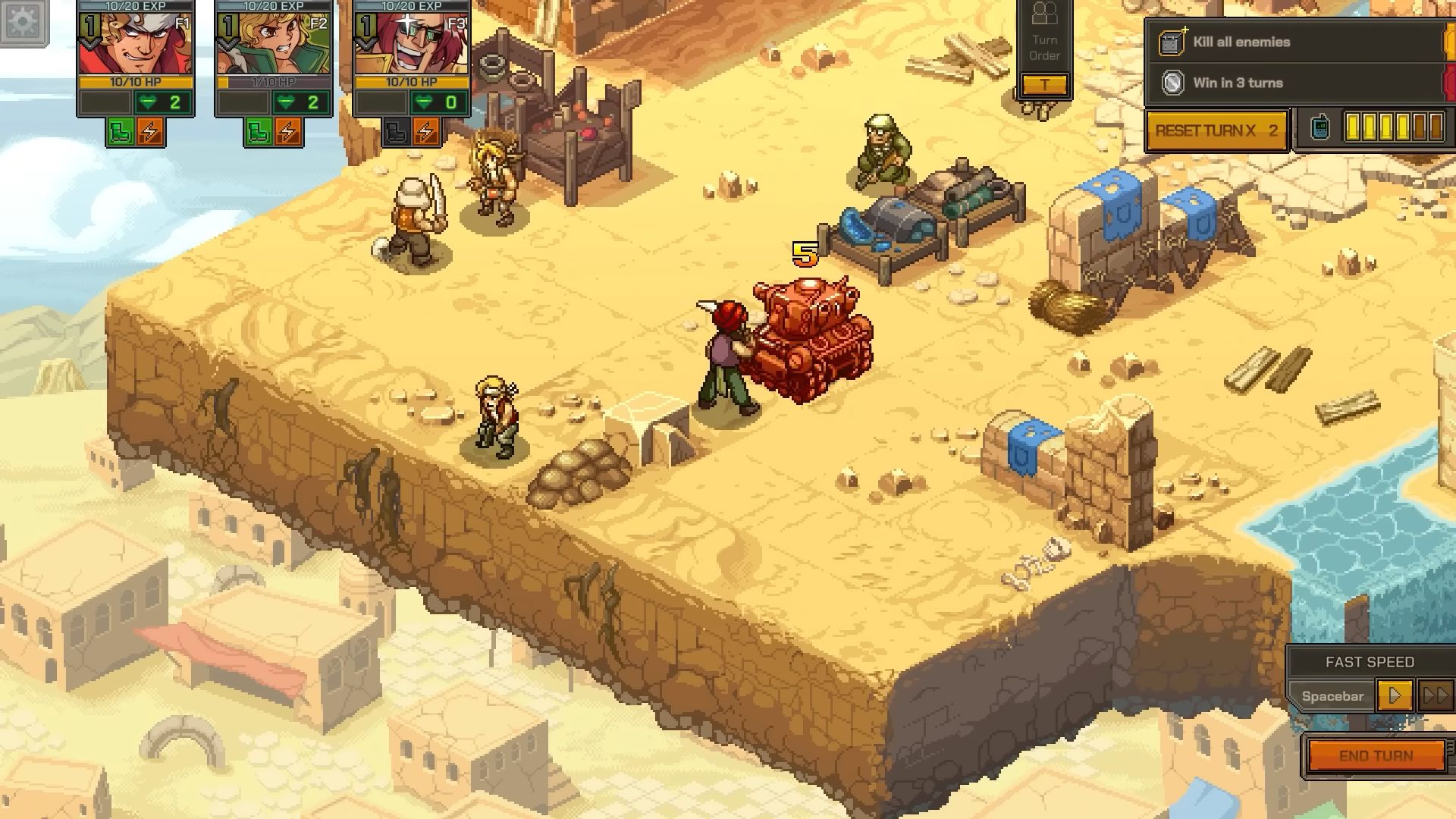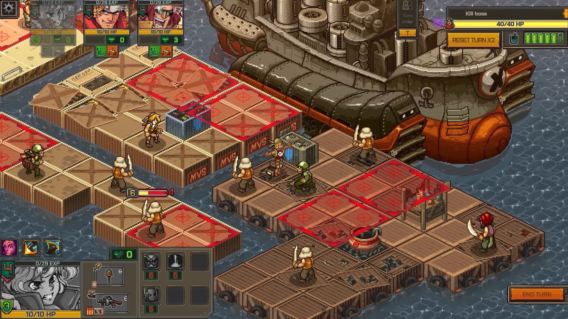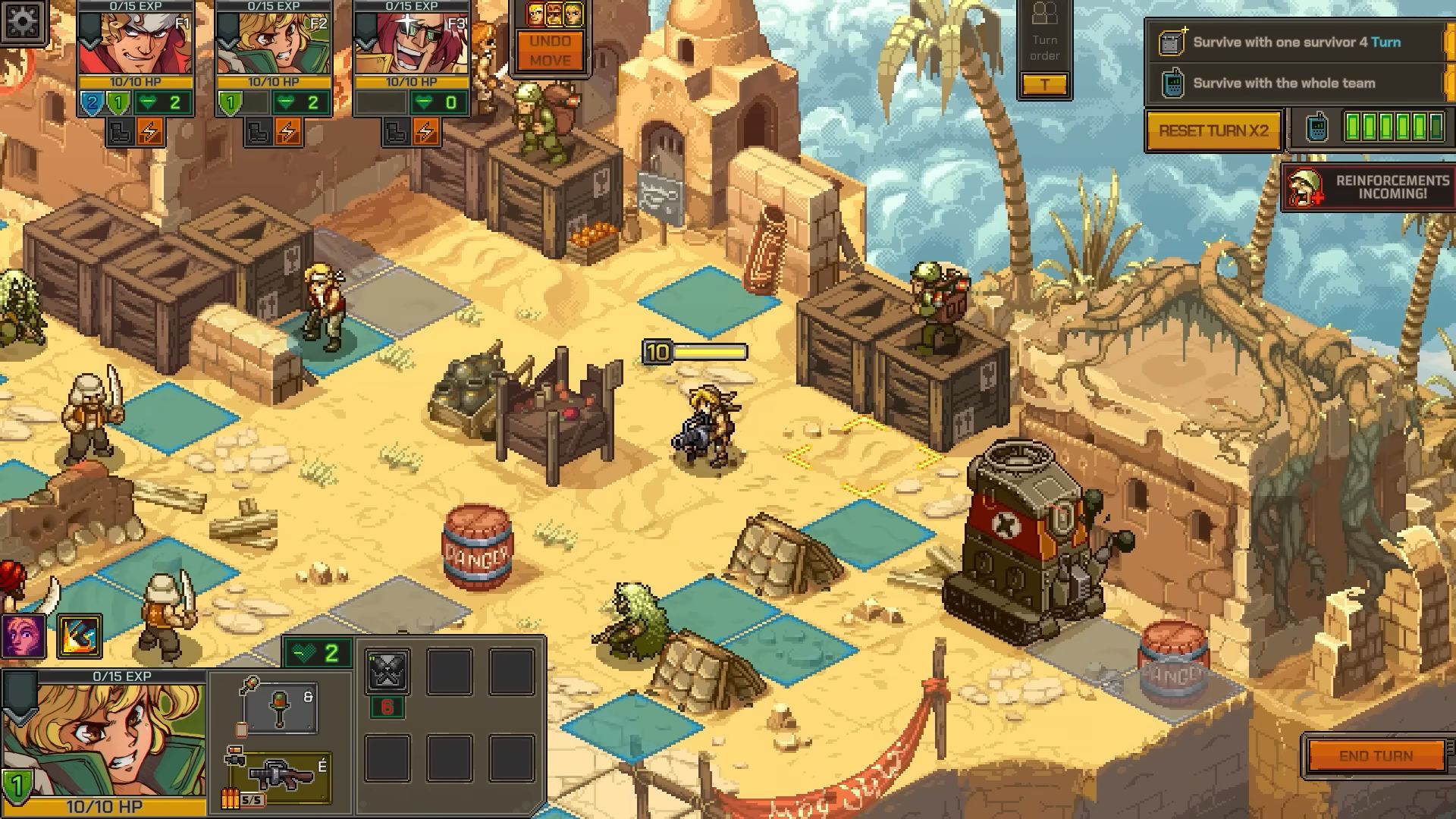 Bien que Metal Slug Tactics s’écarte de ce qu’on a pu voir avec la série jusqu’à présent via ses dimensions roguelite et die and retry, Leikir Studio et Dotemu promettent des combats dynamiques avec des super-attaques à débloquer et à utiliser de façon stratégique contre les ennemis, mais aussi des points d’expérience que les personnages gagneront après chaque bataille et des armes ou attributs bonus pour améliorer la puissance de feu du groupe. Les niveaux seront générés aléatoirement, avec différentes tuiles qui ont été conçues à la main. Le jeu s’appuie également sur des perks et des attaques spéciales avec un tout nouveau système d’adrénaline. On nous promet aussi de superbes graphismes en pixel art et des animations très fluides rendant hommage à la série.
