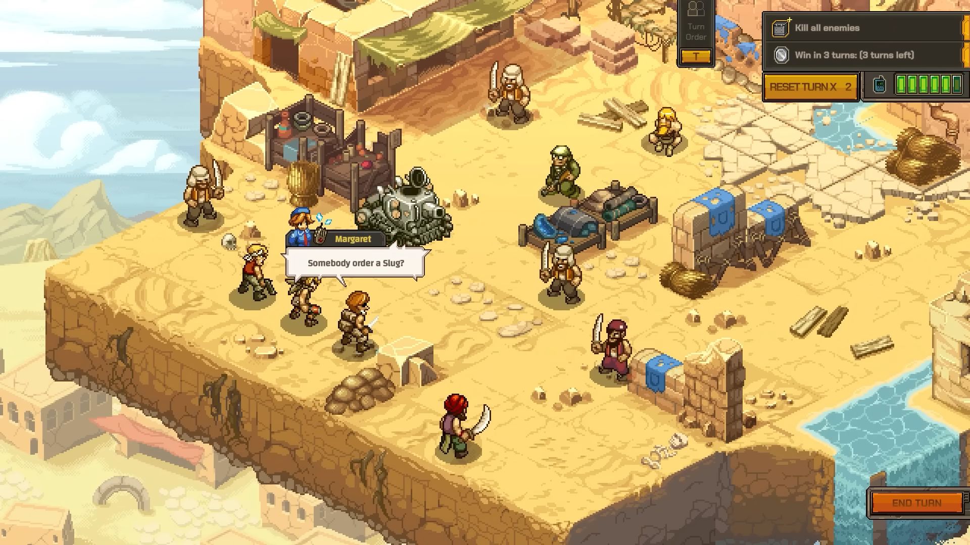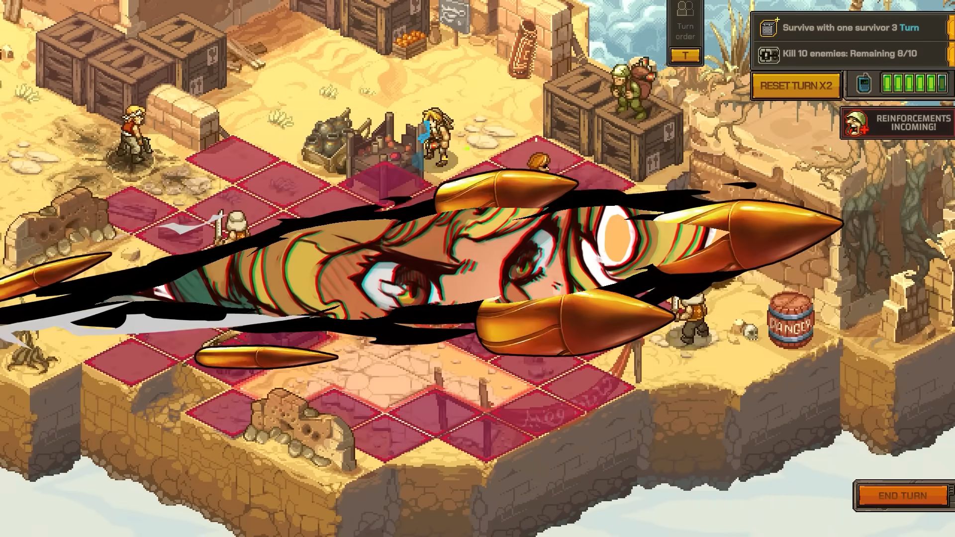 « Une nouvelle vidéo de gameplay voit les stars de la série Marco, Eri, Fio et Tarma faire feu de tout bois pour illustrer quelques-unes des possibilités tactiques offertes par les combats au tour par tour de Metal Slug Tactics. Des champs de bataille variés, un rythme soutenu et un défi intense vous attendent le temps d’une campagne généreuse : choisissez vos combattants – et leur paquetage – avec attention avant de vous lancer dans la mêlée contre les ennemis iconiques de METAL SLUG. Une bonne intuition et un maximum d’efficacité seront nécessaires pour survivre au front contre les troupes adverses, mais attention : des combats de boss dantesques, comme le titanesque véhicule blindé lance-missiles de cette bande-annonce, sanctionnent régulièrement votre avancée derrière les lignes ennemies. »