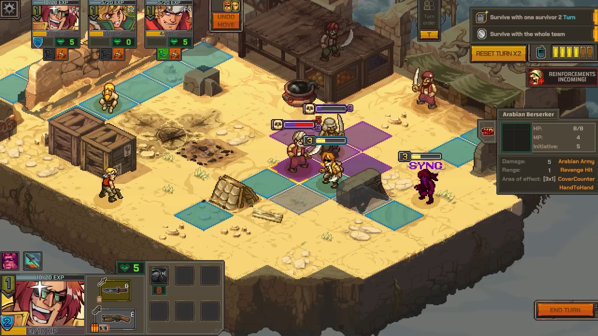 Lancez des attaques simultanées avec la technique “SYNC” pour infliger des dégâts colossaux à l’adversaire. Et si votre équipe se retrouve en mauvaise posture, appelez des renforts et admirez le résultat : artillerie lourde, frappes aériennes ou même l’incroyable METAL SLUG, à vous de voir !