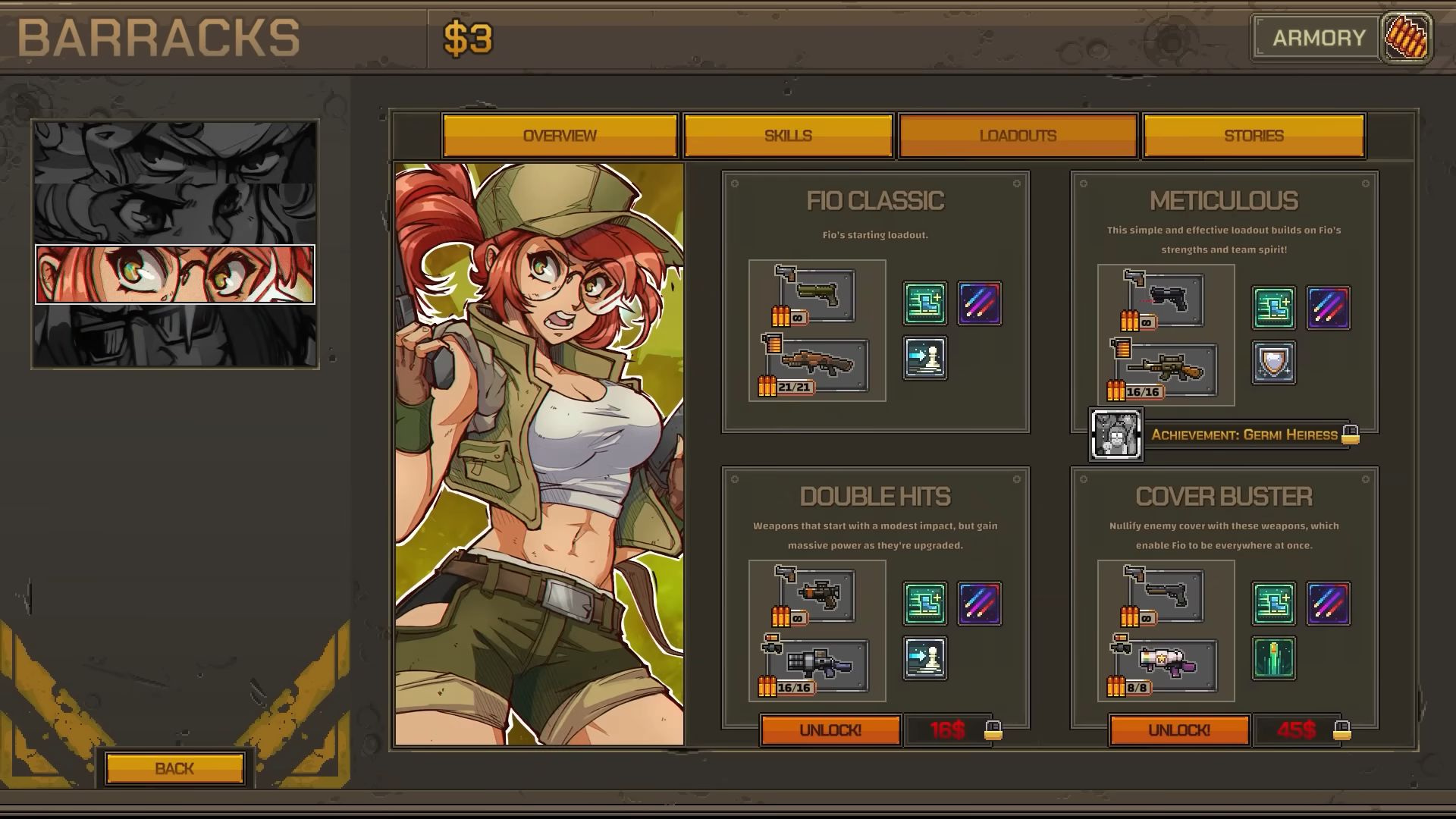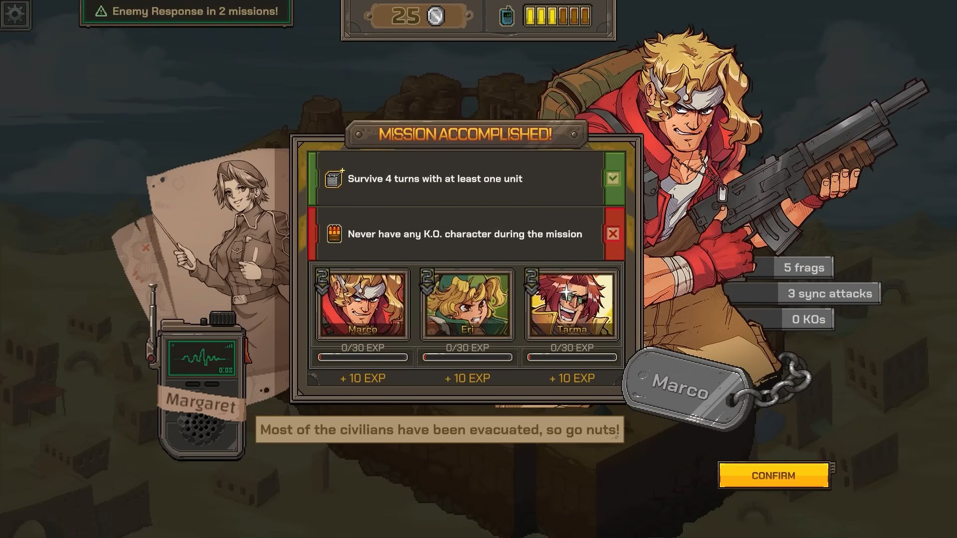Le jeu comprendra plusieurs personnages jouables en plus de Marco, Eri, Fio et Tarma, qui pourront lancer des attaques simultanées sur les cibles grâce à une mécanisme appelée « sync. », infligeant ainsi de lourds dégâts aux adversaires. Il sera également possible d’appeler des renforts pour utiliser la grosse artillerie à disposition des Peregrine Falcons : le Metal Slug ou des raids aériens, au choix. Au fil des affrontements, on gagnera des compétences à améliorer dans un arbre dédié. Il sera aussi possible de refaire des missions, ce qui offrira une bonne dose de rejouabilité. La bande-annonce ci-dessous présente par ailleurs une nouvelle attaque synchronisée ainsi que le boss Aeshi Nero, qui sera donc de retour en plus de Donald Morden.
