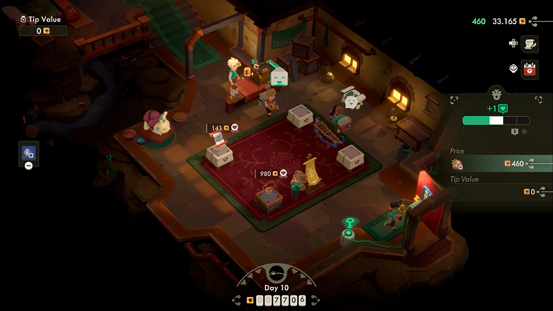 Les explorations se déroulent cette fois dans des dimensions changeantes, avec des ennemis interdimensionnels et de nombreux défis dynamiques. Le joueur dispose de plusieurs armes comme des épées, gantelets ou même un simple balai et d’un élément central du gameplay : le sac à dos. L’organisation des reliques dans ce sac permet de déclencher différents effets et d’optimiser les profits obtenus à la fin de chaque run. Une fois de retour à la boutique, le jeu bascule vers la gestion commerciale. Il faut négocier les prix avec les clients, améliorer l’apparence du magasin, débloquer des bonus temporaires et gérer les petits imprévus du quotidien. Les gains peuvent ensuite être réinvestis pour améliorer l’équipement du héros et préparer les expéditions suivantes.