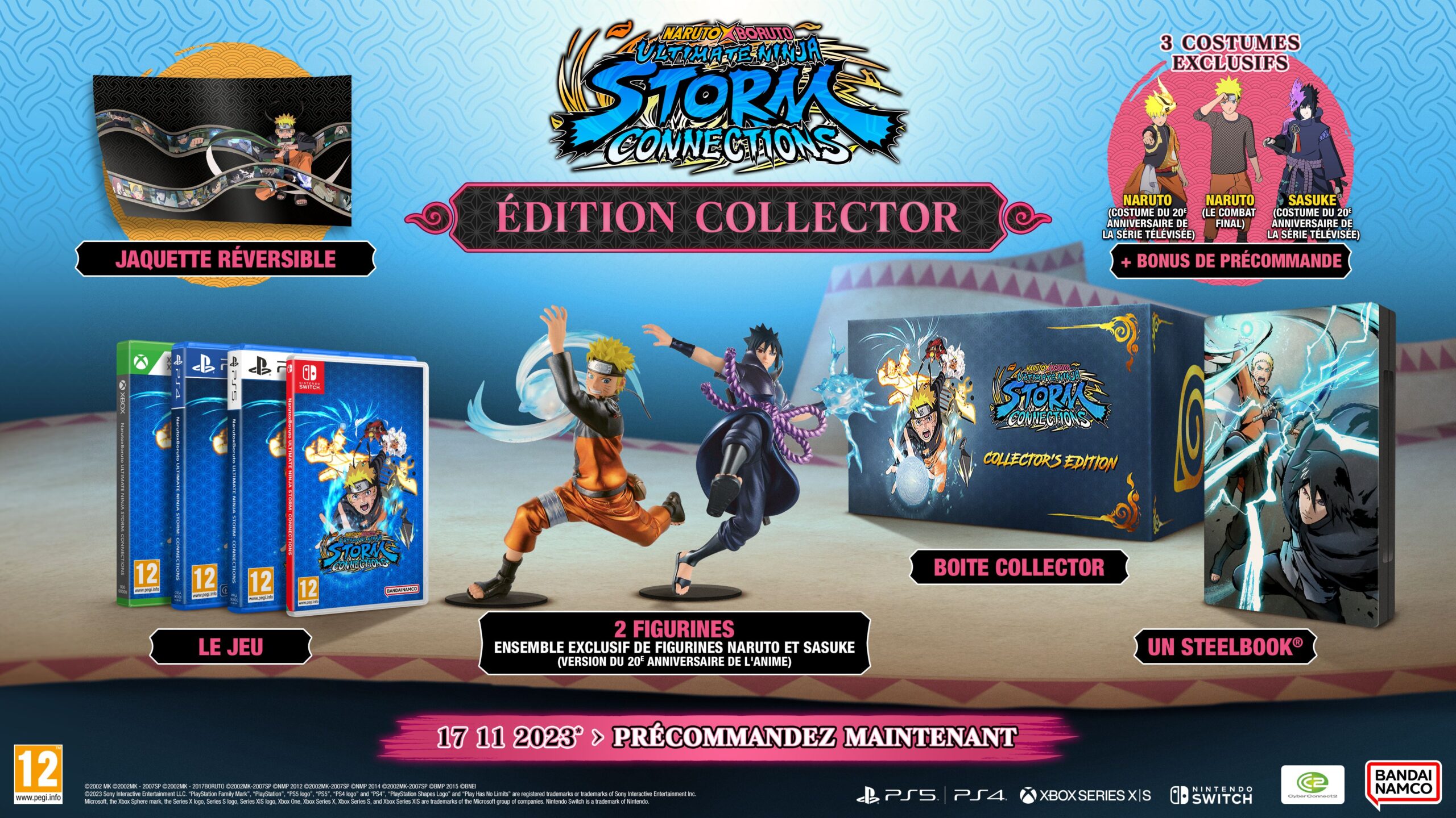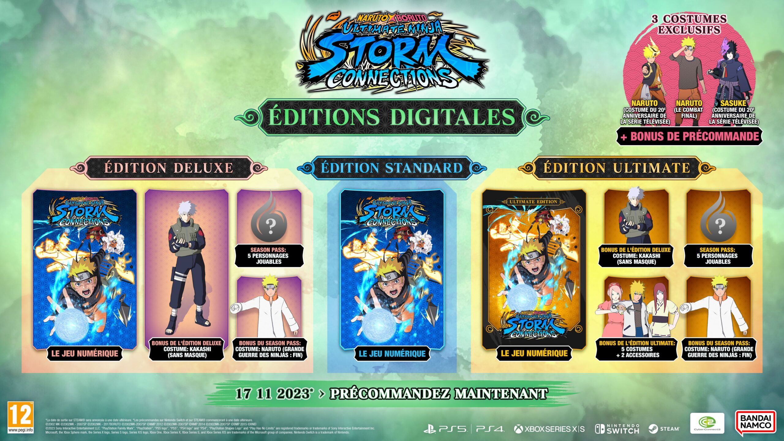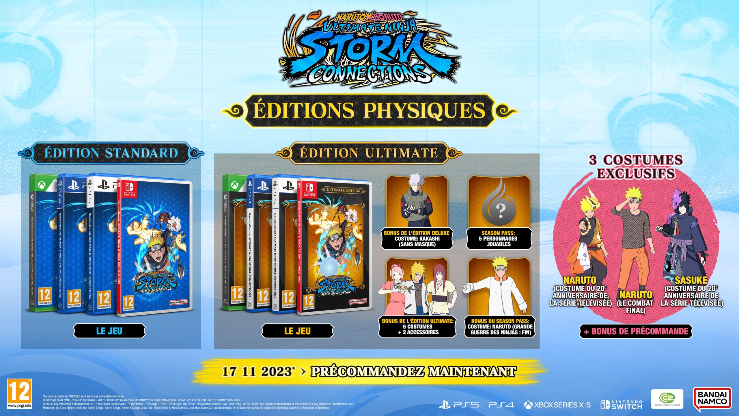 Les éditions physiques de Naruto X Boruto Ultimate Ninja Storm Connections, détaillées ci-dessous, sur toutes les consoles mentionnées sont d’ores et déjà disponible en précommande. Certaines peuvent être achetées sur la boutique officielle européenne de Bandai Namco. Les versions dématérialisées le sont aussi, mais uniquement pour les versions PlayStation et Xbox. De plus, pour l’achat de n’importe quelle édition, trois tenues seront offertes : Naruto Uzumaki (tenue commémorative des 20 ans de l’anime), Sasuke Uchiwa (tenue commémorative des 20 ans de l’anime) et Naruto Uzumaki (Ultime Combat). Les personnes possèdant Naruto to Boruto : Shinobi Striker recevront aussi le t-shirt Nanashi et la tenue Merz. Ce jeu n’étant pas disponible sur Switch, il ne sera pas possible d’en profiter.
