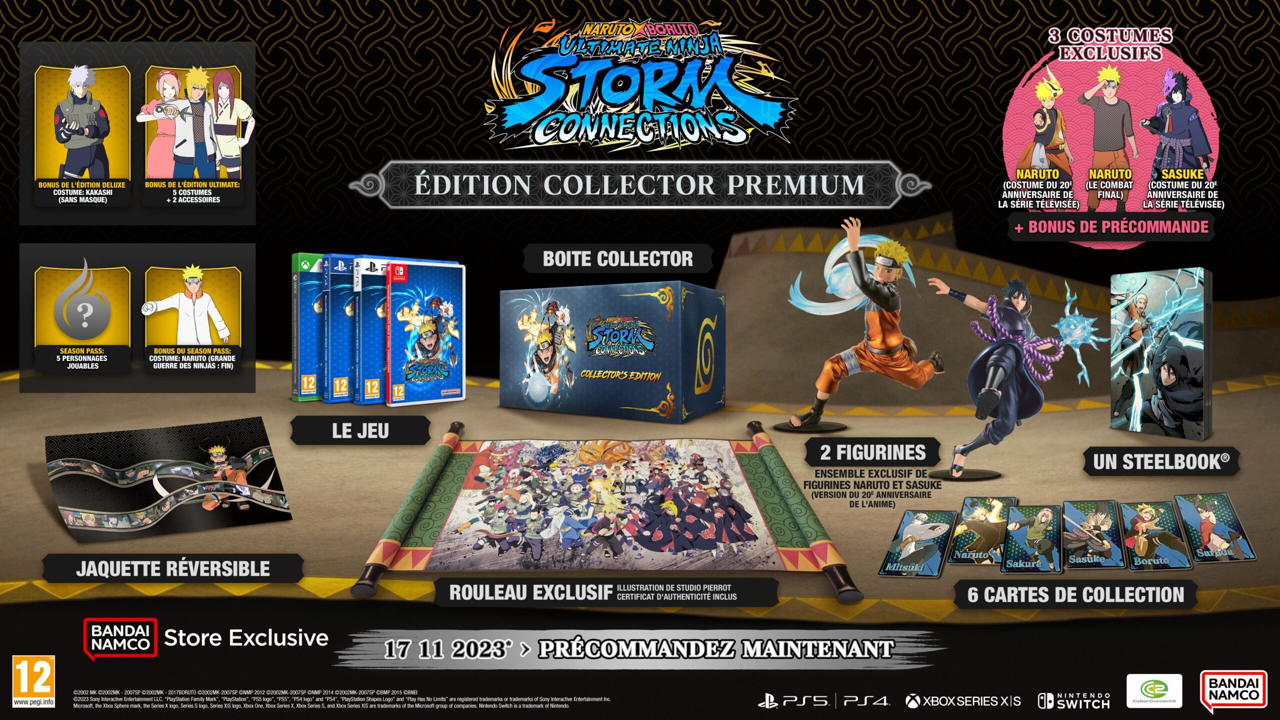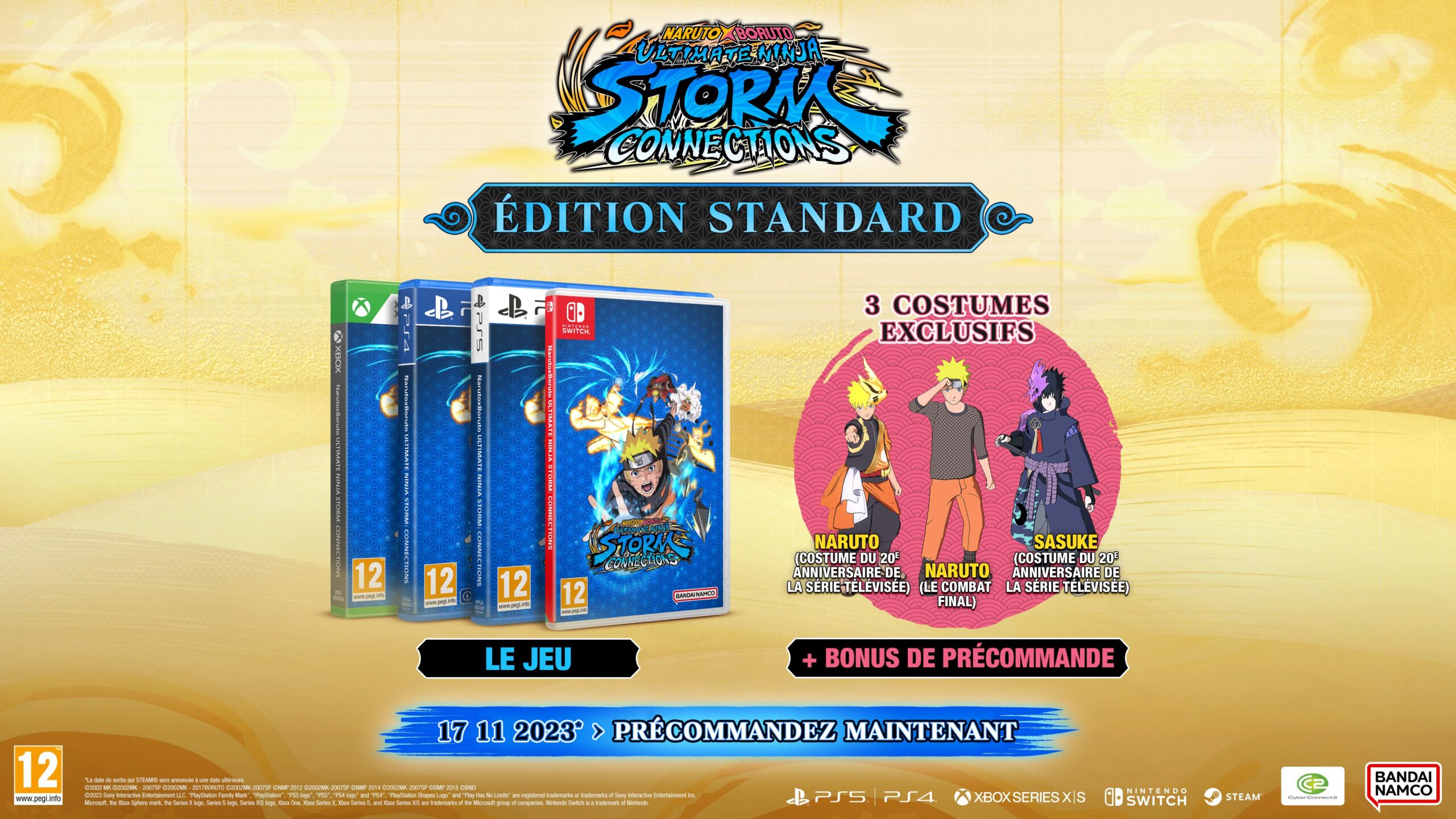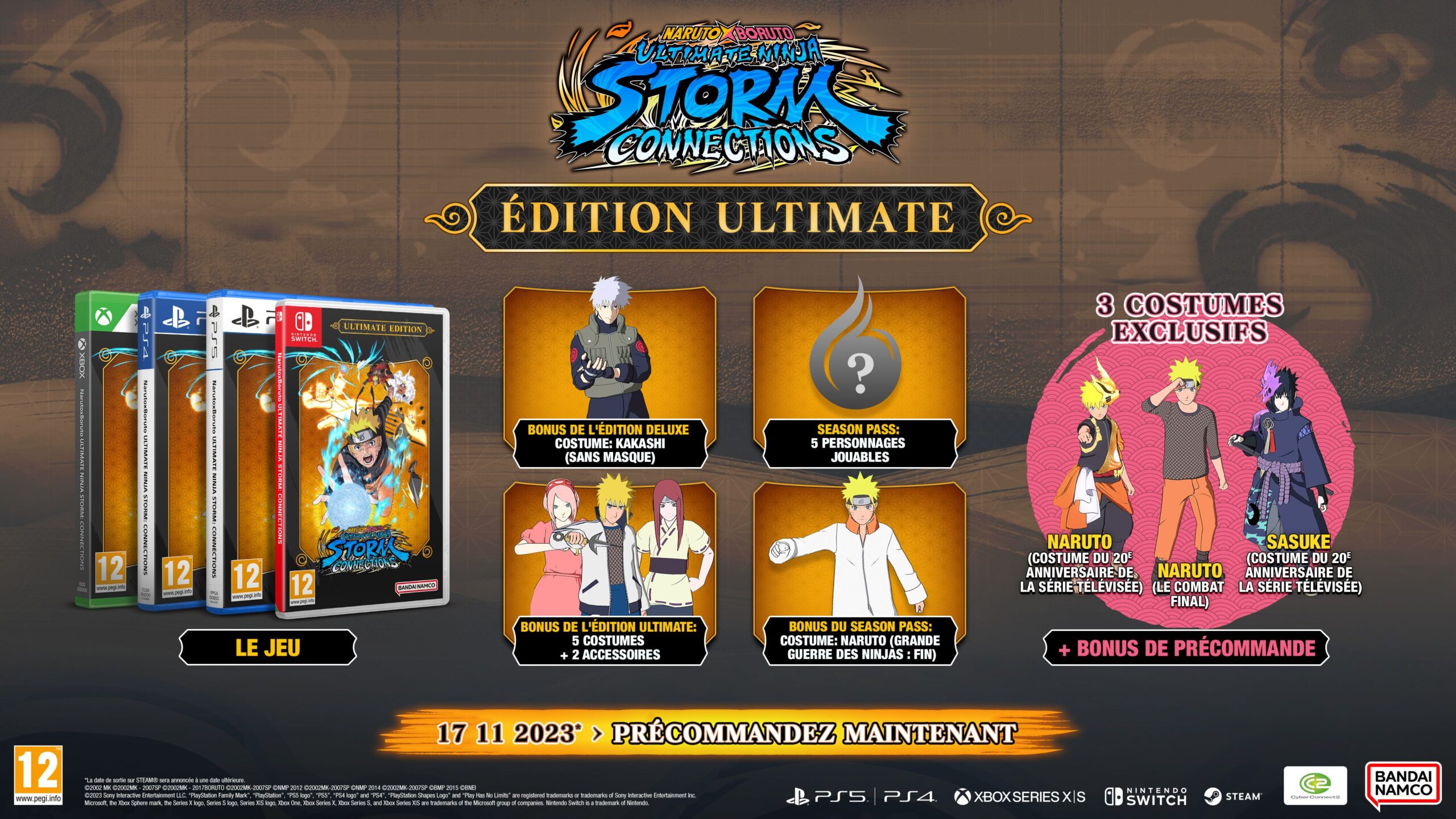 Naruto X Boruto Ultimate Ninja Storm Connections est un nouvel épisode de la série de jeux de combat et d’action Ultimate Ninja Storm développée par CyberConnect2. Le jeu sera disponible le 17 novembre 2023 en Occident (le 16 novembre au Japon) sur Nintendo Switch, PlayStation 4, PS5, Xbox One et Xbox Series. Concernant la version PC qui sortira via Steam, la date de sortie sera communiquée ultérieurement.