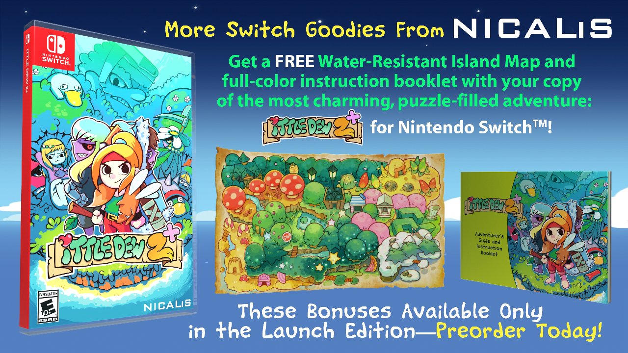 – Ittle Dew 2+ : disponible cette année au prix de 29,99 $ (listé pour le 30 novembre 2017 sur Amazon.com), version physique confirmée. Nicalis proposera une édition de lancement contenant la version boîte du jeu, une carte de l’île (résistante à l’eau) et un livret d’instructions en couleur.