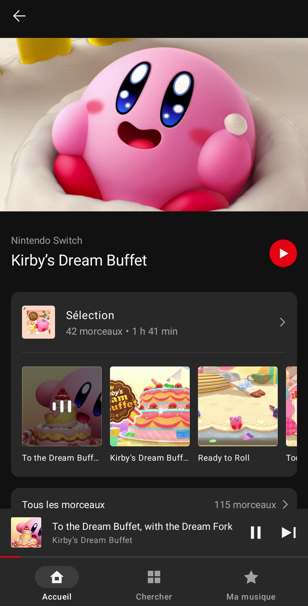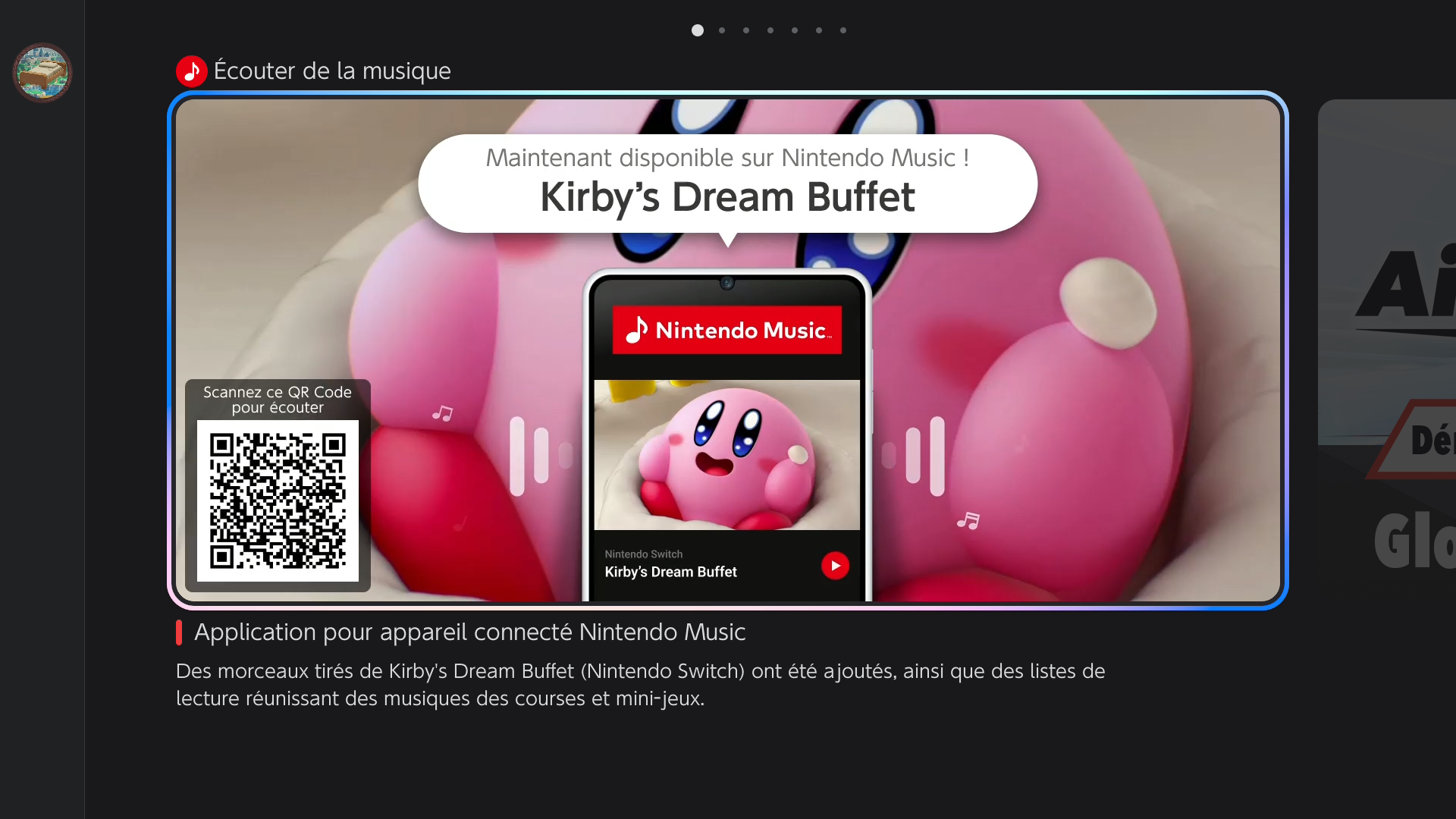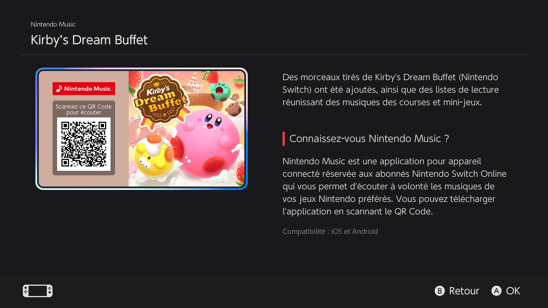Nintendo a ajouté ce 11 novembre 2025 des musiques d’un jeu supplémentaire dans l’application Nintendo Music sur Android et iOS : Kirby’s Dream Buffet. Au total, on trouve 115 morceaux de la bande originale, qui avait été dirigée par Yuuta Ogasawara. Jun Ishikawa, Shogo Sakai, Hirokazu Ando, Megumi Ohara et Yuki Shimooka étaient également crédités dans la partie « Sound » du jeu, et Tadashi Ikegami apparaissait dans les « Special Thanks ». L’OST de Kirby’s Dream Buffet n’a jamais été commercialisée.