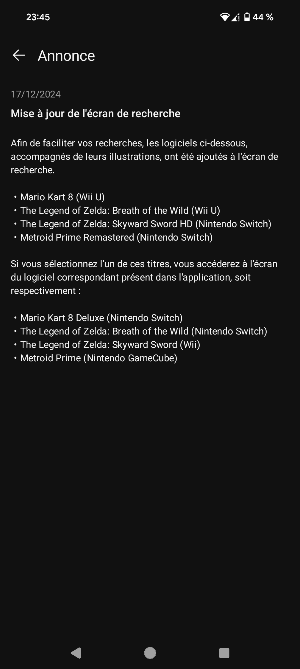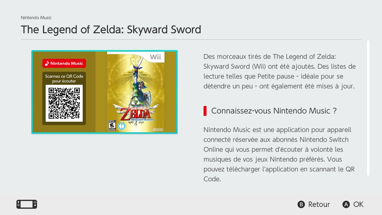 L’ajout des musiques de Skyward Sword dans Nintendo Music était accompagné d’une mise à jour de l’écran de recherche. Elle permet de faciliter les recherches pour les jeux qui ont bénéficié d’un portage ou d’un remaster sur Switch. Les jeux suivants, accompagnés de leurs illustrations, ont été ajoutés à l’écran de recherche :
