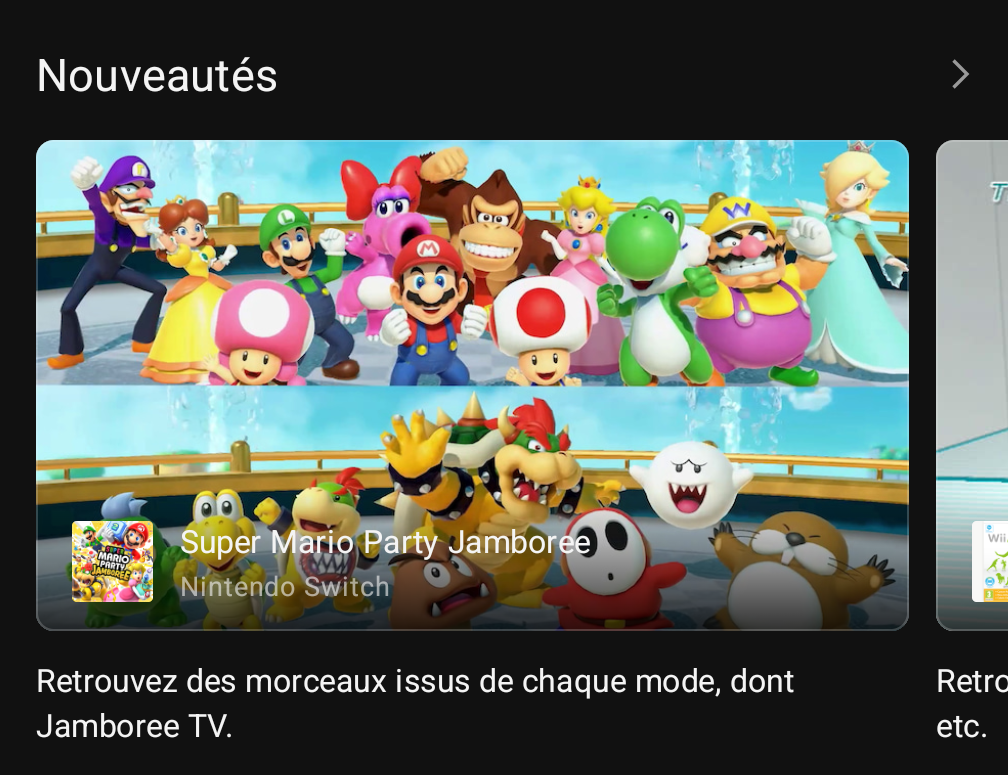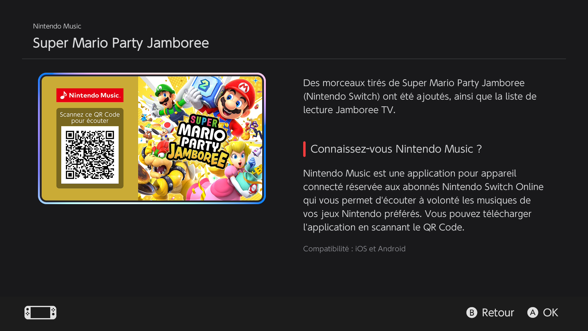 Nintendo a ajouté ce 25 novembre 2025 des musiques d’un jeu supplémentaire dans l’application Nintendo Music sur Android et iOS : Super Mario Party Jamboree. Des morceaux provenant de Jamboree TV sont également inclus. Au total, on trouve 296 pistes. La bande originale de Super Mario Party Jamboree avait été composée par Shigenobu Okawa et Yuta Yamaguchi de T’s MUSIC. Okawa était crédité en tant que Lead Composer et Yamaguchi en tant que Composer. Il en était de même pour Jamboree TV. L’OST de Super Mario Party Jamboree n’a jamais été publiée auparavant, avant l’ajout des musiques dans Nintendo Music.