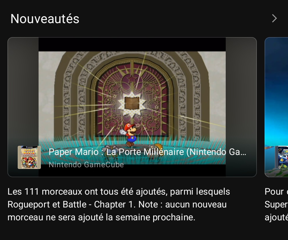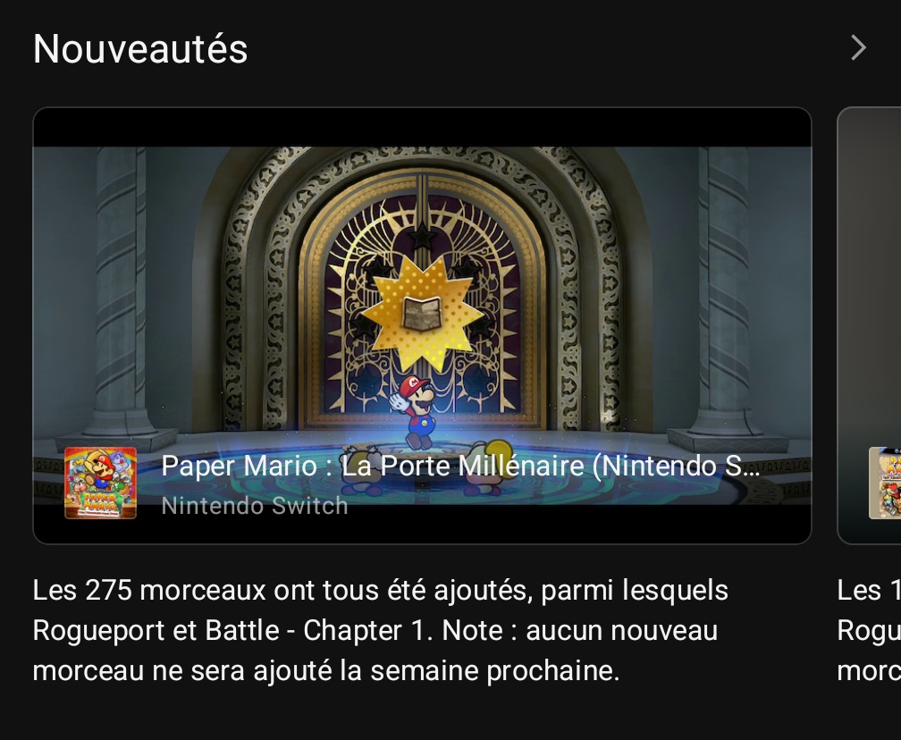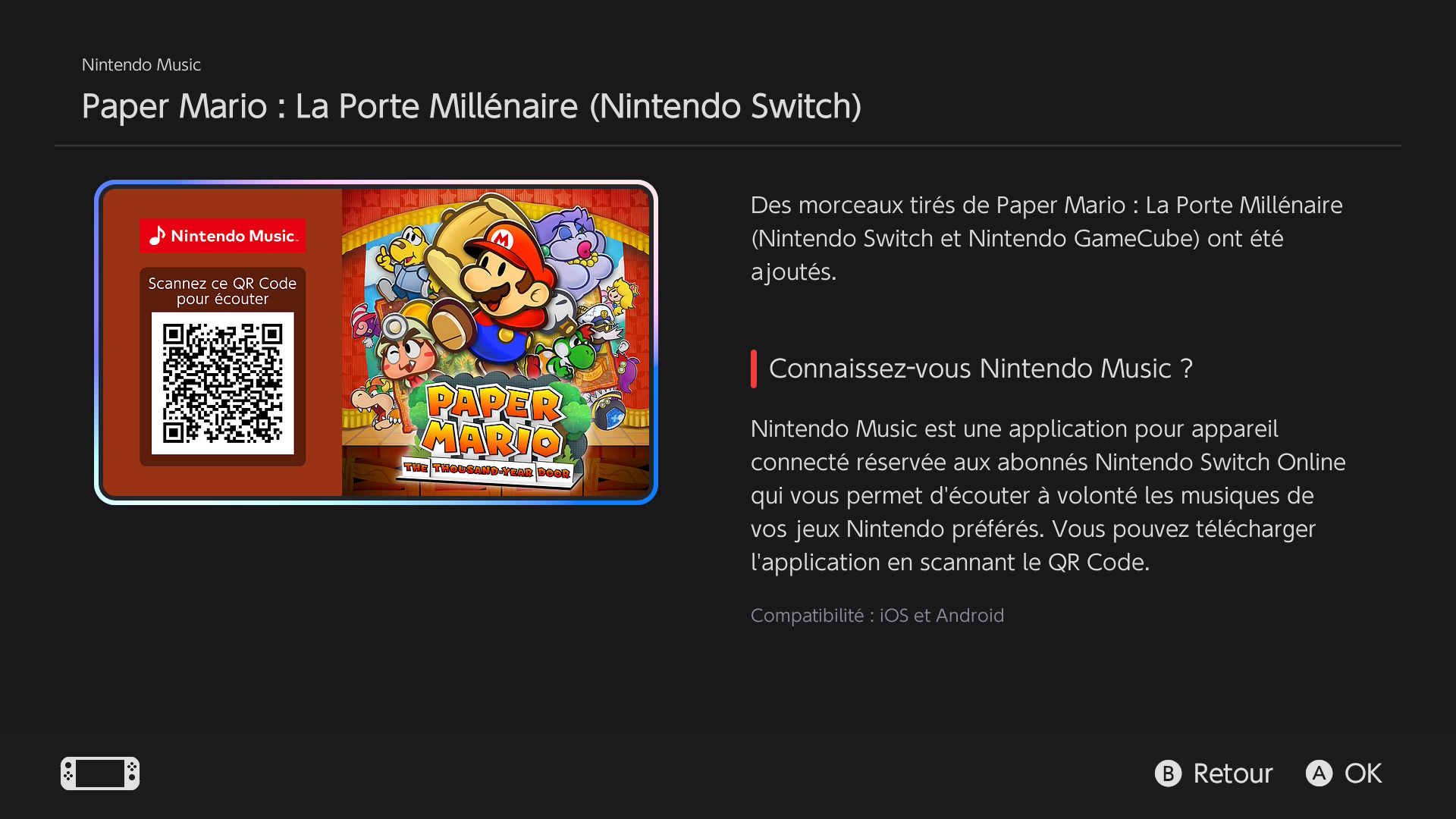 Nintendo a ajouté ce 7 octobre 2025 des musiques d’un jeu supplémentaire dans l’application Nintendo Music sur Android et iOS : Paper Mario : La Porte Millénaire. Au total, on trouve 111 morceaux de la bande originale de la version d’origine sur GameCube et 275 morceaux de l’OST de la version Nintendo Switch. Nintendo indique qu’aucun nouveau morceau ne sera ajouté la semaine prochaine dans Nintendo Music.
