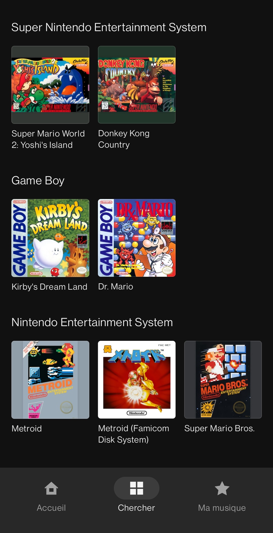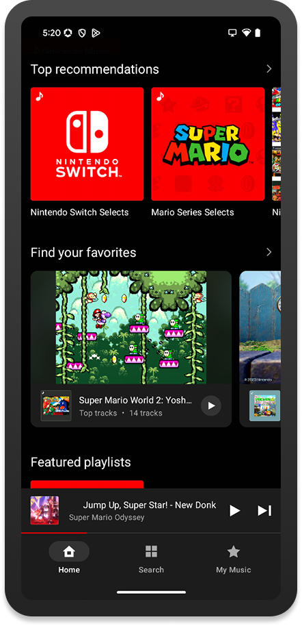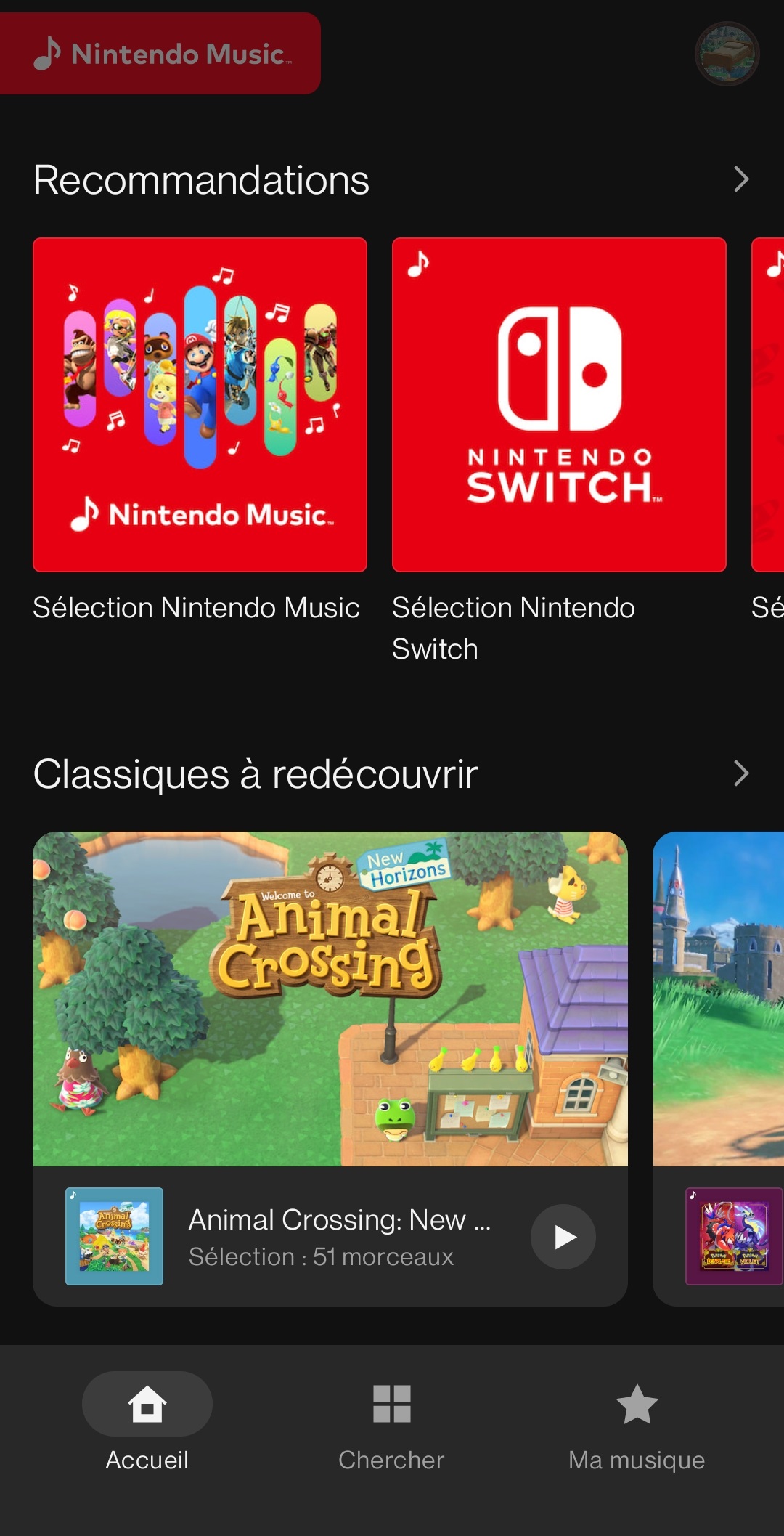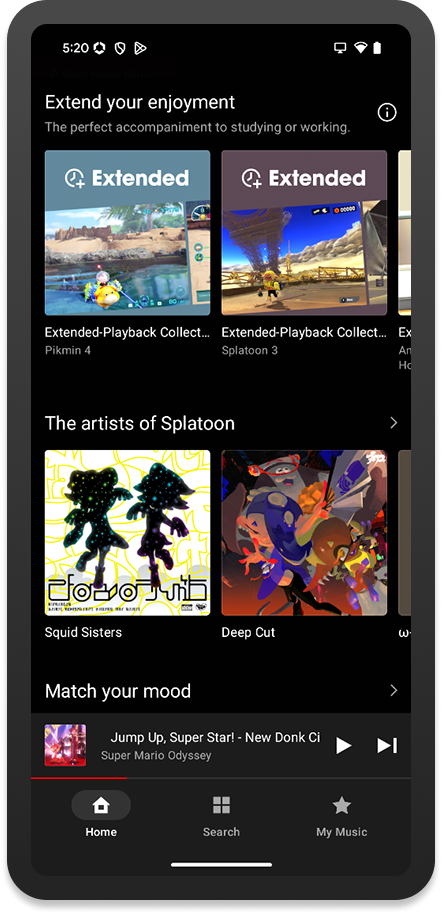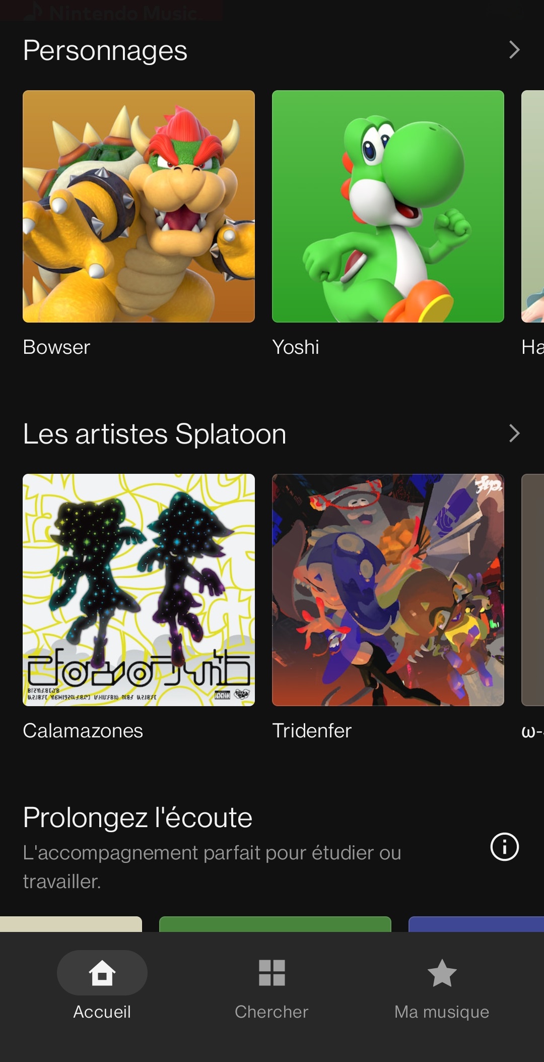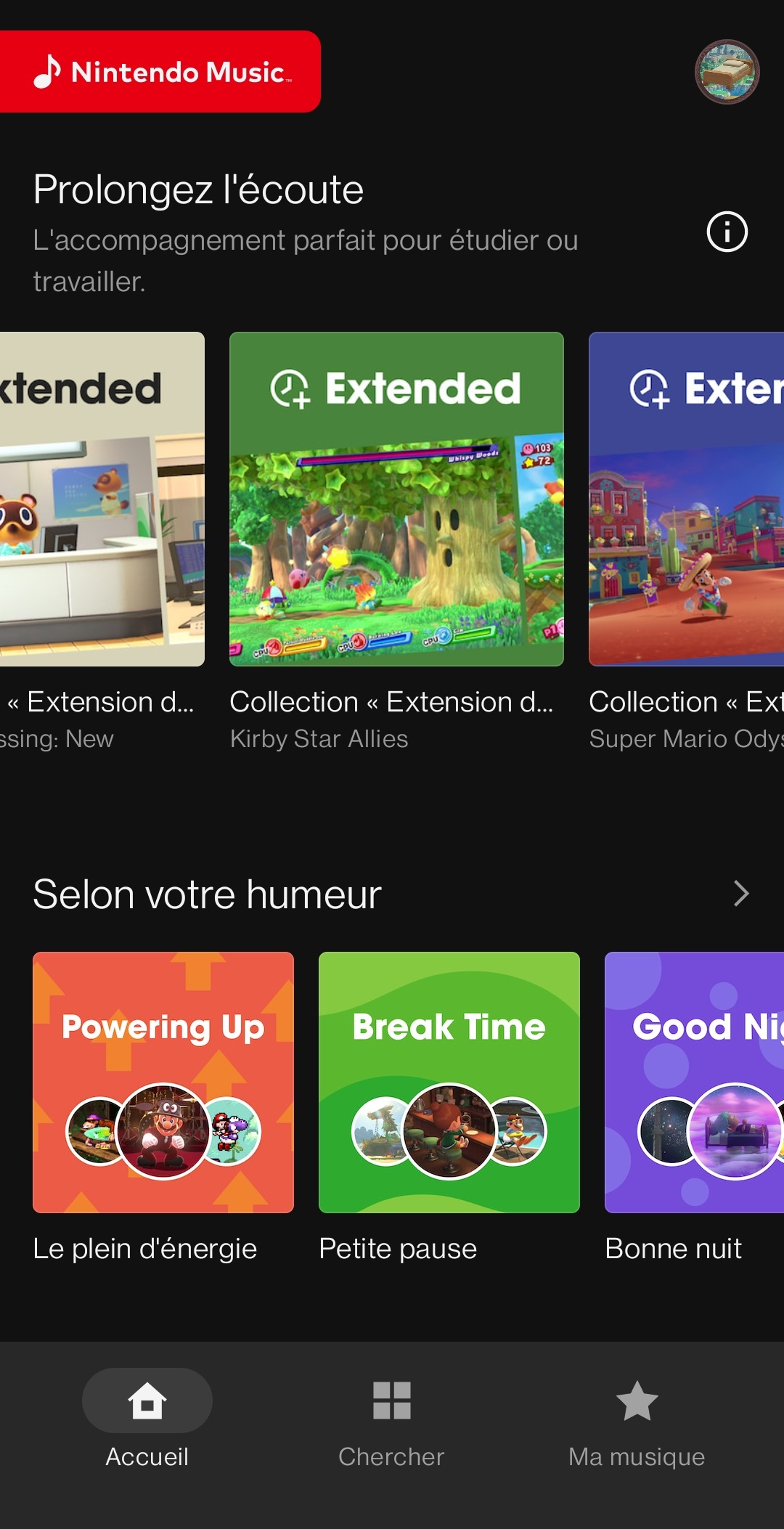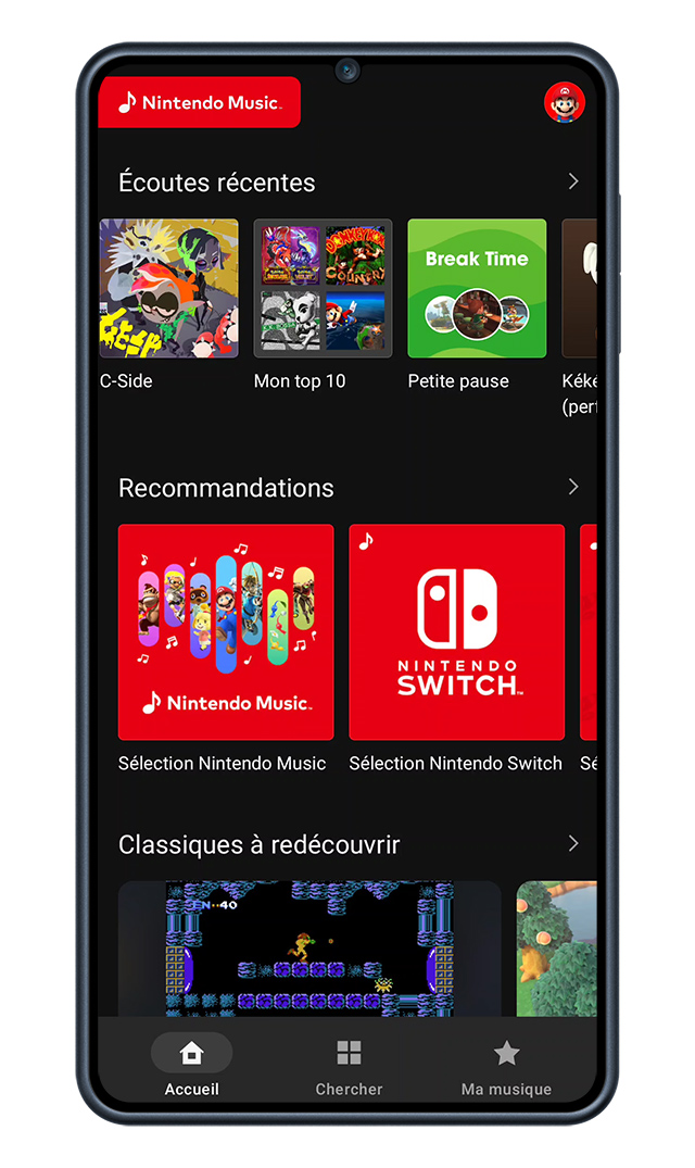 Sur l’écran d’accueil de l’application, on peut trouver une liste des écoutes récentes, des « classiques à redécouvrir » avec une sélection de certaines musiques pour les différents jeux dont les bandes originales sont disponibles, des recommandations, des pistes représentées par certains personnages, les artistes fictifs Splatoon, des collections pour nous accompagner pendant que l’on étudie ou travaille, des listes de lecture en vedette sélectionnées par Nintendo, des recommandations basées sur l’historique, des playlists qui seraient apparemment idéales pour certaines de nos humeurs (pour courir, marcher, prendre une pause, nous aider à dormir ou faire le plein d’énergie) et une sélection de thèmes (victoire, écrans titre, nouvelles aventures, combats contre des boss…).
