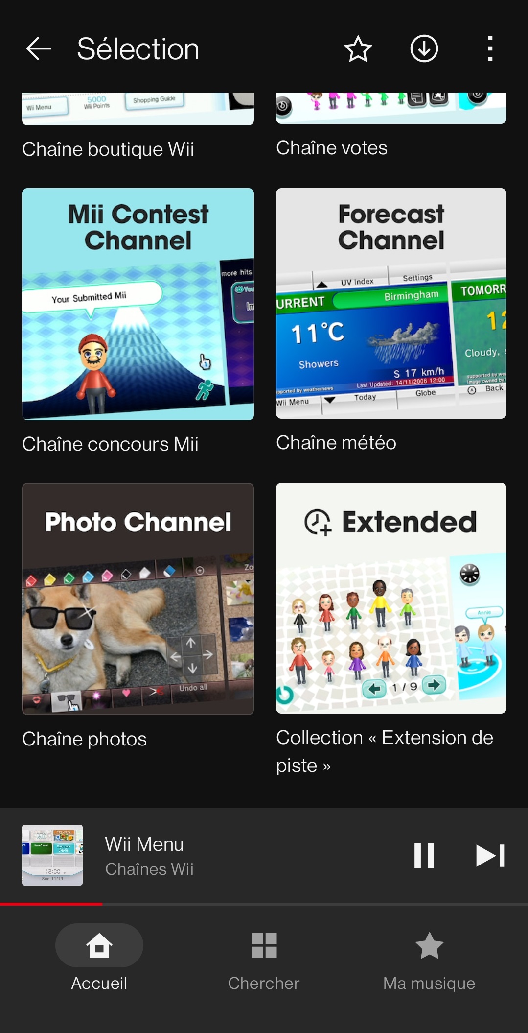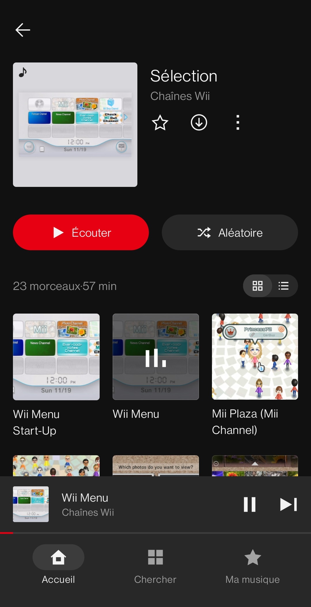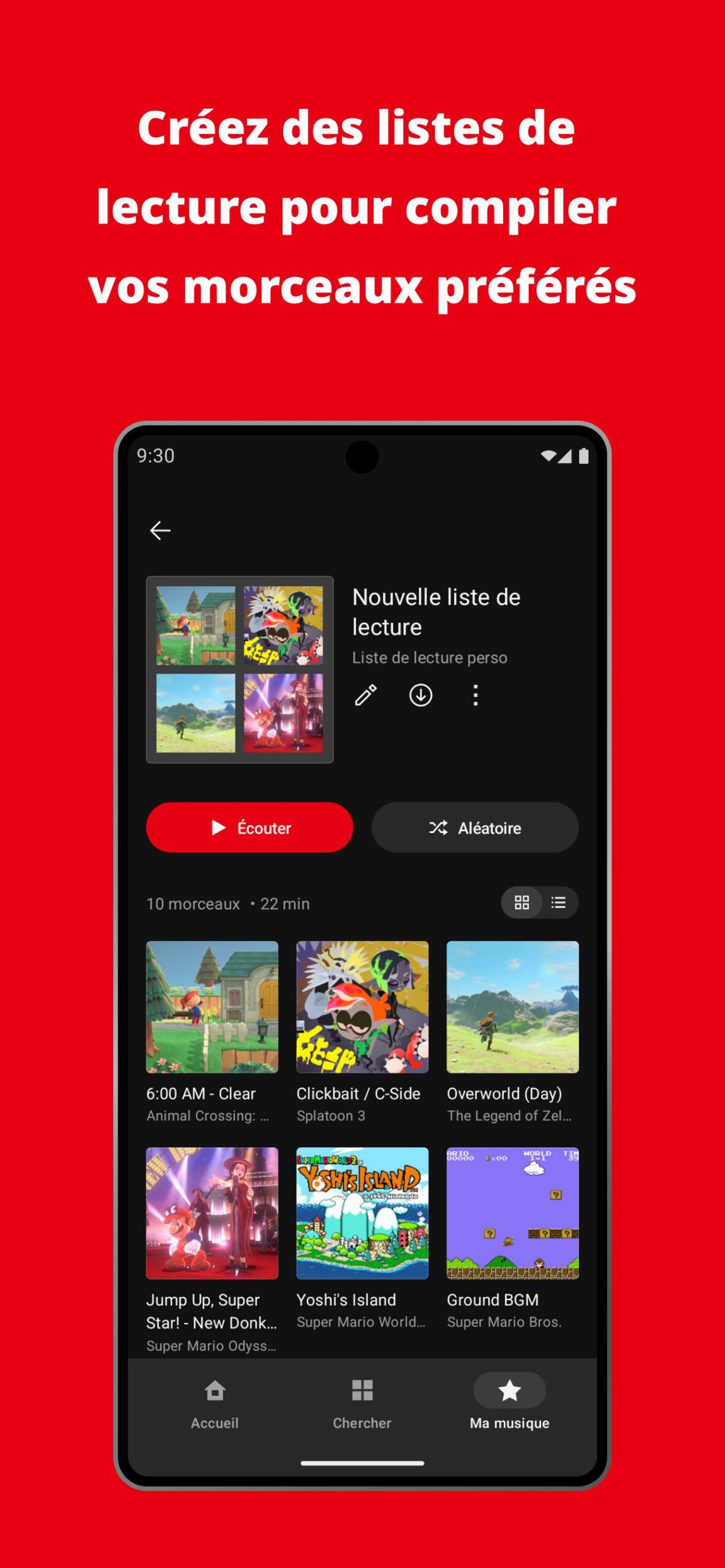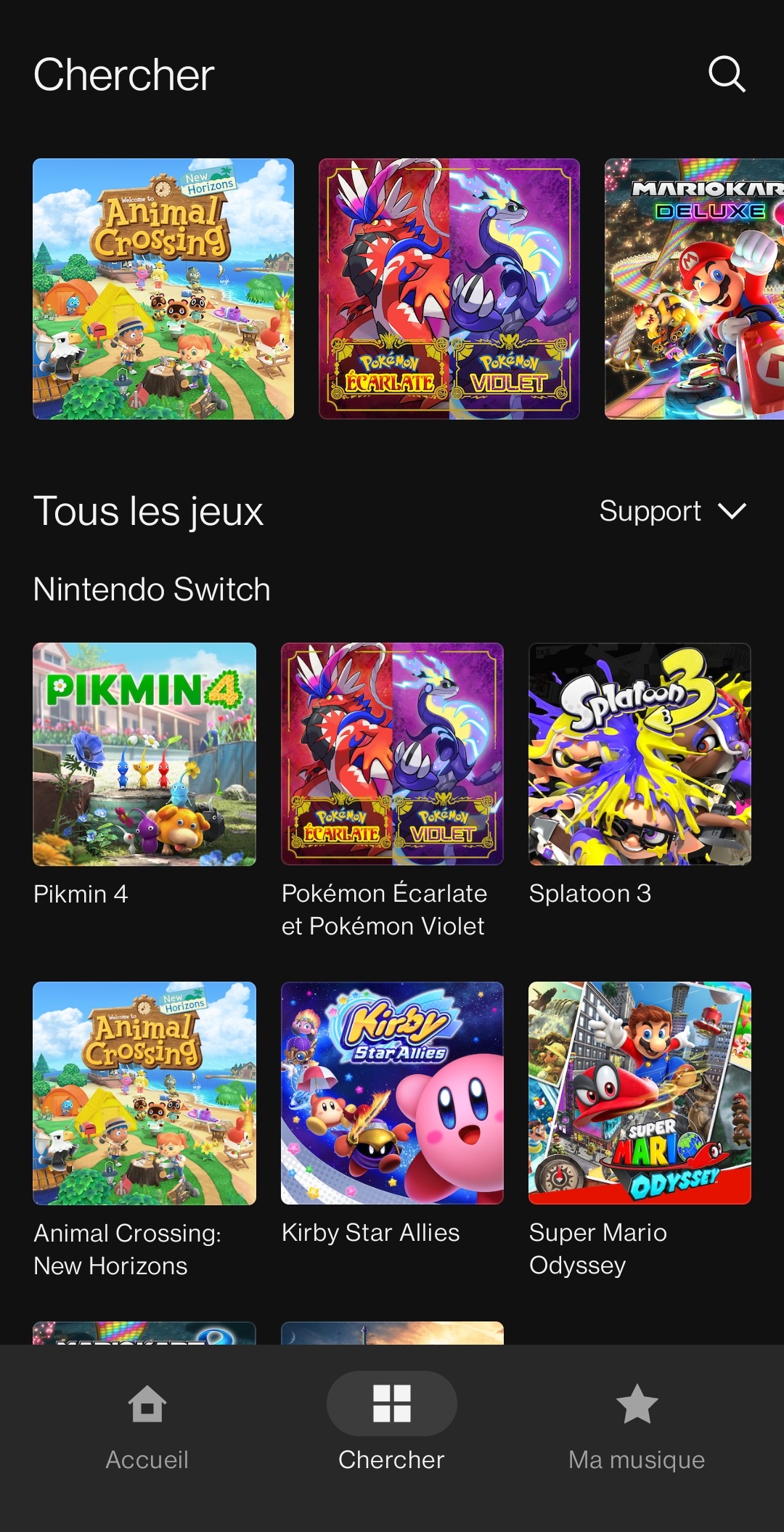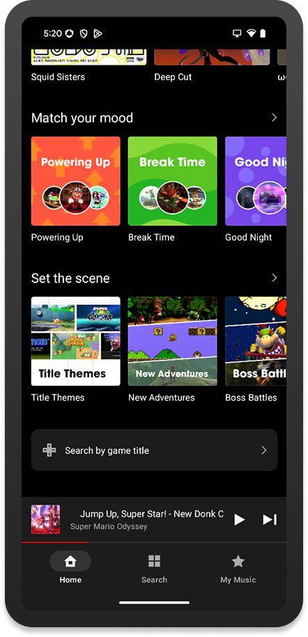 Sur l’écran d’accueil de l’application, on peut trouver une liste des écoutes récentes, des « classiques à redécouvrir » avec une sélection de certaines musiques pour les différents jeux dont les bandes originales sont disponibles, des recommandations, des pistes représentées par certains personnages, les artistes fictifs Splatoon, des collections pour nous accompagner pendant que l’on étudie ou travaille, des listes de lecture en vedette sélectionnées par Nintendo, des recommandations basées sur l’historique, des playlists qui seraient apparemment idéales pour certaines de nos humeurs (pour courir, marcher, prendre une pause, nous aider à dormir ou faire le plein d’énergie) et une sélection de thèmes (victoire, écrans titre, nouvelles aventures, combats contre des boss…).