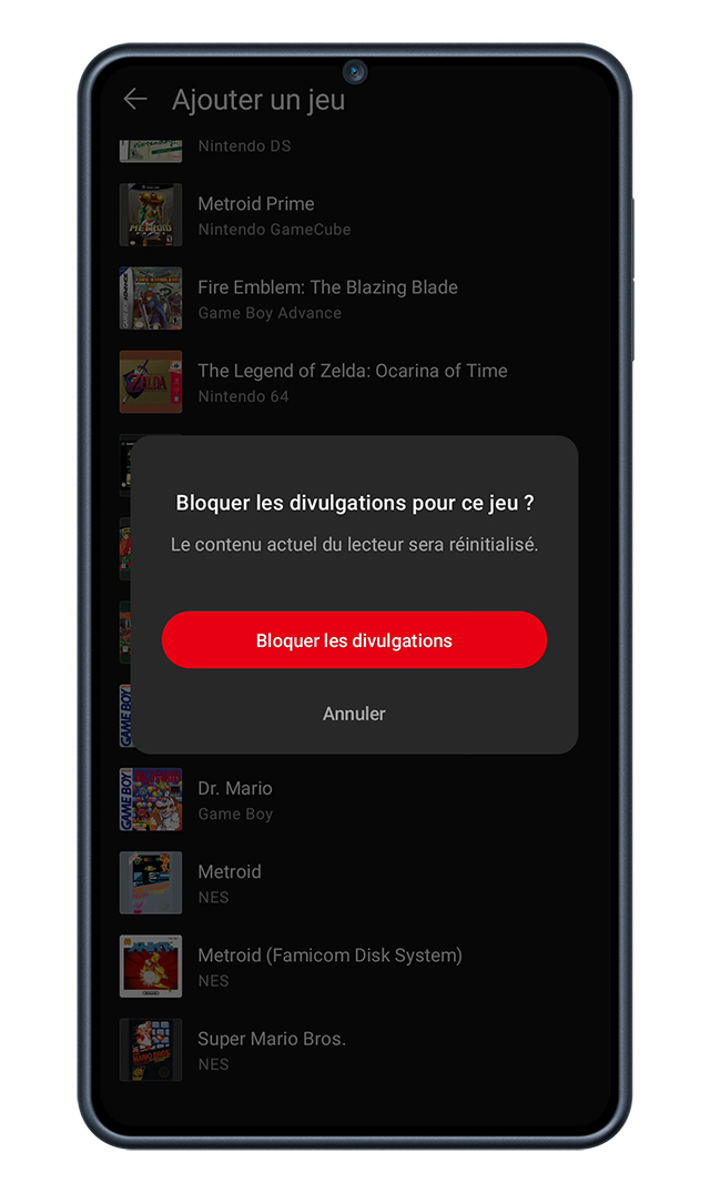 Dans les options, on peut également ajouter des divulgations bloquées. Cela signifie que l’on peut choisir les jeux dont on ne veut pas écouter les musiques afin d’éviter toute divulgation/spoiler. En effet, l’application liste, pour la plupart des jeux, l’ensemble des musiques et des images correspondant précisément à certaines pistes, et on peut donc facilement découvrir des éléments importants que l’on préférerait plutôt voir en jouant.