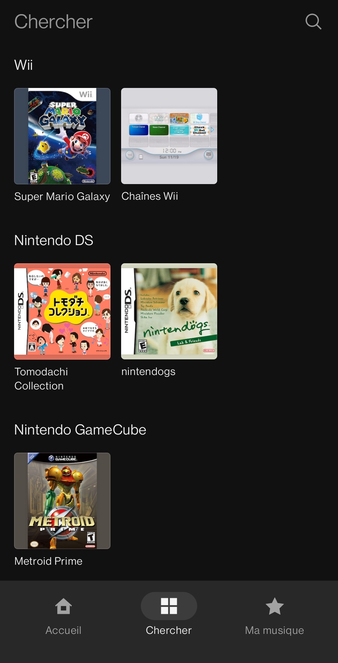 La fonction recherche permet de trouver des morceaux en fonction de leurs titres, des listes et des jeux. Il y a aussi la fonction Ma musique permettant de retrouver nos morceaux mis en favoris, les listes de lecture et les téléchargements.