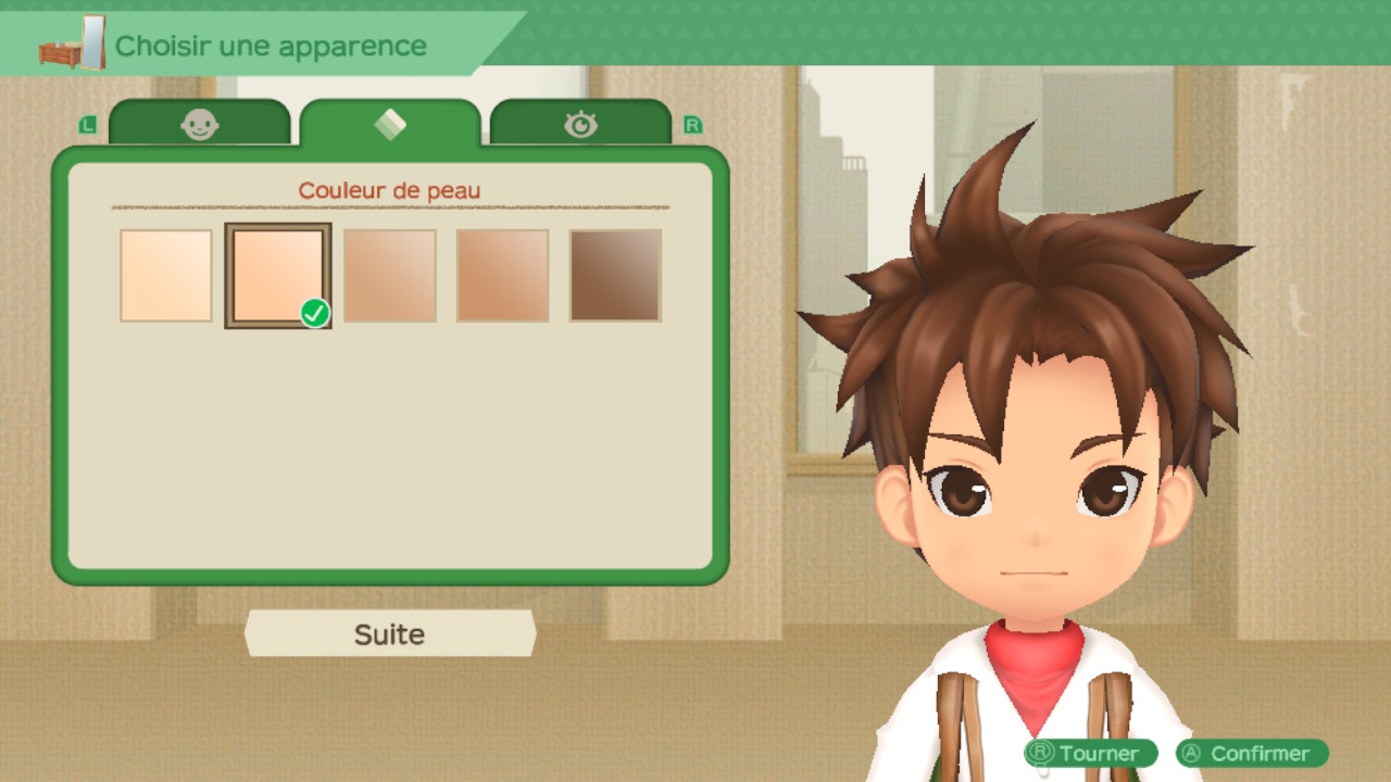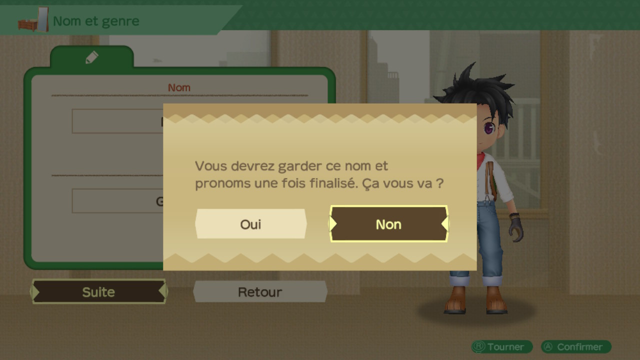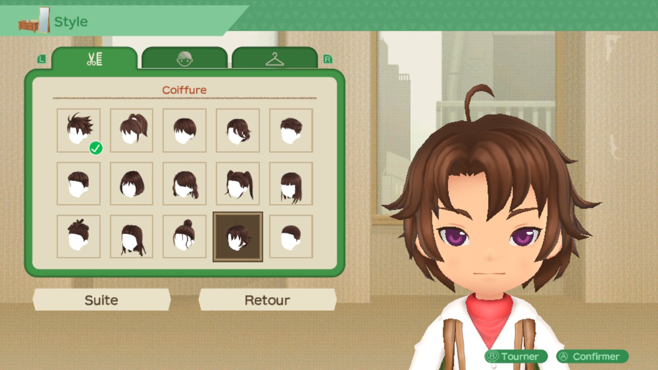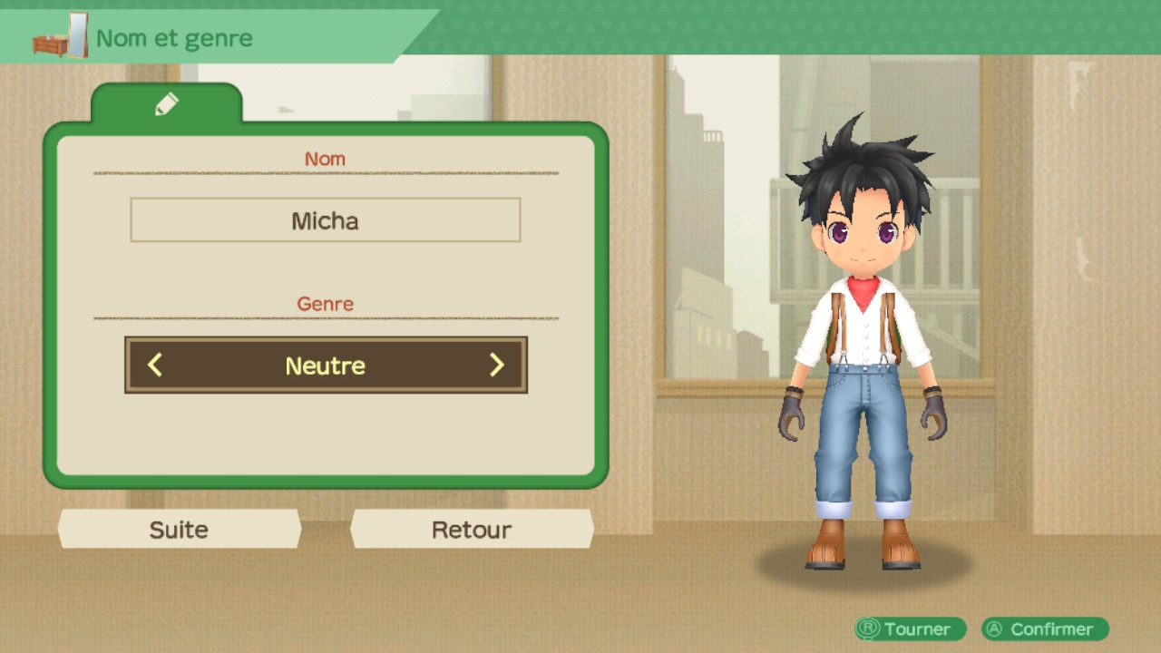 En plus de reprendre les bases du jeu d’origine sur GameCube, Story of Seasons : A Wonderful Life incorpore les éléments des derniers jeux de la série, à commencer par la personnalisation de notre avatar. Le jeu permet tout d’abord de choisir un type de visage, la couleur de peau et la couleur des yeux, puis la coiffure, la couleur des cheveux et une tenue. Il y a plusieurs options pour chaque élément, qui sont assez limitées dans l’ensemble mais efficaces et qui permettent de ne pas passer trop de temps sur l’écran de personnalisation. Comme nous le savions déjà, à la fin de la customisation, il y a trois choix pour le genre de notre personnage : garçon, fille ou neutre. La dernière option est donc une nouveauté pour cet épisode, plus que bienvenue dans une série comme Story of Seasons et surtout cet épisode en particulier, qui permet de vivre une longue vie et où l’on voit vieillir notre personnage. Chaque choix change les pronoms utilisés au cours du jeu, et il est impossible de faire une modification par la suite. Cependant, il reste possible de changer de style (coiffure, couleur de cheveux et tenue) par la suite dans la petite maison de l’avatar.