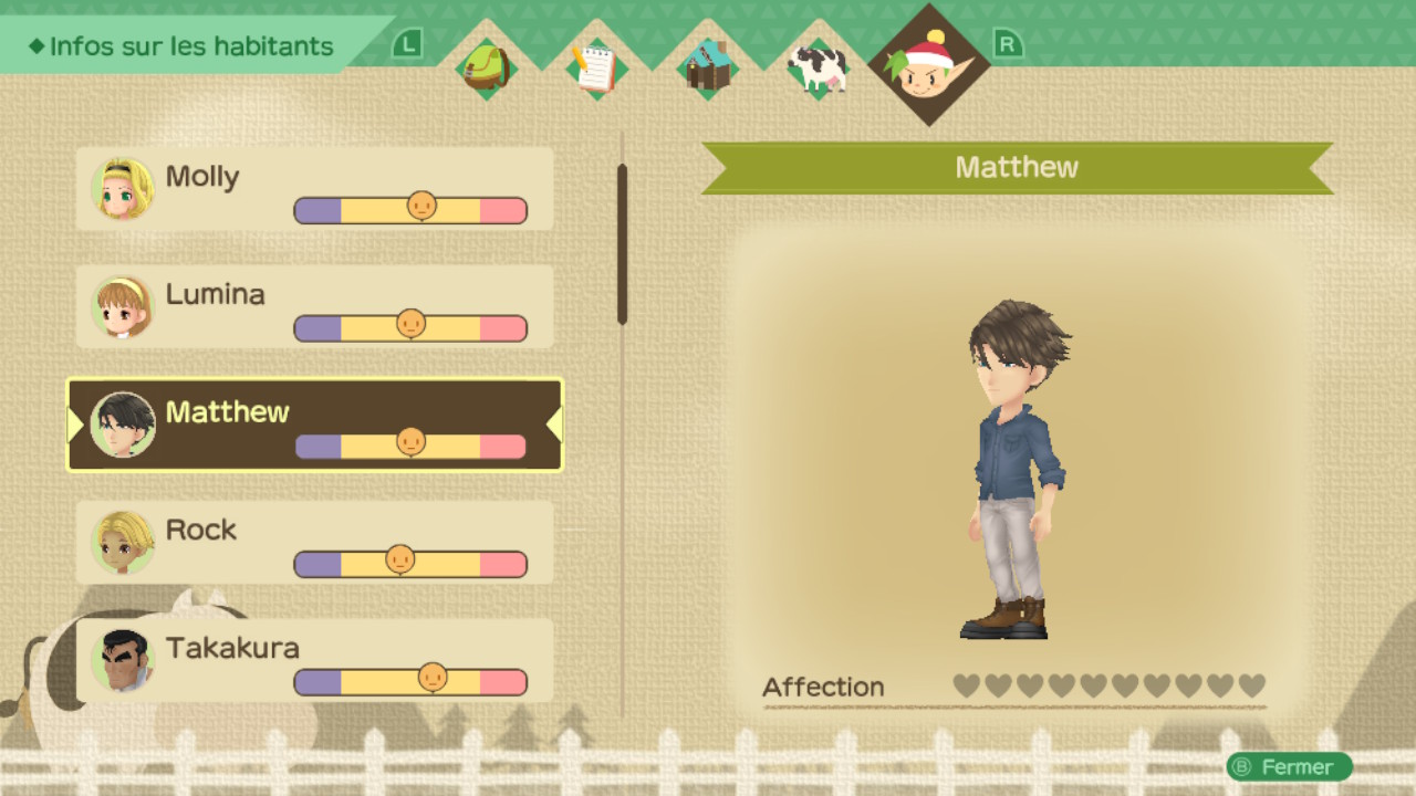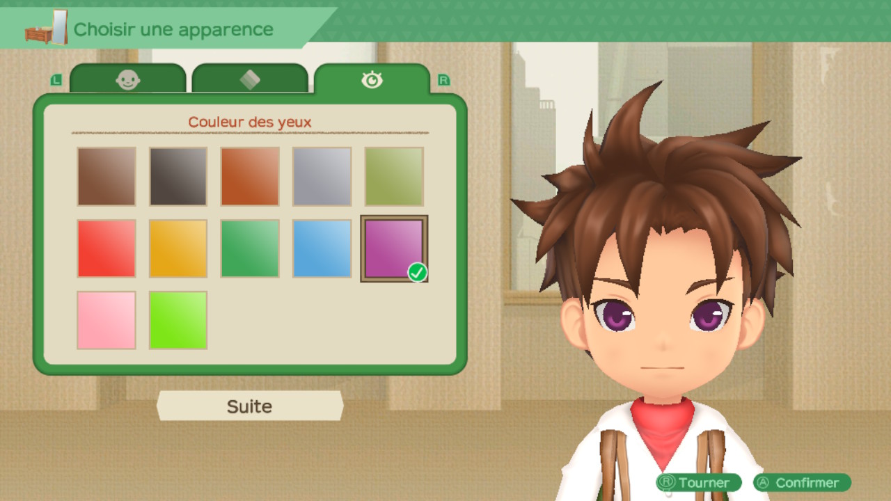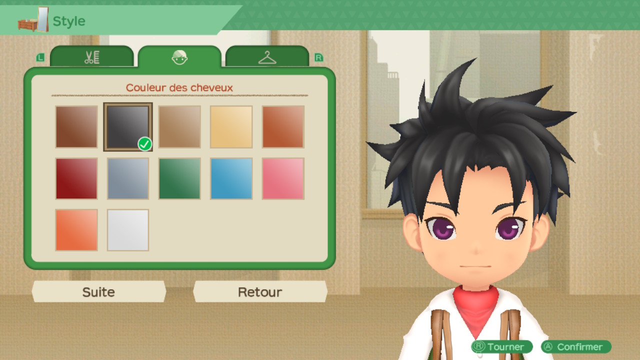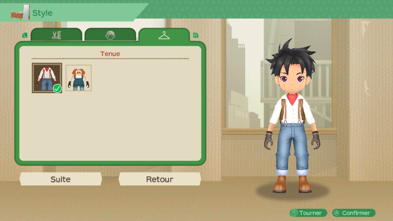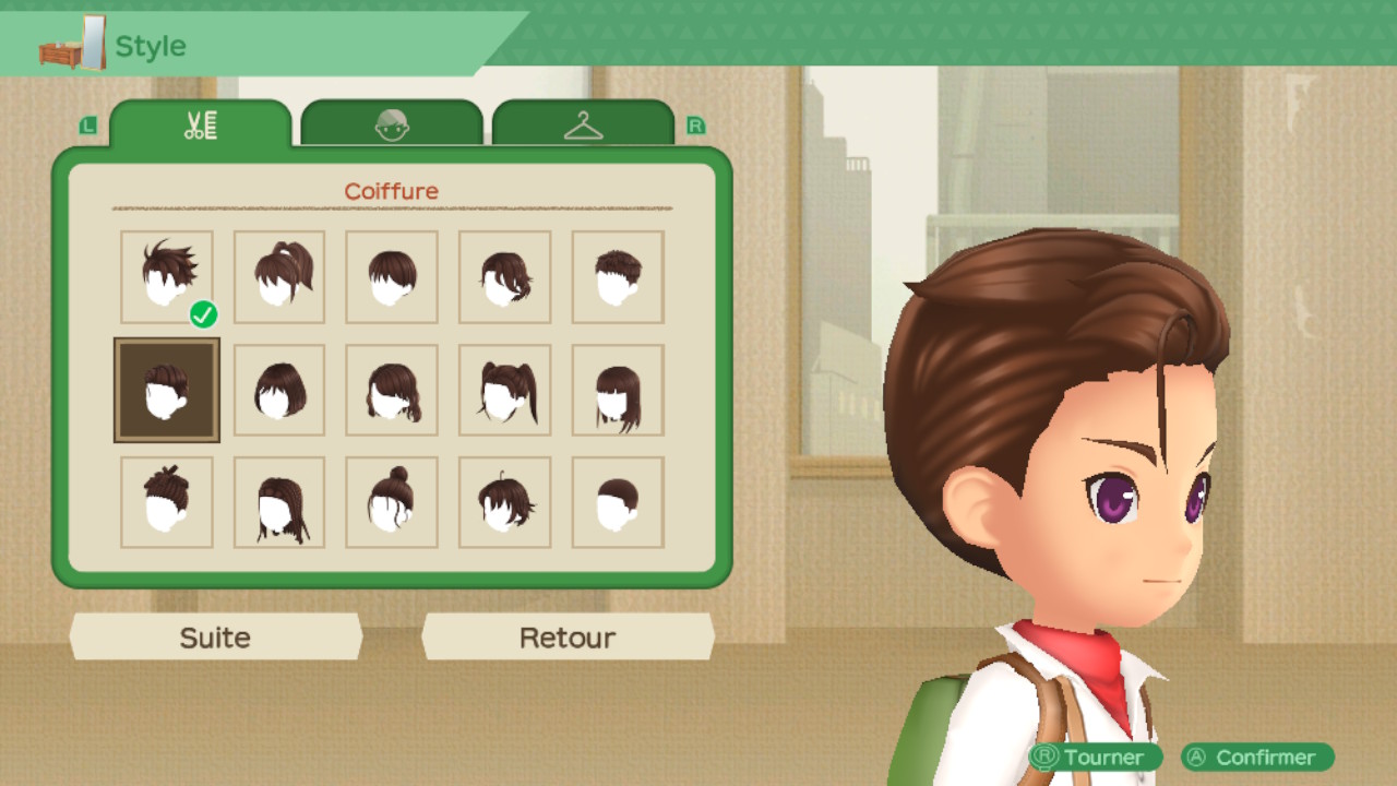 En plus de reprendre les bases du jeu d’origine sur GameCube, Story of Seasons : A Wonderful Life incorpore les éléments des derniers jeux de la série, à commencer par la personnalisation de notre avatar. Le jeu permet tout d’abord de choisir un type de visage, la couleur de peau et la couleur des yeux, puis la coiffure, la couleur des cheveux et une tenue. Il y a plusieurs options pour chaque élément, qui sont assez limitées dans l’ensemble mais efficaces et qui permettent de ne pas passer trop de temps sur l’écran de personnalisation. Comme nous le savions déjà, à la fin de la customisation, il y a trois choix pour le genre de notre personnage : garçon, fille ou neutre. La dernière option est donc une nouveauté pour cet épisode, plus que bienvenue dans une série comme Story of Seasons et surtout cet épisode en particulier, qui permet de vivre une longue vie et où l’on voit vieillir notre personnage. Chaque choix change les pronoms utilisés au cours du jeu, et il est impossible de faire une modification par la suite. Cependant, il reste possible de changer de style (coiffure, couleur de cheveux et tenue) par la suite dans la petite maison de l’avatar.