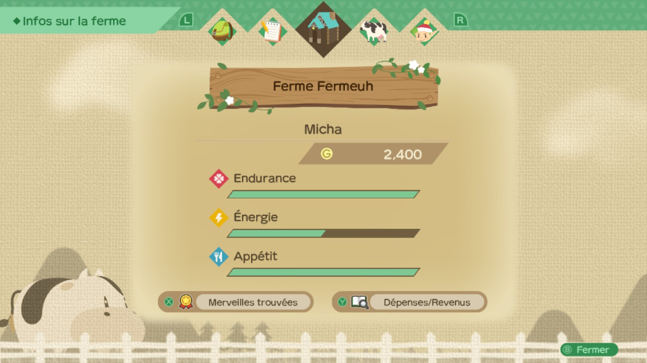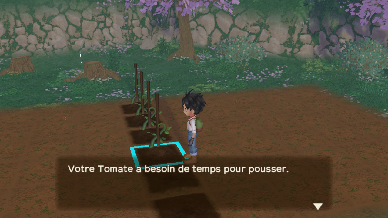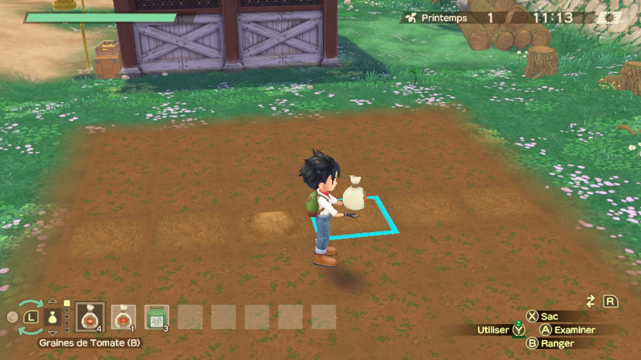 Les notes de Takakura conseillent d’apprendre à gagner notre vie, ce qui est effectivement important puisque l’argent ne coule pas à flots pour notre personnage. Il a tout de même quelques sous de côté au début de l’aventure, mais cela ne suffira pas pour payer les graines et commander des animaux par exemple. Il faut donc apprendre à labourer les champs, semer des graines et vendre nos cultures, ce qui aidera ensuite à construire plus de structures et à avancer plus efficacement, mais aussi à varier les activités durant chaque journée avec les bénéfices. Il faut noter que le travail à la ferme demande de l’endurance. Si l’on fait trop de choses dans une journée, cela se verra dans la barre d’endurance de notre personnage, qui se videra vide dans ce cas, surtout s’il commence à être fatigué (une icône apparaît sur la barre). Il faut donc lui faire manger des plats, que l’on peut heureusement cuisiner, à condition d’avoir les ingrédients adéquats et/ou les recettes. La barre d’endurance se remplit aussi en mangeant simplement des aliments.