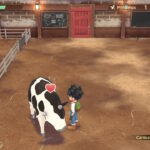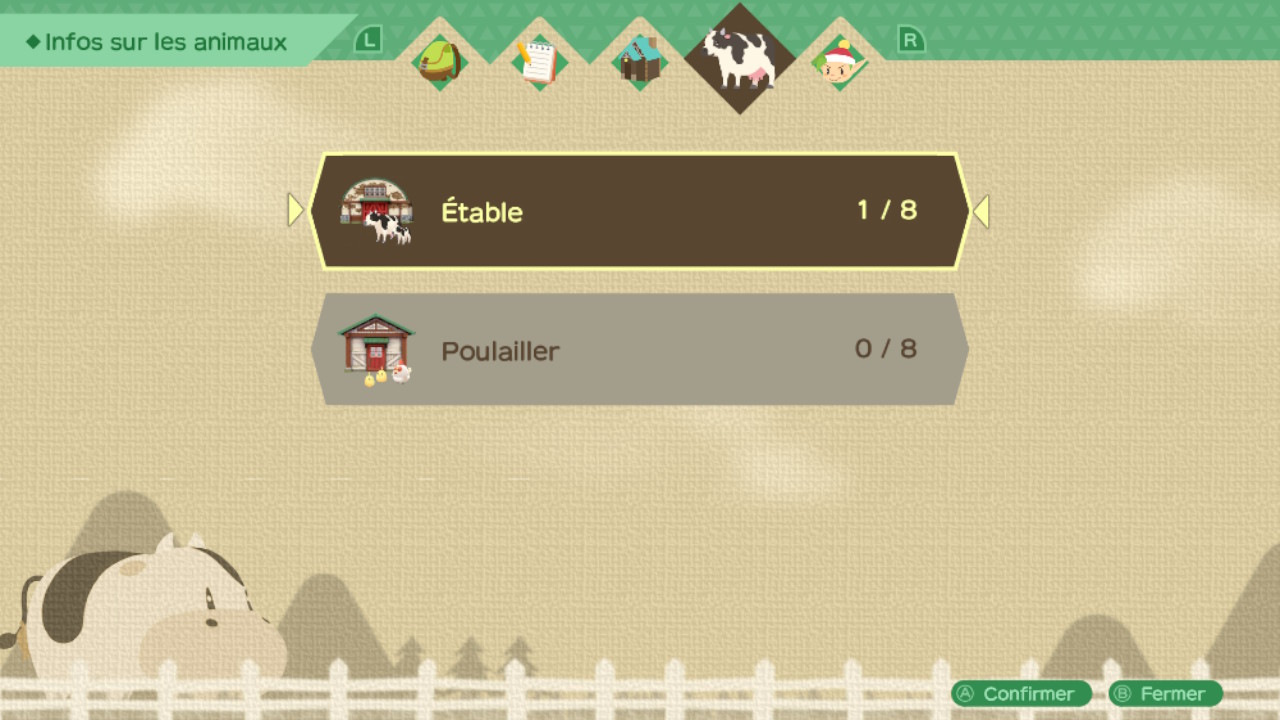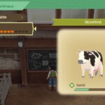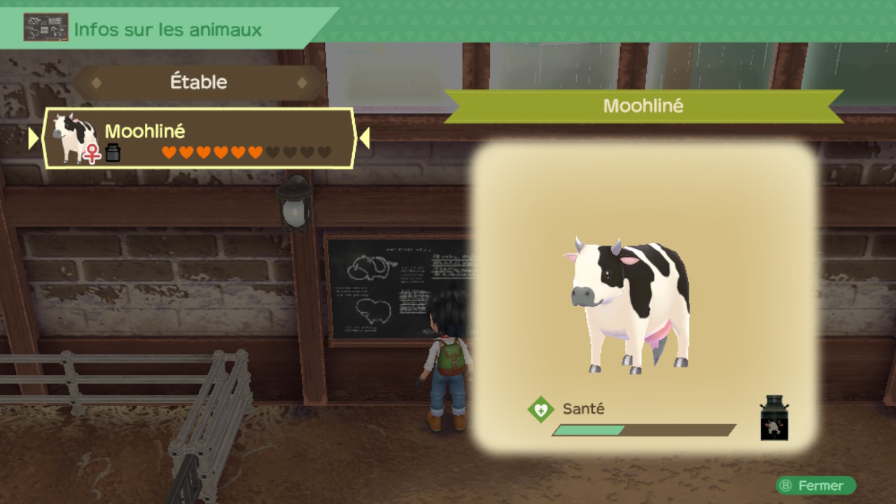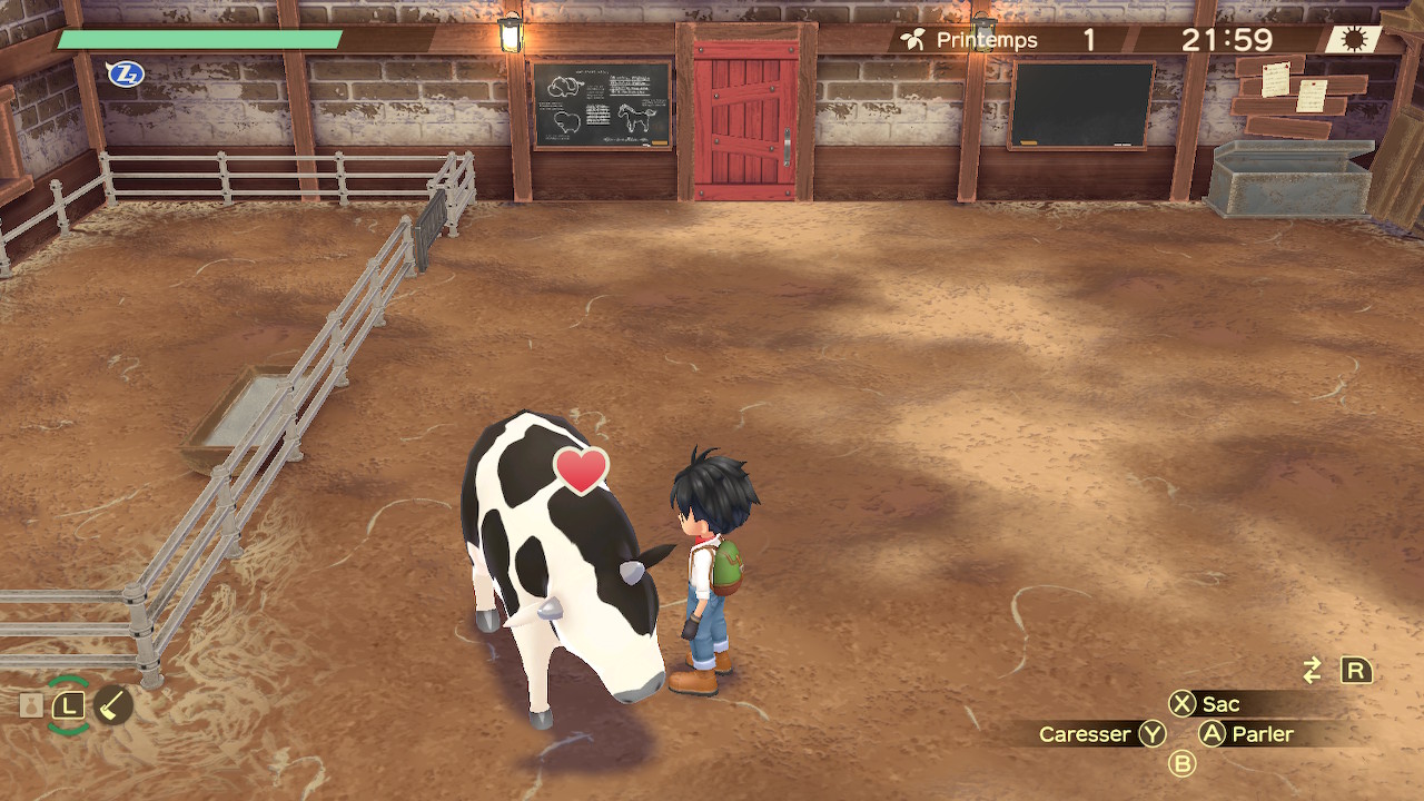 Au début de l’aventure, si l’on veut se concentrer sur plusieurs activités à la fois, le rythme est d’autant plus lent, puisqu’il faut avoir de l’argent pour à peu près tout. Ainsi, la ferme n’aura pas beaucoup d’animaux au début du jeu. Cependant, c’est un point très important de Story of Seasons : A Wonderful Life. Il y a une étable et un poulailler, et chaque animal doit être nourri chaque jour, ce qui permettra d’obtenir des sous-produits comme du lait et des œufs. Il faut aussi parler aux animaux, les caresser et les brosser pour les rendre heureux et améliorer la qualité des produits obtenus. On peut avoir plusieurs vaches, des moutons, des chèvres, un cheval, des poules… Toutes les activités du jeu demandent beaucoup de temps, mais il y a encore plus de choses à savoir au sujet des animaux. Déjà, au sujet des vaches, il faut prendre en compte leur type (ordinaires, brunes, tachetées ou étoiles), puisqu’en fonction des races, le lait produit est d’une qualité différente. L’étable peut accueillir seulement 8 animaux, mais après avoir suffisamment avancé dans l’aventure, le nombre sera doublé. Au début, l’étable est directement équipée d’un distributeur de fourrage, dont la distribution quotidienne (deux fois par jour au mieux) est obligatoire pour la santé des vaches et la qualité du lait obtenu. Il y a même un espace d’isolement prévu pour la mise bas des animaux en gestation. On peut aussi sortir les animaux s’il fait beau dehors, pour qu’ils mangent de l’herbe (comme ça, il n’y aura pas besoin de les nourrir en journée) et pour les rendre encore plus heureux. Et bien sûr, les poules peuvent pondre des œufs (mais au début du jeu, il y a seulement une vache, il faut se débrouiller pour le reste).