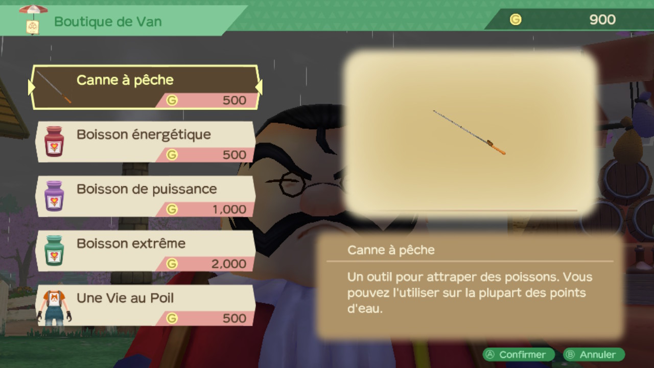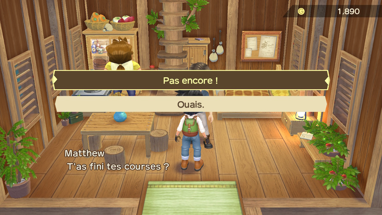 Une fois de l’argent obtenu, on peut acheter des graines facilement et passer des commandes. Les commandes consistent à acheter des animaux, des saillies, de la nourriture et de nouvelles structures. Il est aussi possible de vendre des animaux, sauf les femelles gestantes. Parmi les structures que l’on peut acheter, il y a la salle de traitement de lait pour transformer le lait en beurre et en fromage, la machine à graines qui permet de transformer une seule culture en deux graines, la machine à engrais qui transforme un élément dont on n’a plus besoin en cinq sacs d’engrais, ou encore le réservoir à engrais qui répand automatiquement de l’engrais deux fois par jour. On peut aussi installer notre propre boutique au village (il est conseillé de le faire en journée pour que les clients viennent plus facilement), faire des courses (acheter des graines à la ferme de Vesta ou aller au Café du Merlebleu pour manger sans avoir à cuisiner) ou faire des affaires avec Van le marchand ambulant qui vient seulement les 3e et 8e jours du mois. Bien d’autres activités s’offrent à nous, comme les requêtes du panneau d’affichage qui permettent au passage d’améliorer nos relations avec les personnages et de faire avancer l’aventure, ou encore la pêche (à condition d’avoir une canne, que l’on peut acheter à Van). Au début du jeu, on a directement accès à la houe, à la faucille, à l’arrosoir, à la trayeuse et à l’appareil photo. Le reste, comme la canne à pêche, la brosse et les forces sont à débloquer au cours du jeu.