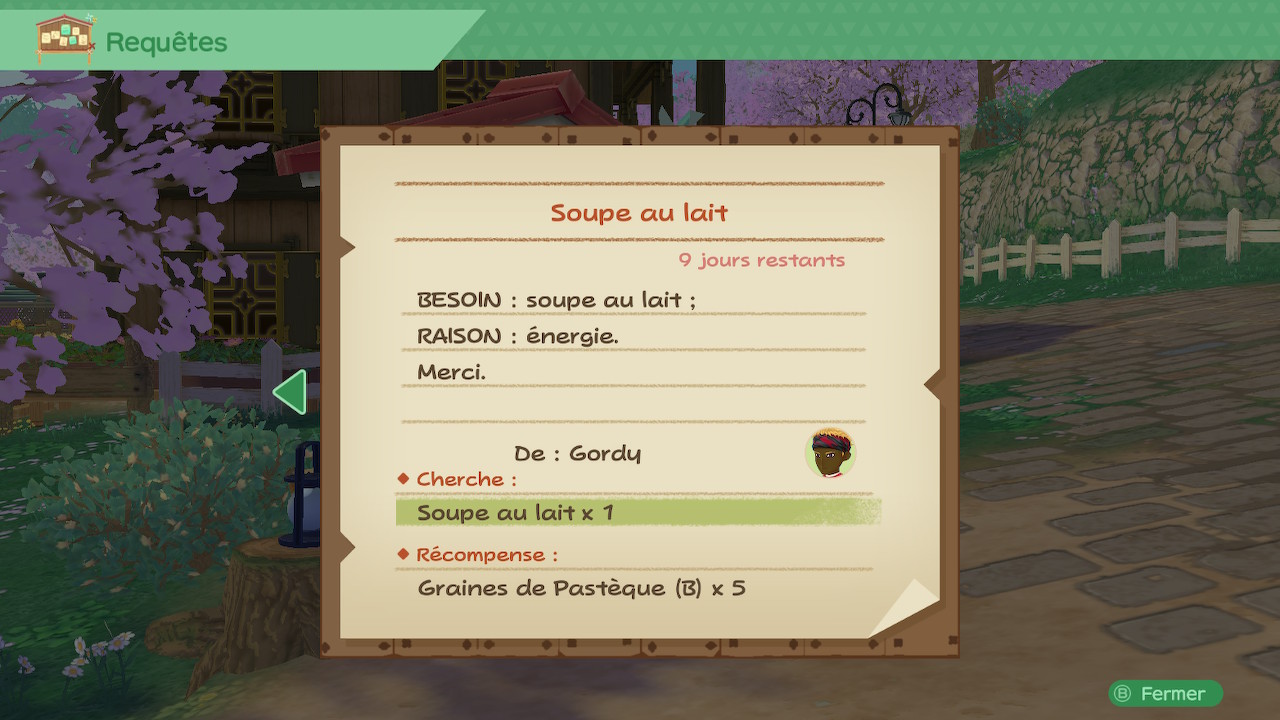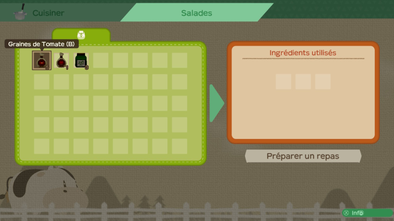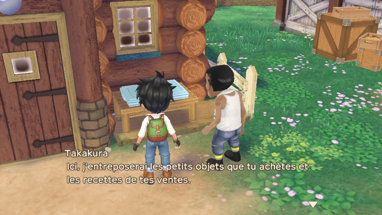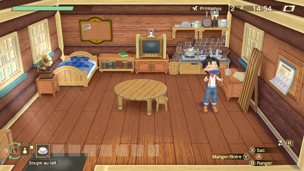 Pour cuisiner, il faut se rendre à la maison. L’interface est très simple et efficace, et on peut débloquer assez facilement des recettes en visitant les maisons du village. Au début de l’aventure, on peut ramasser des fleurs, cuisiner des plats assez limités, cultiver assez peu d’aliments (d’autant plus qu’il faut prendre en compte la saison), ou encore extraire des objets au site de fouilles. Pour gagner de l’argent, il faut vendre, et pour cela, il existe surtout les expéditions pour commencer. On peut expédier les cultures et les produits laitiers en les mettant dans une boîte d’expédition. Au début, on ne peut pas avoir accès facilement aux cultures, puisqu’il faut attendre plusieurs jours. Il faut donc se concentrer sur le lait de notre vache, et faire attention à bien la nourrir pour obtenir du lait de bonne qualité, car s’il est de qualité ordinaire, il ne sera pas possible de le vendre. Takakura expédiera le tout pour le vendre en ville chaque matin et on recevra l’argent dans la boîte prévue à cet effet à côté de notre maison.