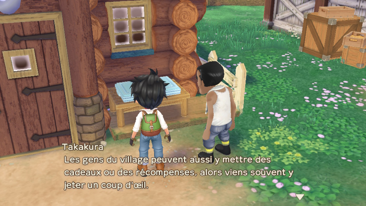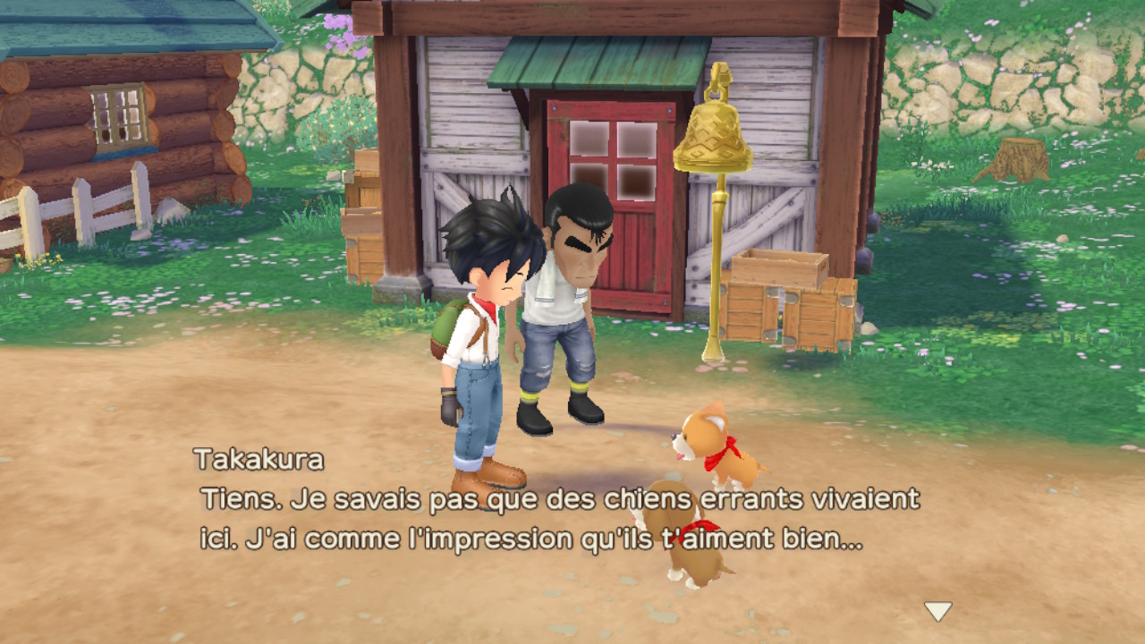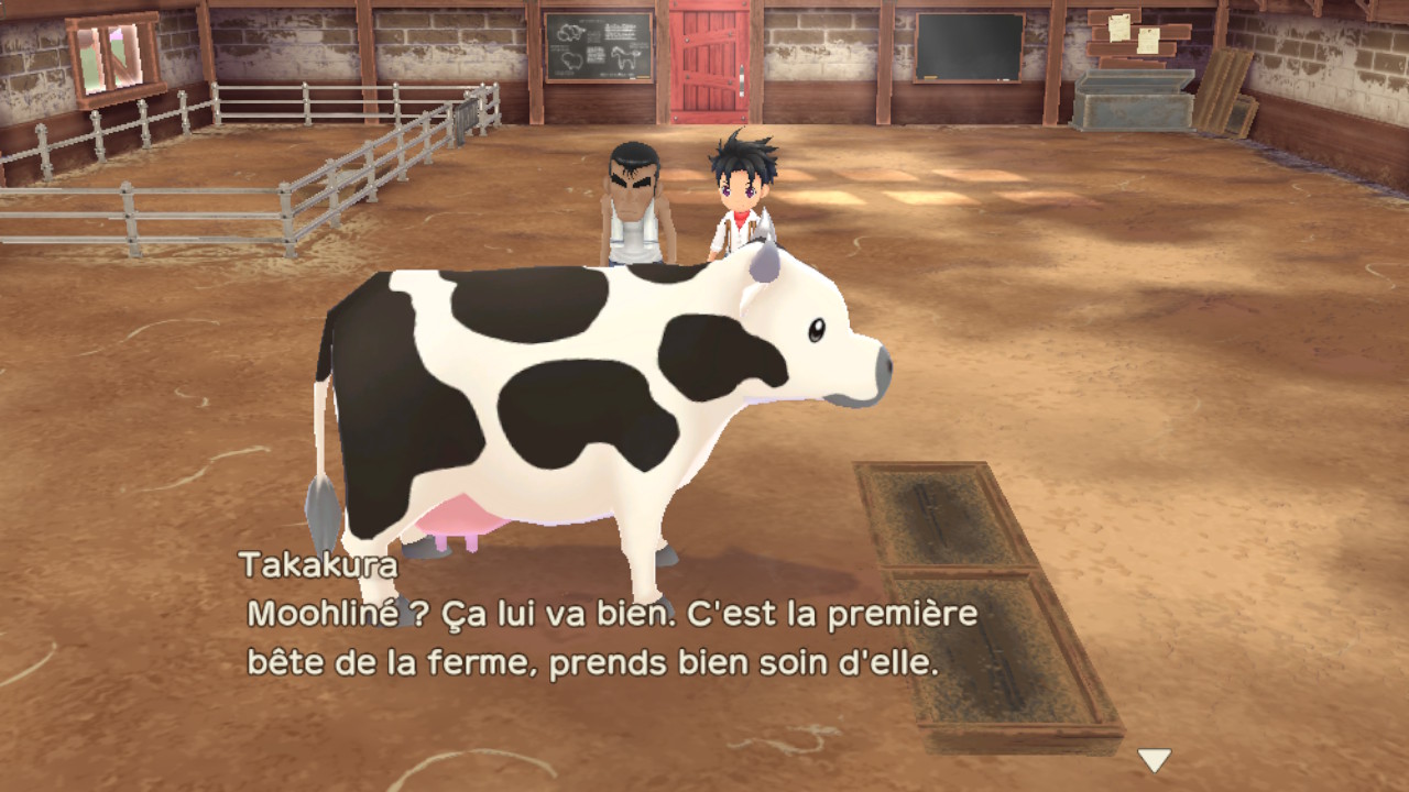 Après la personnalisation de l’avatar, il ne faut pas attendre longtemps avant de se lancer dans la vie à la Vallée oubliée. Un personnage du nom de Takakura nous montre la ferme dont il faudra s’occuper, avec une présentation brève des activités et des structures. Il y a peu d’animaux au début du jeu, on nous attribue seulement un chien (aux oreilles droites ou tombantes, au choix) à qui on doit donner un nom ainsi qu’une vache (qu’il faut aussi nommer), avant que l’on puisse baptiser la ferme. Le chien, la vache et la ferme n’ont pas de nom par défaut, de même pour notre personnage, il faut donc faire preuve d’imagination. Takakura finit son introduction par un passage très bref devant certains bâtiments du village, où l’on peut voir aussi quelques personnages. L’aventure commence très vite et il convient de noter qu’il n’y a aucun tutoriel en compagnie de Takakura ou d’un autre personnage. En effet, pour apprendre toutes les bases, il faut lire les notes de Takaruka, très facilement accessibles à partir du menu système (en appuyant sur +). On nous conseille tout de même brièvement certaines activités au début du jeu, puis certaines pages des notes de Takakura s’ouvrent. On peut apprendre ainsi les bases à la volée, mais il y en a bien d’autres à lire.