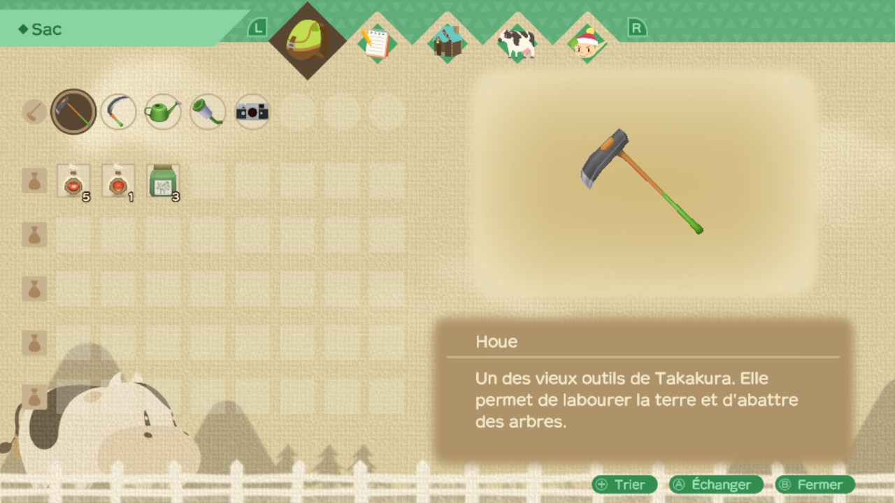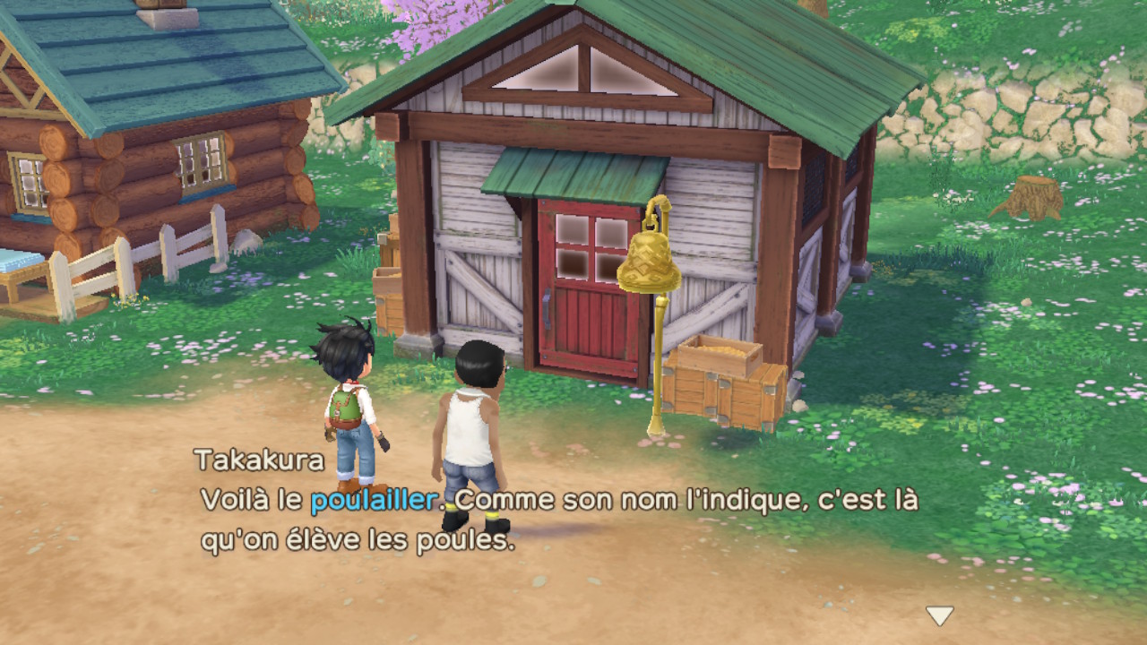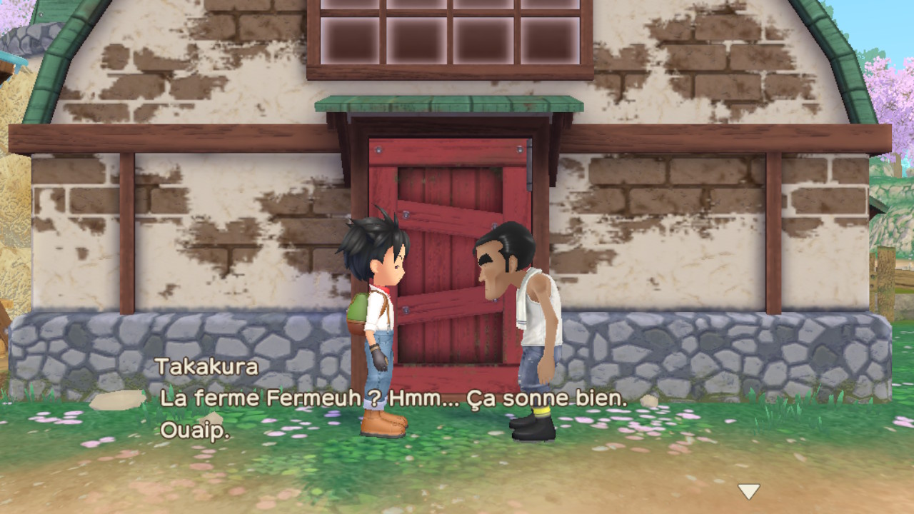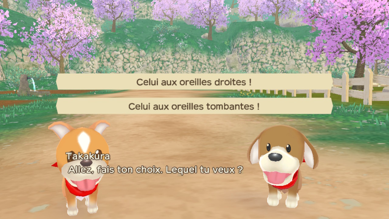 Après la personnalisation de l’avatar, il ne faut pas attendre longtemps avant de se lancer dans la vie à la Vallée oubliée. Un personnage du nom de Takakura nous montre la ferme dont il faudra s’occuper, avec une présentation brève des activités et des structures. Il y a peu d’animaux au début du jeu, on nous attribue seulement un chien (aux oreilles droites ou tombantes, au choix) à qui on doit donner un nom ainsi qu’une vache (qu’il faut aussi nommer), avant que l’on puisse baptiser la ferme. Le chien, la vache et la ferme n’ont pas de nom par défaut, de même pour notre personnage, il faut donc faire preuve d’imagination. Takakura finit son introduction par un passage très bref devant certains bâtiments du village, où l’on peut voir aussi quelques personnages. L’aventure commence très vite et il convient de noter qu’il n’y a aucun tutoriel en compagnie de Takakura ou d’un autre personnage. En effet, pour apprendre toutes les bases, il faut lire les notes de Takaruka, très facilement accessibles à partir du menu système (en appuyant sur +). On nous conseille tout de même brièvement certaines activités au début du jeu, puis certaines pages des notes de Takakura s’ouvrent. On peut apprendre ainsi les bases à la volée, mais il y en a bien d’autres à lire.