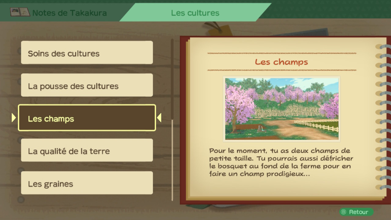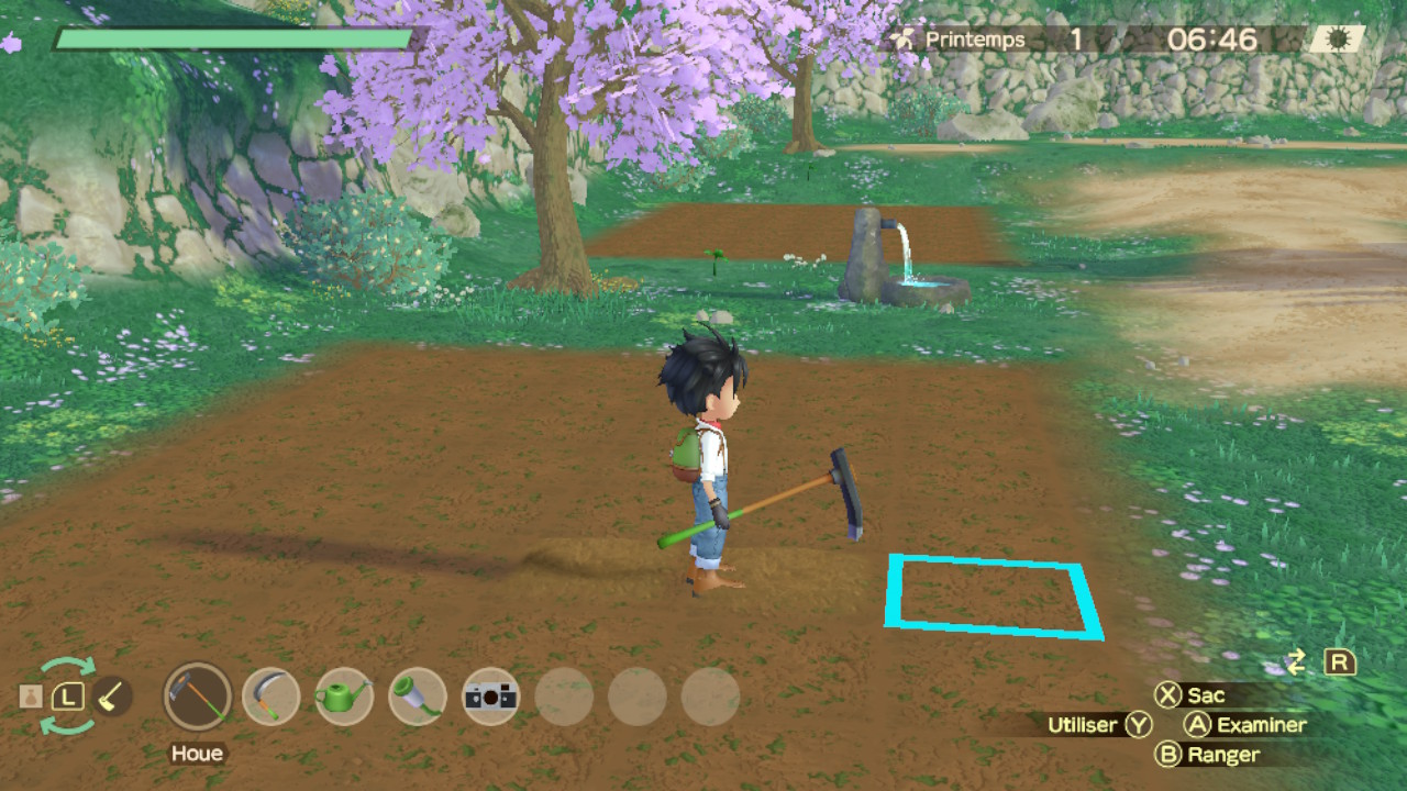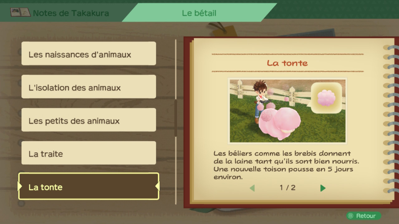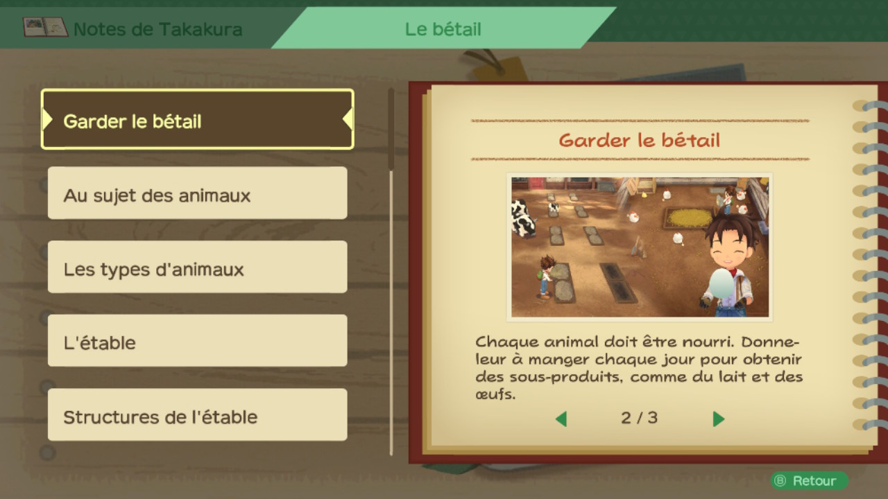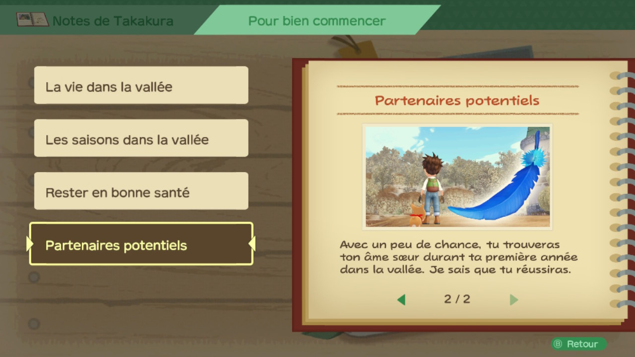 Pour bien commencer dans la Vallée oubliée, il est important d’apprendre ce qu’il y a à savoir au sujet de l’agriculture, les saisons, la santé de notre avatar, la ferme, le bétail, la vente de produits, les commandes ou encore les outils. Si l’on débute dans la série ou si ces notes ne sont pas lues, on peut facilement errer sans but dans la Vallée oubliée et s’ennuyer rapidement. En lisant attentivement ce qu’il y a à savoir, l’aventure se dessine petit à petit et on prend du plaisir à visiter la Vallée oubliée et à rencontrer les différents personnages. La direction artistique de ce jeu et de ce remake est assez simple, et le fait de commencer au printemps permet de profiter de journées assez variées, où il peut pleuvoir deux jours de suite par exemple.