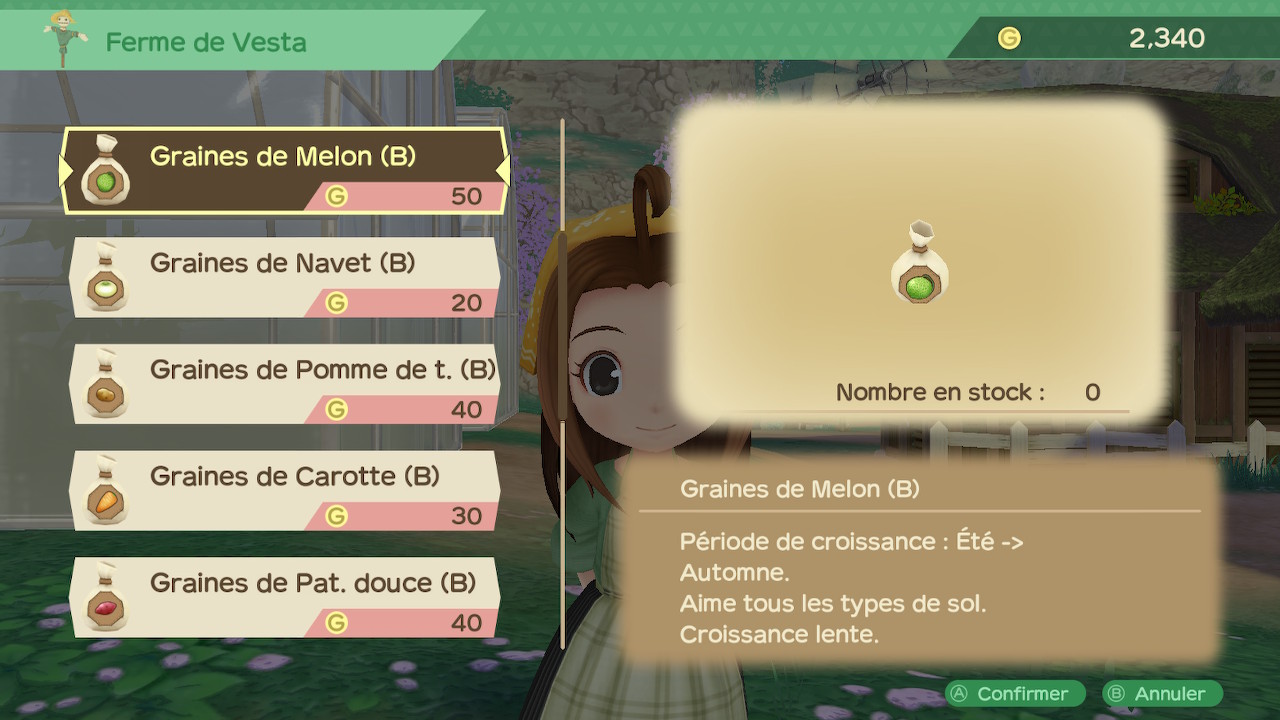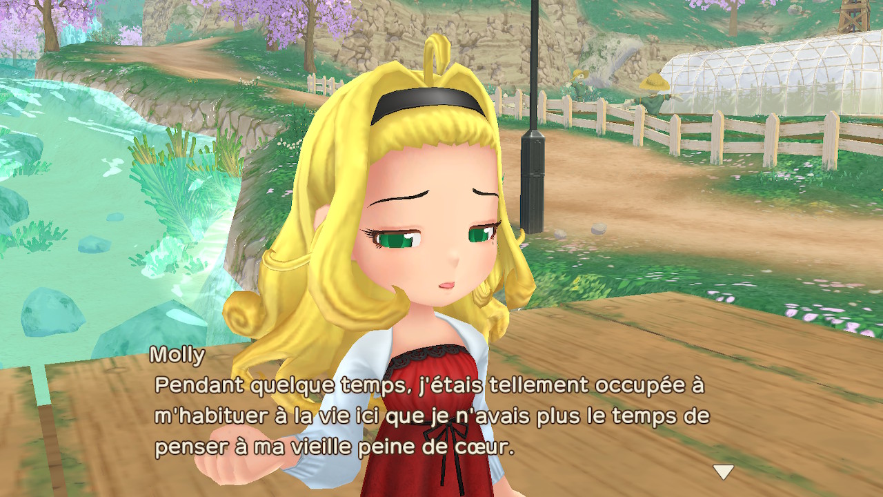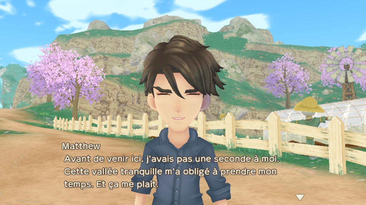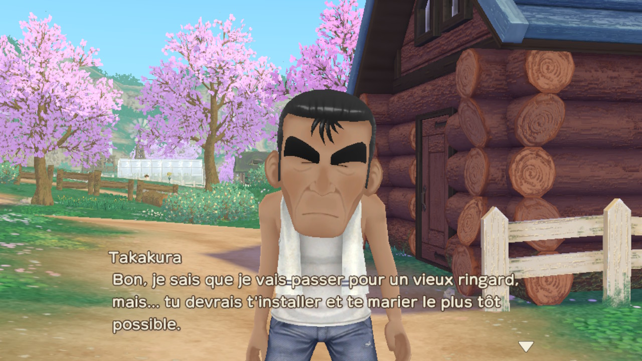 Ce premier contact avec Story of Seasons : A Wonderful Life a donc été convaincant, mais il faut bien comprendre que le rythme de l’aventure est assez lent. Ne pas le savoir et s’attendre à être tenu par la main pour apprendre ce qu’il y a à savoir sur la vie à la ferme peut devenir très vite frustrant. Cet épisode donne à la fois de la liberté dans les mouvements à la Vallée Oubliée tout en imposant des restrictions au début de l’aventure. Comme notre avatar n’a pas beaucoup d’argent et qu’il faut attendre pour faire pousser les cultures et obtenir de bons produits, les possibilités sont peu nombreuses. On n’a pas beaucoup de cadeaux à offrir aux personnages, on ne sait donc pas trop comment s’y prendre pour renforcer les liens avec les partenaires potentiels, et comme les nouvelles scènes mettent du temps avant d’être débloquées, les discussions peuvent paraître répétitives. Mais une fois que l’on a bien compris toutes les bases, que tout a bien poussé et que notre personnage arrive à obtenir beaucoup d’argent, l’aventure commence à se dessiner et on se surprend à passer beaucoup de temps à explorer le village.