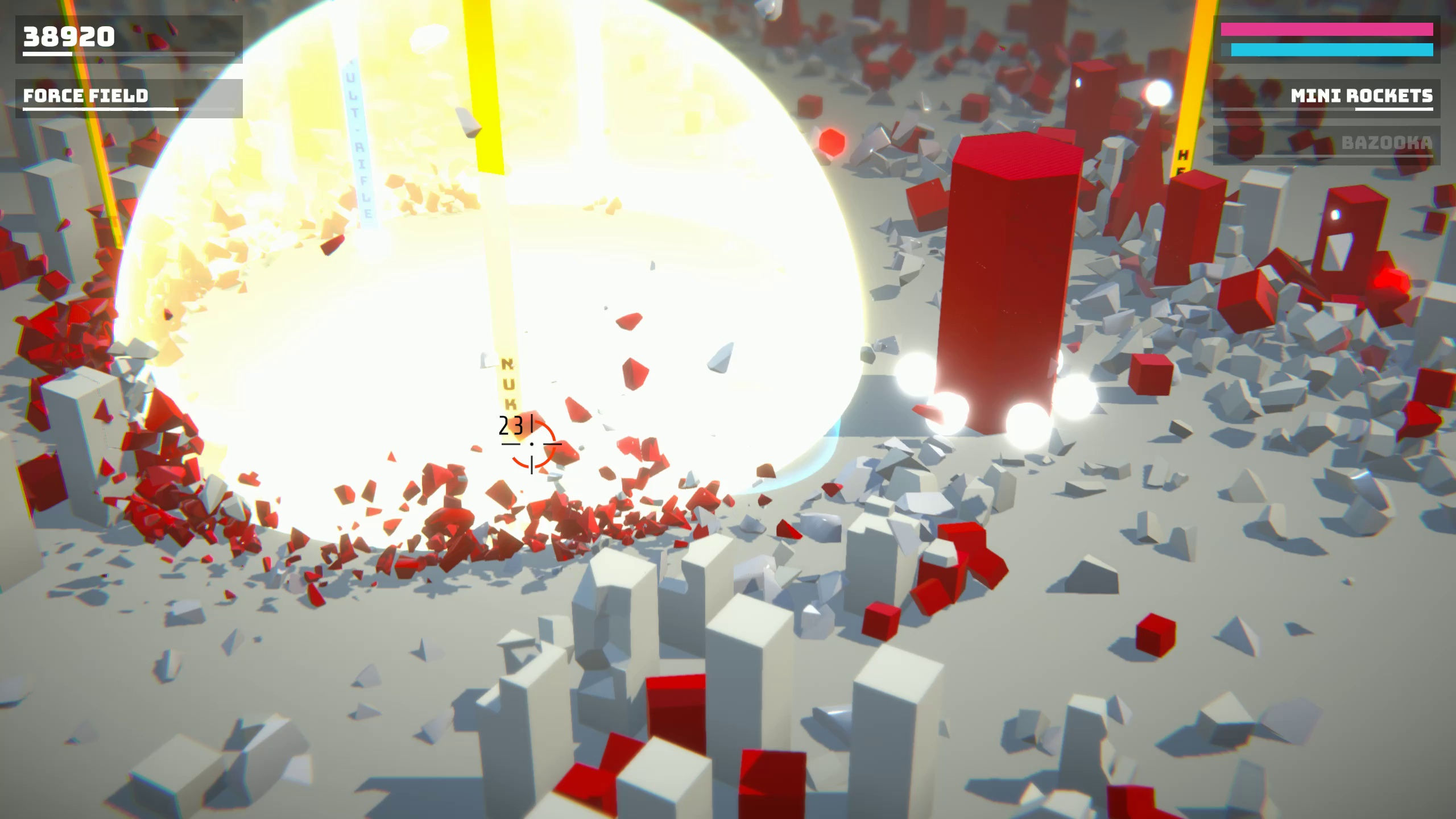 Le principe ici est simple : survivre le plus longtemps possible à des vagues d’ennemis polygonaux de plus en plus denses en esquivant les coups et en canardant allégrement tout ce petit monde avec différentes armes récupérées sur le terrain, sachant qu’on peut également ramasser des améliorations temporaires et acquérir des compétences supplémentaires en grimpant de niveau. Le jeu ne propose certes qu’un seul mode de jeu et un seul environnement, mais les décors s’avèrent totalement destructibles et il est possible de se lancer dans l’aventure jusqu’à trois en local. De plus, si l’objectif principal sera de réaliser le meilleur score afin de grimper dans le classement en ligne, un système de progression général permet de débloquer progressivement de nouvelles armes et de nouvelles compétences à obtenir ensuite durant les parties.