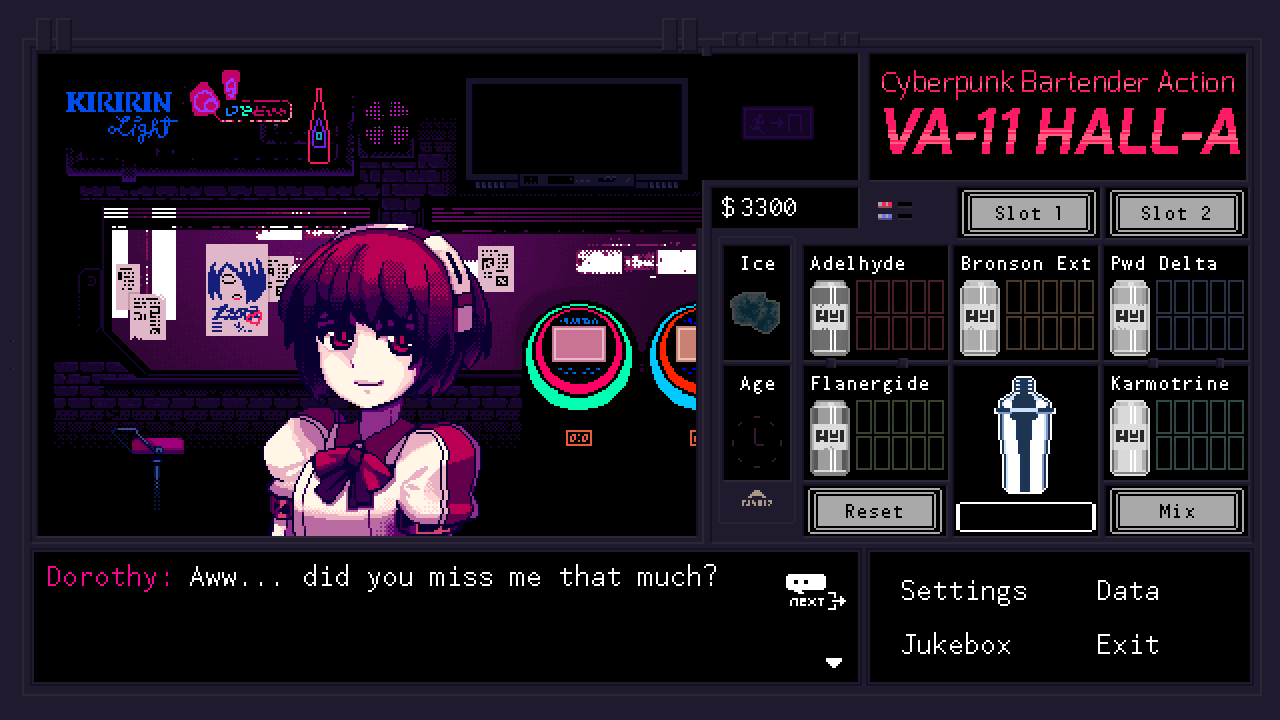 Très apprécié pour son atmosphère, ses personnages et ses dialogues, VA-11 Hall-A : Cyberpunk Bartender Action, aussi nommé Valhalla, est un jeu de simulation de barman avec des éléments de visual novel, de cyberpunk et de visuels inspirés des anime et des vieux jeux d’aventure japonais sur PC-98. Le titre a été développé entre 2014 et 2016 par Sukeban Games, un petit studio indépendant venant du Venezuela, dont les développeurs, qui vivent donc dans un pays pauvre, ont aussi puisé leurs influences dans leurs expériences personnelles. Dans VA-11 Hall-A, on incarne Jill, barman au VA-11 Hall-A (Valhalla), un petit bar situé dans un centre-ville dystopique, qui attire les personnes les plus chelous qu’on puisse imaginer. Dans ce monde, les sociétés règnent en maître, tous les humains ont été infectés par des nanomachines destinées à les opprimer, et les White Knights s’assurent que tout le monde obéit aux lois. Cependant, le scénario se concentre principalement sur les personnages que l’on rencontrera au bar. Le gameplay consiste à concocter et à servir des boissons aux clients, tout en écoutant leurs histoires.