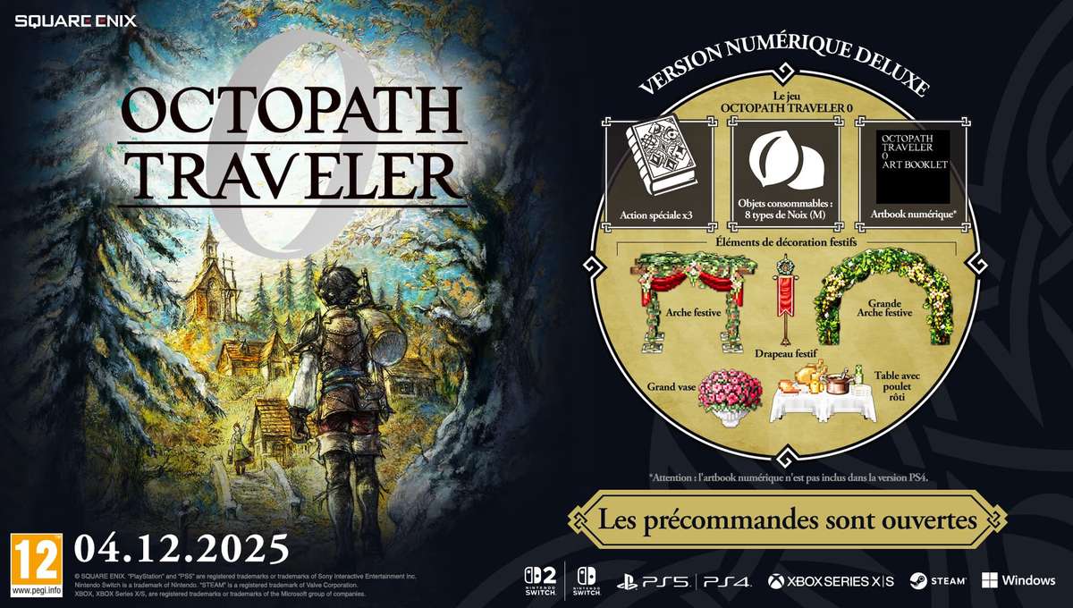 Octopath Traveler 0, le RPG HD-2D de l’équipe Team Asano de Square Enix développé en collaboration avec le studio japonais DOKIDOKI GROOVEWORKS, Inc., est sorti ce 4 décembre 2025 sur Nintendo Switch, Nintendo Switch 2, PlayStation 4, PlayStation 5, Xbox Series et PC via Steam et Microsoft Store. Avant la sortie du jeu, qui se base sur le contenu du jeu Android/iOS Octopath Traveler : Champions of the Continent (jusqu’à la version 2.14 uniquement), une démo a été proposée en téléchargement sur tous les supports. Elle permet de découvrir l’introduction du jeu, qui se déroule après la destruction de la ville natale du protagoniste, et les données de sauvegarde pourront être transférées vers le jeu complet. Dans cette démo, qui offre jusqu’à trois heures de contenu, on peut donc créer notre avatar et on a la possibilité de jouer au prologue et au chapitre 1 des arcs narratifs « Master of Wealth », « Master of Power », « Master of Fame » et « Kindlers of the Flame ». La toute nouvelle fonctionnalité de construction de ville afin de restaurer la ville de Wishvale peut également être essayée. Comme ce dernier, la démo contient uniquement des textes en anglais, japonais, coréen et chinois (simplifié et traditionnel), tandis que les voix sont en anglais et en japonais.