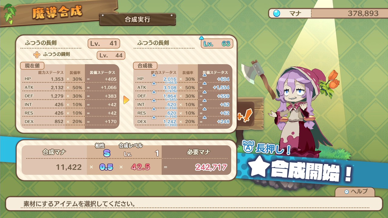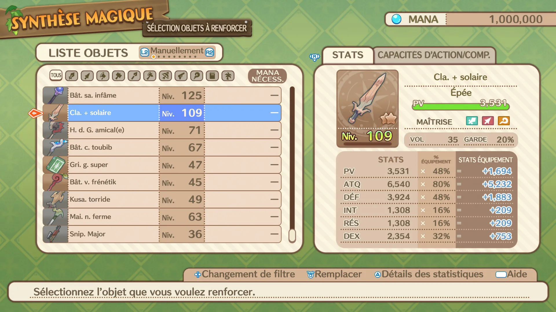 Vous pouvez enforcer un objet en le synthétisant à l’aide de Mana et de matériaux. Quand vous obtenez une nouvelle arme et que vous n’avez plus besoin de celle que vous utilisiez jusqu’alors, utilisez Synthèse. Les PV et autres statistiques de la nouvelle arme seront augmentés, et vous pourrez utiliser cette version améliorée au combat.