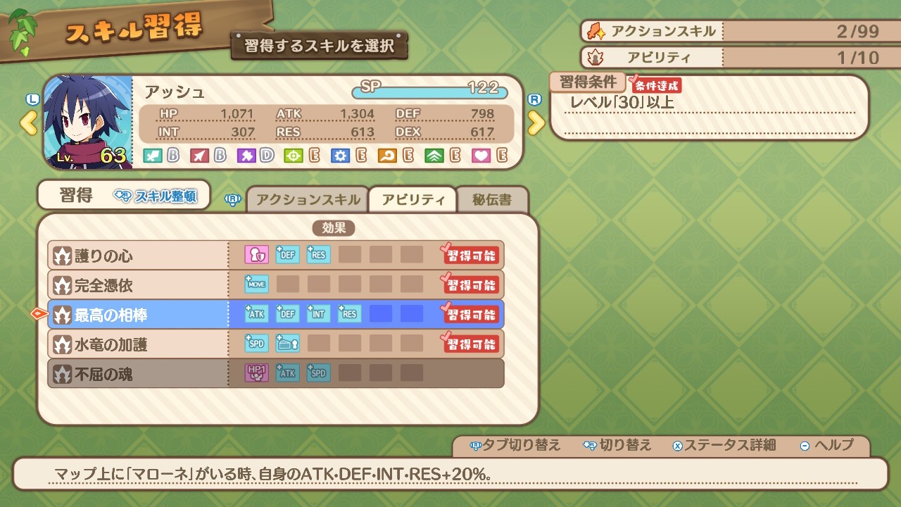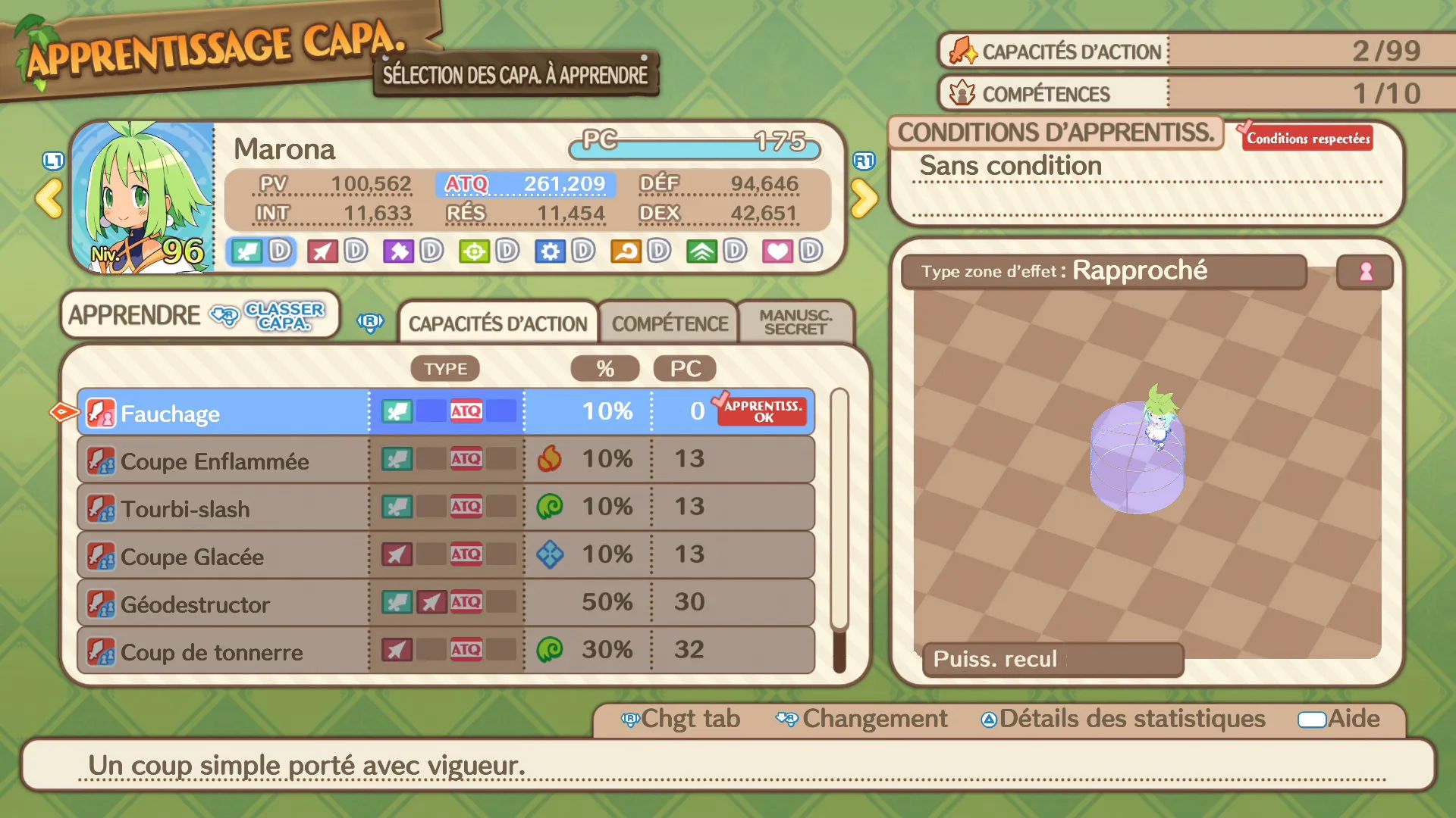 Vous pouvez apprendre des Capacités et des Compétences en remplissant les conditions nécessaires pour les obtenir, puis en les sélectionnant sur l’écran « Apprentissage de Capacités ».
