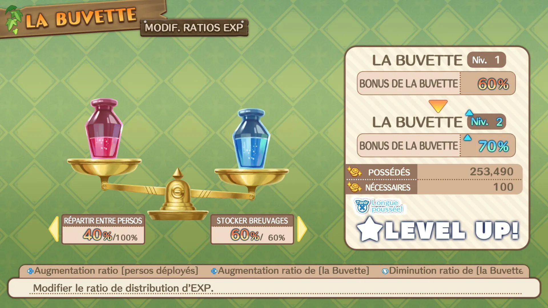 Si vous augmentez le taux d’EXP stockée à la Buvette au-delà de 100 %, les personnages que vous déployez au combat gagneront 0 EXP, mais la quantité d’EXP que recevra la Buvette dépassera 100 % ! Sacrée affaire !