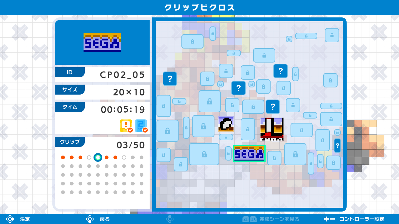 Toujours développé par le studio japonais Jupiter, en charge de tous les jeux Picross depuis la Super Nintendo (hormis quelques exceptions comme les Picross 3D développés par HAL Laboratory), le jeu comprendra 300 puzzles répartis dans les modes Picross et Mega Picross, 150 puzzles dans Clip Picross et 30 puzzles dans Color Picross, pour un total de 480 puzzles. Les développeurs ont choisi de nombreux personnages tirés de 59 jeux SEGA. Voici la liste complète :