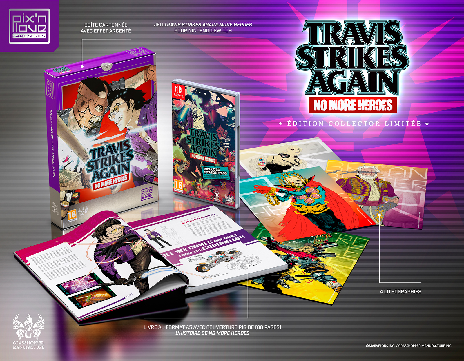 L’édition collector comprendra Travis Strikes Again : No More Heroes (comme pour l’édition standard éditée par Nintendo, la carte de jeu comprendra aussi le Season Pass donnant accès à un personnage supplémentaire, à un nouveau scénario et à un stage inédit, le Season Pass étant également accessible séparément sur l’eShop pour la version dématérialisée au prix de 9,99 €) dans une boîte cartonnée avec couleurs Pantone, un livre de 80 pages illustré en format A5 à propos de la création des deux premiers No More Heroes avec une interview exclusive de Suda51 sur Travis Strikes Again : No More Heroes et 4 lithographies recto/verso d’illustrations réalisées pour le jeu.