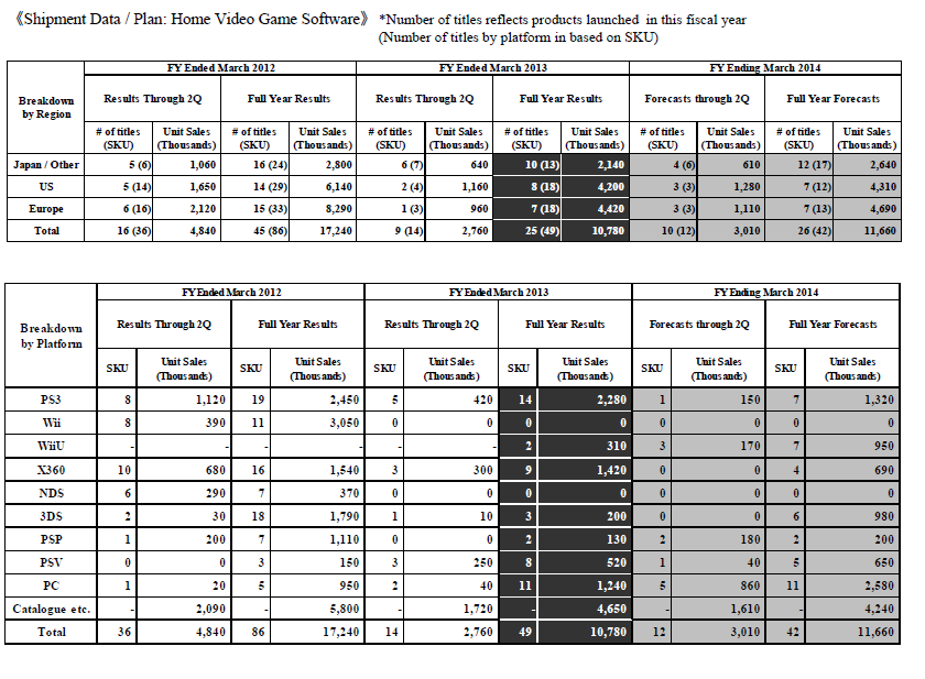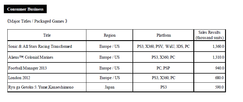 de SKU n’est pas forcément équivalent au nombre réel de titres, comme on peut le voir sur le premier tableau. Il est donc très possible que les jeux en boite et au format dématérialisé soient comptés séparément, ce qui signifierait que SEGA prévoit en fait entre 4 et 7 jeux sur Wii U, et 3 à 6 jeux sur 3DS.