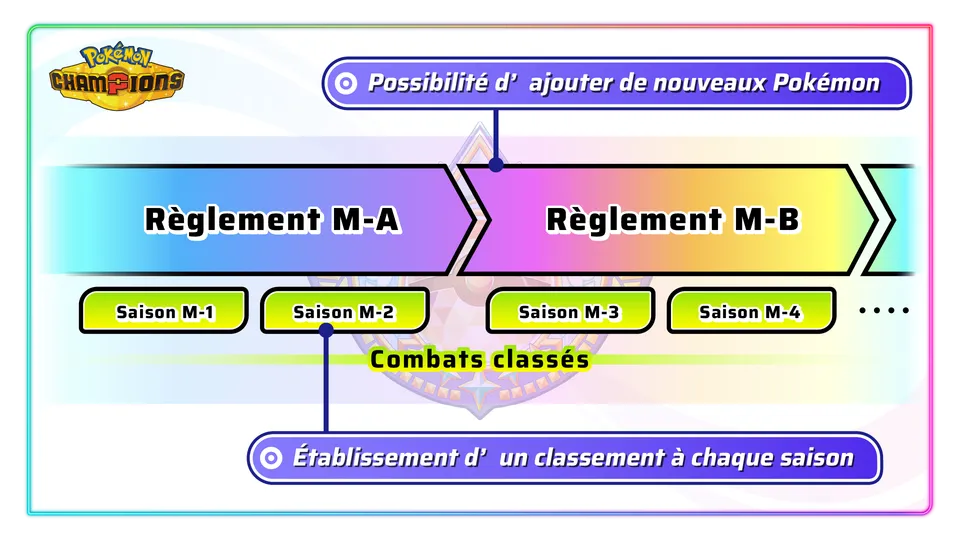 « Les résultats des combats classés seront traités au terme de chaque saison afin de déterminer votre placement, votre rang et vos récompenses saisonnières. Un nouveau règlement entrera en vigueur régulièrement afin de renouveler la méta et tenir les joueurs et joueuses en haleine. Les Pokémon autorisés ainsi que quelques autres paramètres des combats changeront avec chaque nouveau règlement. Qui sait quels Pokémon pourraient soudainement être autorisés à prendre part aux festivités ? »