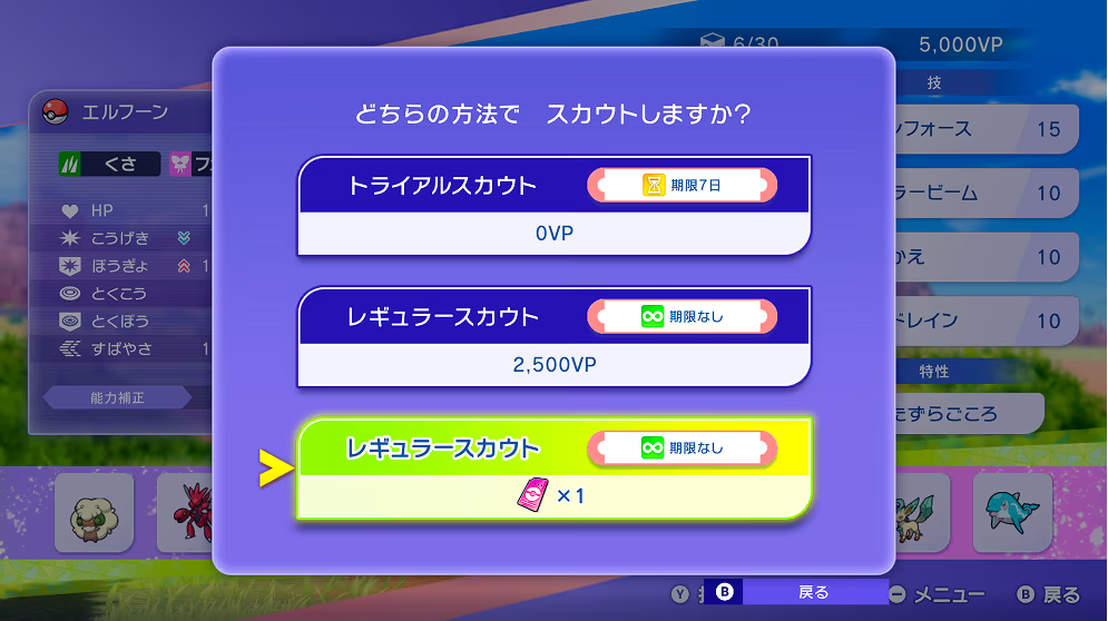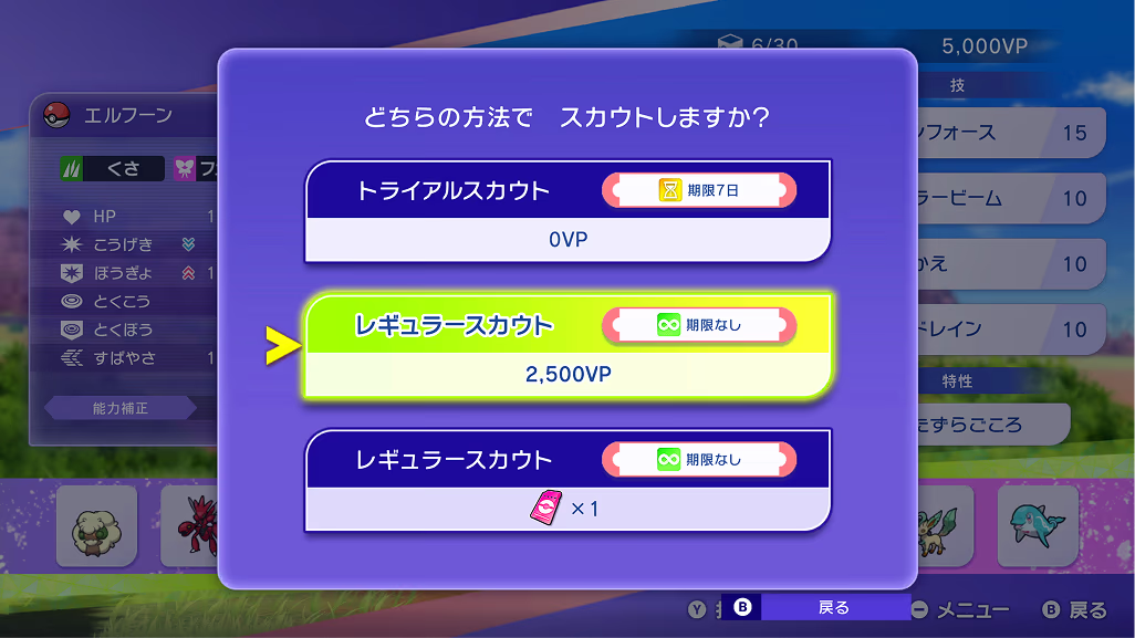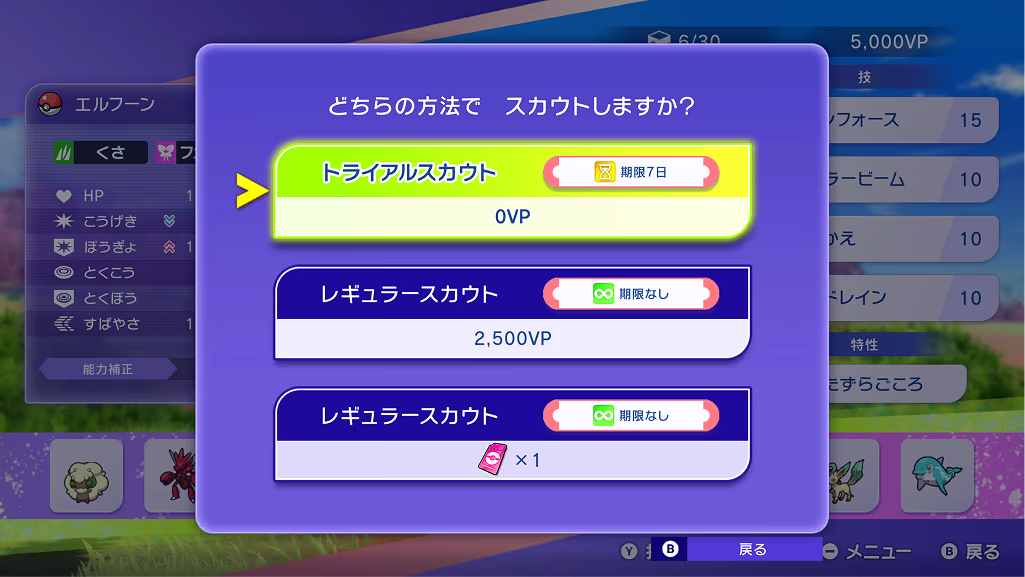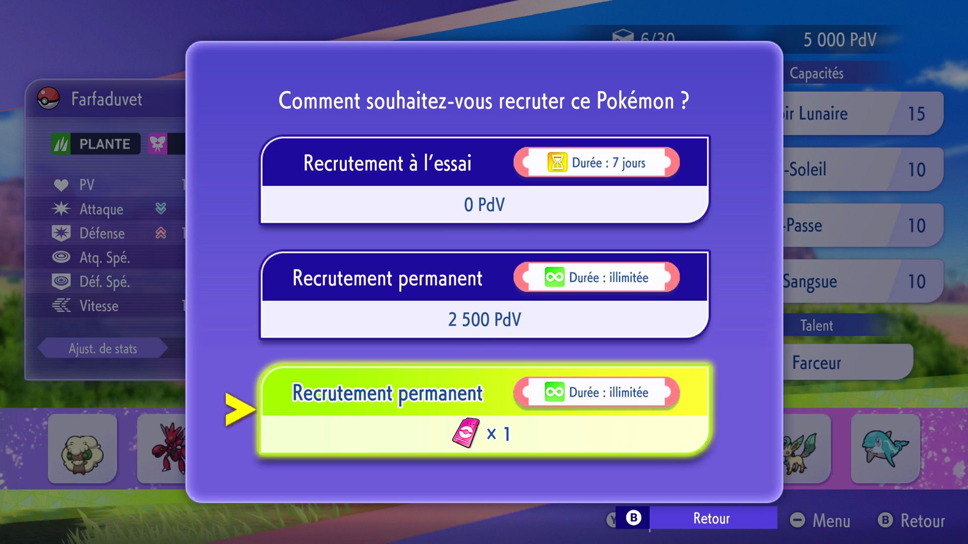 « Ajoutez un Pokémon à votre équipe pendant une période d’essai et combattez avec lui pour découvrir s’il est adapté à votre stratégie. Vous pouvez procéder à un recrutement à l’essai une fois par jour sans dépenser de Points de Victoire (ou PdV). »