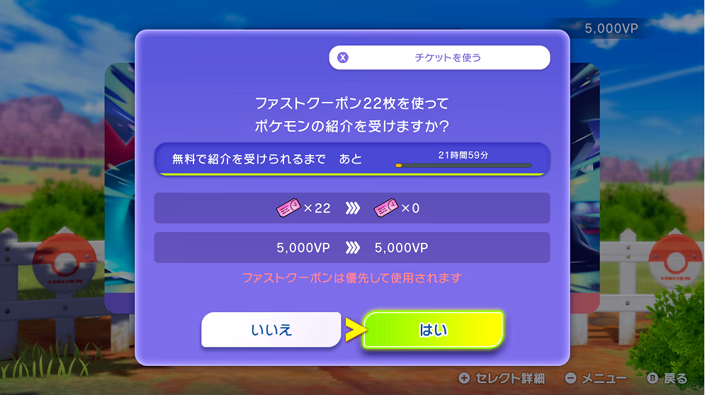 « Vous pouvez également utiliser des tickets plutôt que des PdV pour recruter un Pokémon. Vous pouvez obtenir des Coupons de Vitesse et des Tickets de Recrutement Permanent en remplissant des missions en jeu. Les Coupons de Vitesse permettent de raccourcir d’une heure le temps d’attente entre deux rencontres de Pokémon. Les Tickets de Recrutement Permanent permettent de recruter des Pokémon sans utiliser de PdV. »