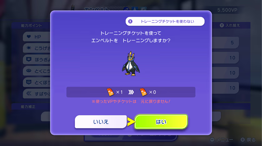 « Façonnez les compétences de votre équipe grâce aux fonctionnalités d’entraînement de Pokémon Champions. En échange de PdV, vous pouvez perfectionner les stats de vos Pokémon, telles que l’Attaque ou la Défense, mais aussi changer leur talent et leurs capacités ! Personnalisez votre équipe afin qu’elle corresponde à votre style de combat ! Notez cependant que vous ne pourrez pas entraîner un Pokémon durant sa période de Recrutement à l’essai. Vous manquez de PdV ? Sachez que vous avez la possibilité d’utiliser des Tickets d’Entraînement pour entraîner vos Pokémon et ainsi réduire à zéro la quantité de PdV nécessaire pour le faire. »