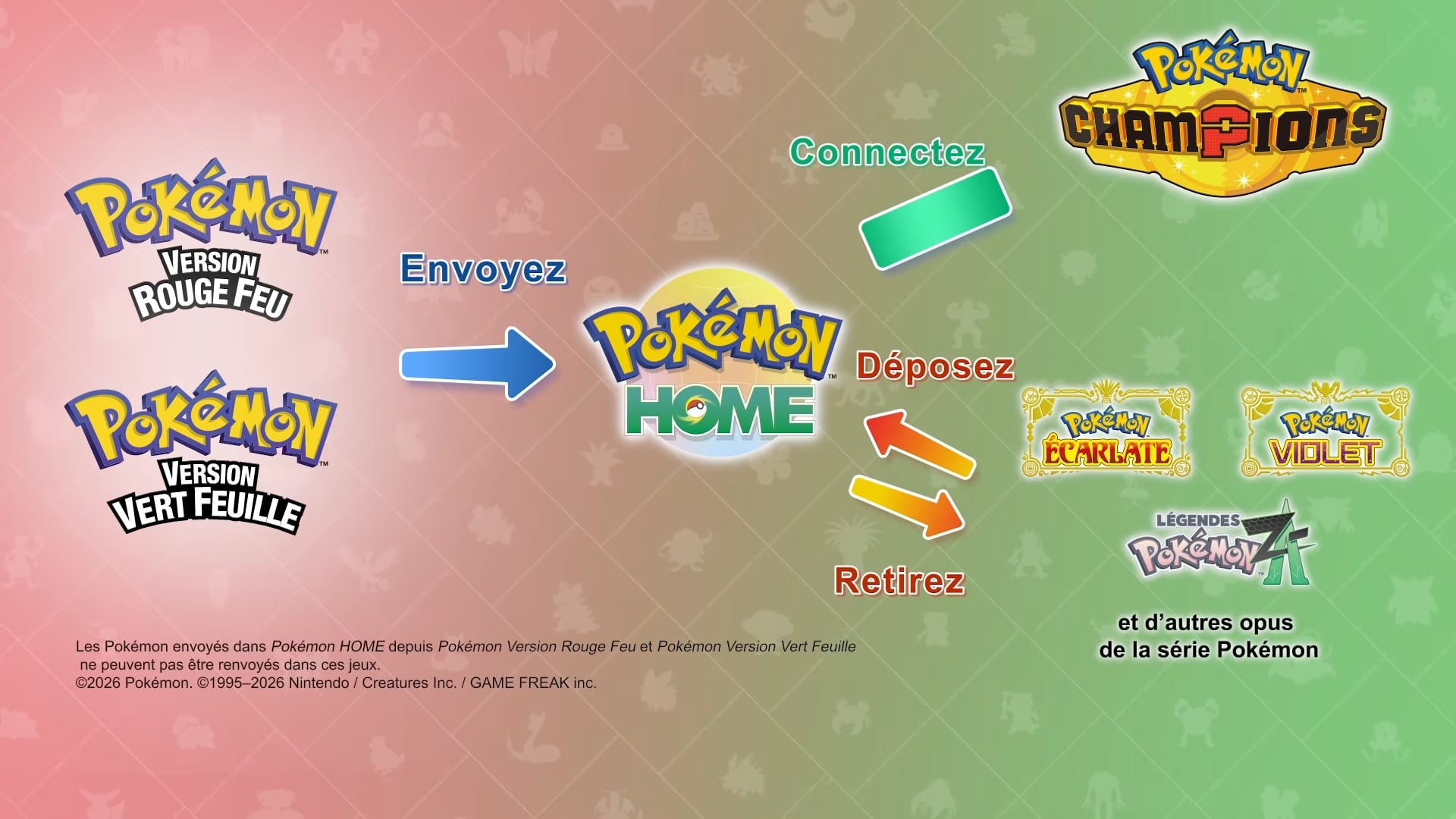 En associant Pokémon Champions et Pokémon HOME, on pourra transférer certains Pokémon vers Pokémon Champions et renvoyer des Pokémon vers Pokémon HOME. Si certaines créatures connaissent des capacités qui ne peuvent pas être utilisées dans Pokémon Champions, on devra les entraîner pour leur enseigner d’autres capacités. Si l’on entraîne des Pokémon dans Pokémon Champions et qu’on les renvoie vers Pokémon HOME, ils conserveront les résultats de leur entraînement une fois revenus dans Pokémon Champions, à condition qu’ils reviennent sous la même forme. Seules les espèces de Pokémon présentes dans Pokémon Champions pourront être envoyées vers ce jeu depuis Pokémon HOME. De plus, les Pokémon obtenus dans Pokémon Champions ne pourront pas être envoyés vers Pokémon HOME.